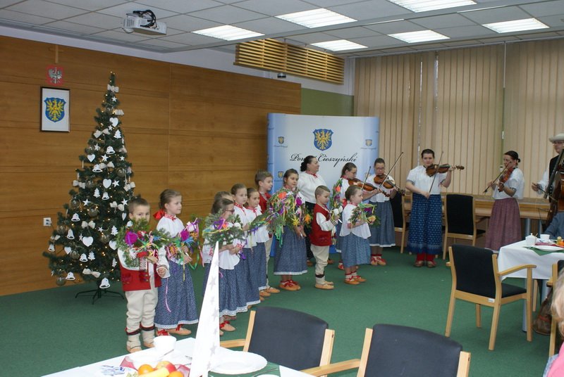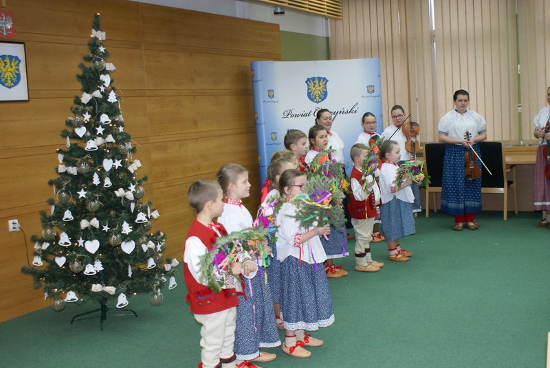 Młodzi artyści pod kierunkiem pani Aleksandry Lipowskiej oraz pani Urszuli Gruszki przy wsparciu pani Marii Motyki i pana Józefa Łupieżowca wykonali kolędy i pastorałki charakterystyczne dla naszego regionu. Potem było płazowanie i wręczenie pięknych połaźniczek włodarzom powiatu i województwa. Wszyscy artyści otrzymali gromkie brawa i… upominki.