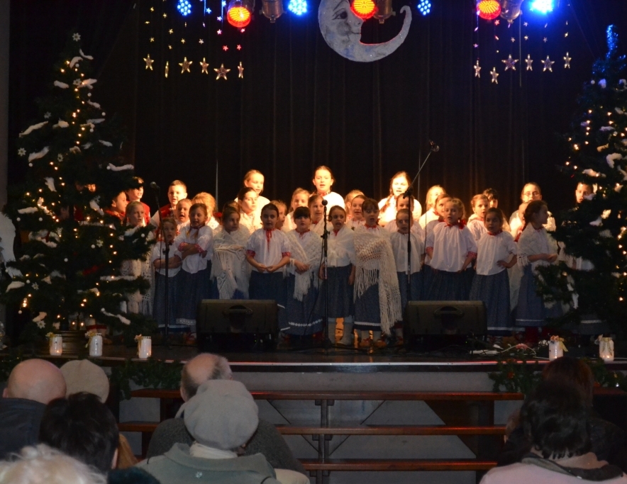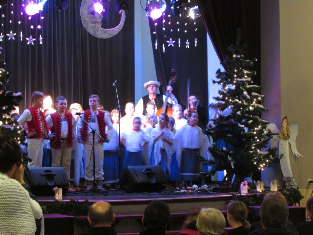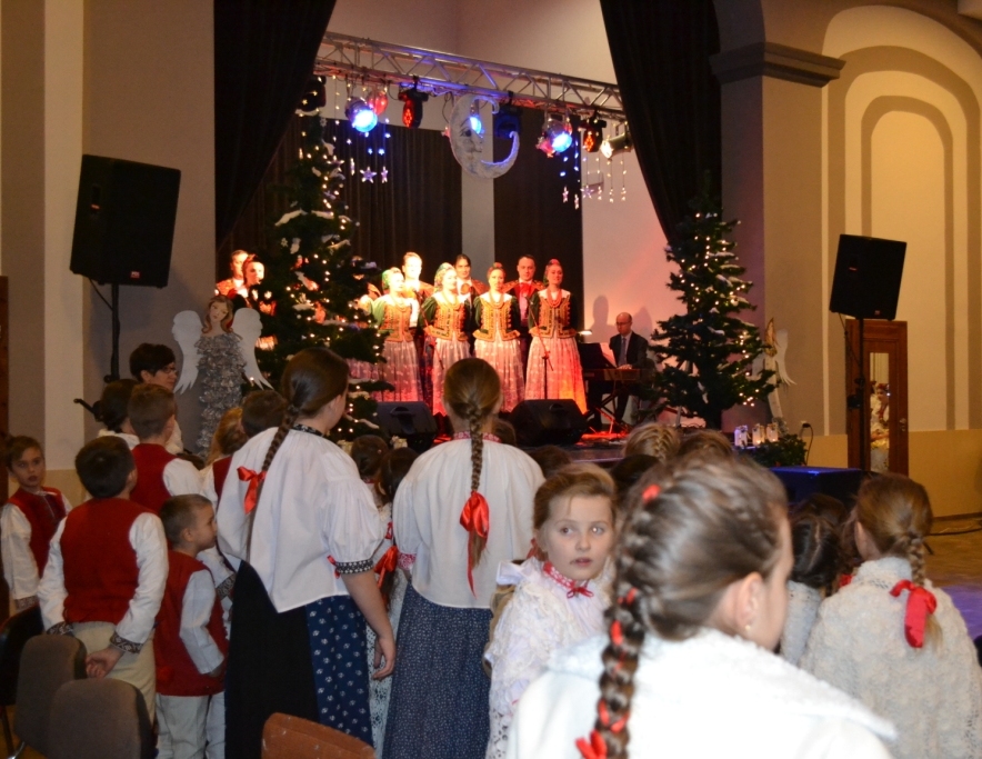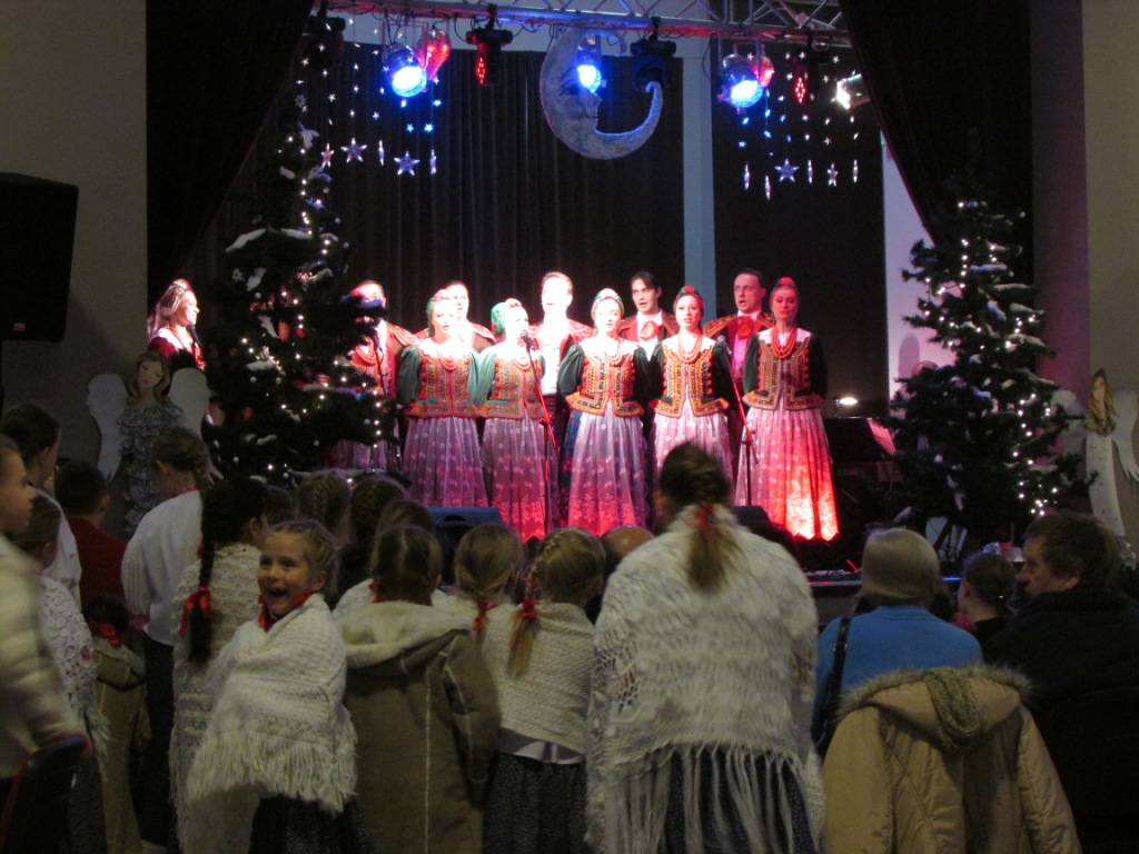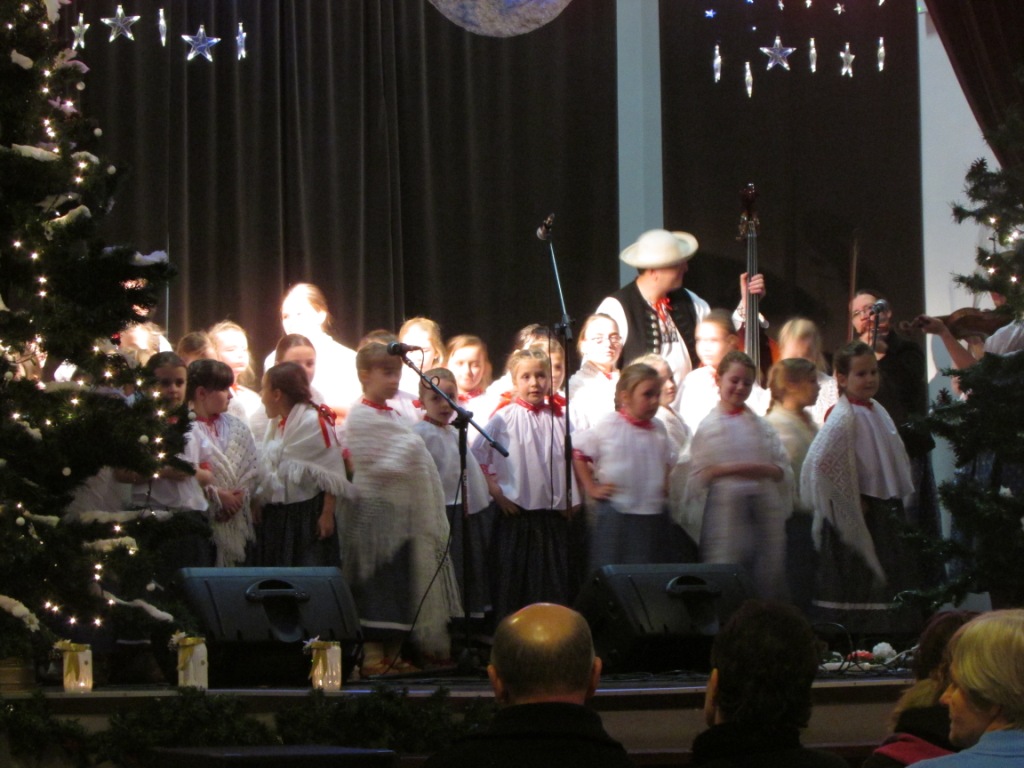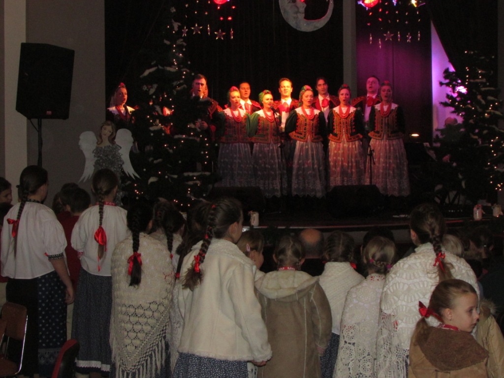 W sobotę 7 stycznia dzieci z „Małej Istebnej” wystąpiły podczas śląsko-góralskiego kolędowania w Tworogu. Na samym początku zaprezentował się jeden z najbardziej znanych zespołów artystycznych- Zespół Pieśni i Tańca „Śląsk”. Swoja działalność rozpoczął w 1953 roku. Od tego czasu pokazuje niezwykły kunszt artystyczny, wzbudza podziw i uznanie wśród odbiorców. Ponad stuosobowy skład obejmuje chór, balet i orkiestrę. Zespół koncertował na pięciu kontynentach świata, a co roku daje ponad 120 koncertów. Podczas śląsko-góralskiego wystąpiła tylko część artystów przedstawiając repertuar kolędowy. Zaraz po nich na scenę weszły dzieci z „Małej Istebnej”. Było to dla nich niezwykłe przeżycie móc występować na wspólnej scenie z jednym z najlepszych zespołów w Polsce. Młodzi artyście zaprezentowali góralskie pastorałki oraz polskie kolędy. Nie mogło zabraknąć również tradycyjnego powiynszowanio z połaźniczkóm. Swoim występem urzekli widzów za co otrzymali gromkie brawa.