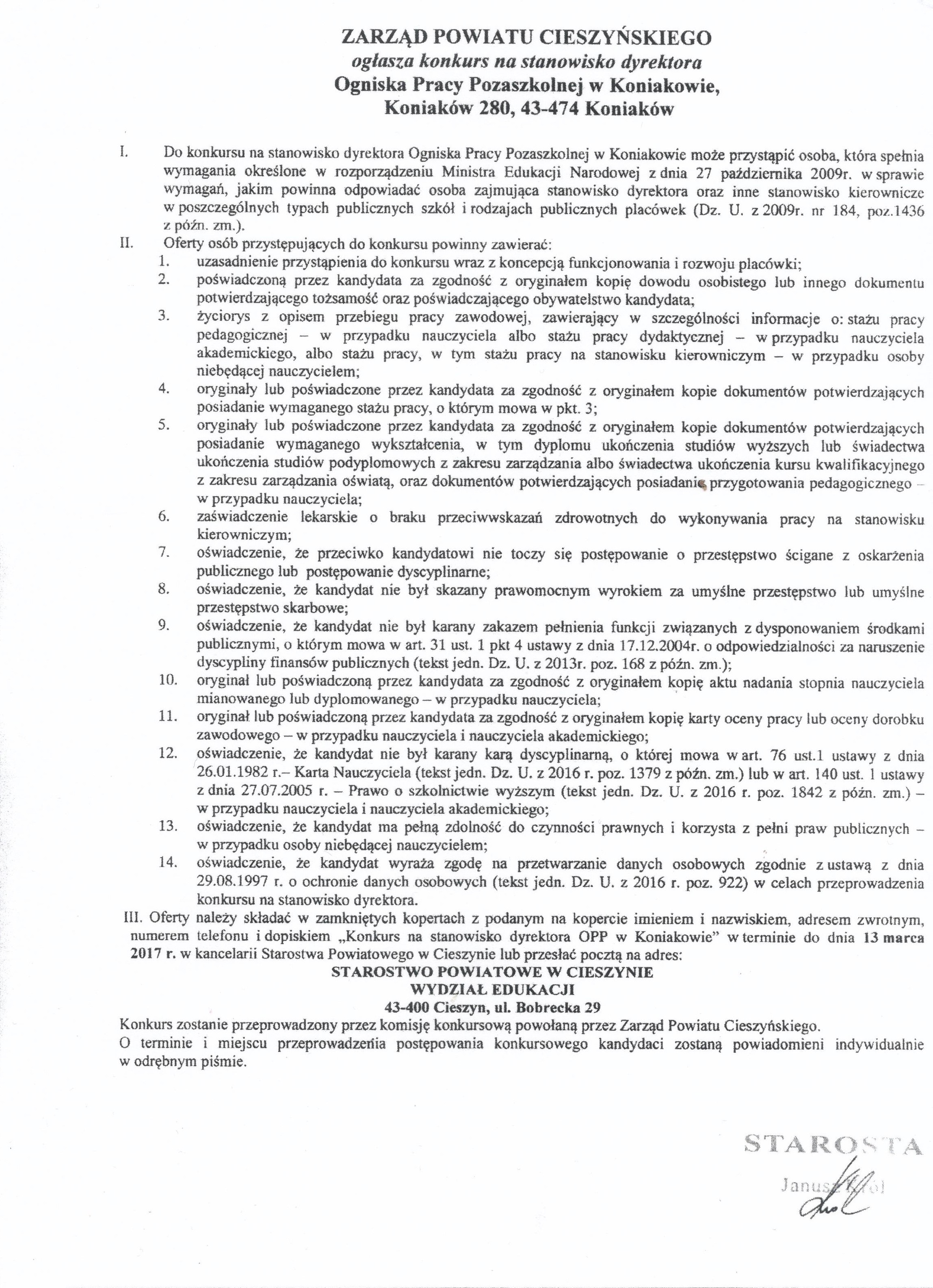Zarząd Powiatu Cieszyńskiego ogłasza konkurs na stanowisko dyrektora Ogniska Pracy Pozaszkolnej w Koniakowie. Szczegóły w załączniku.