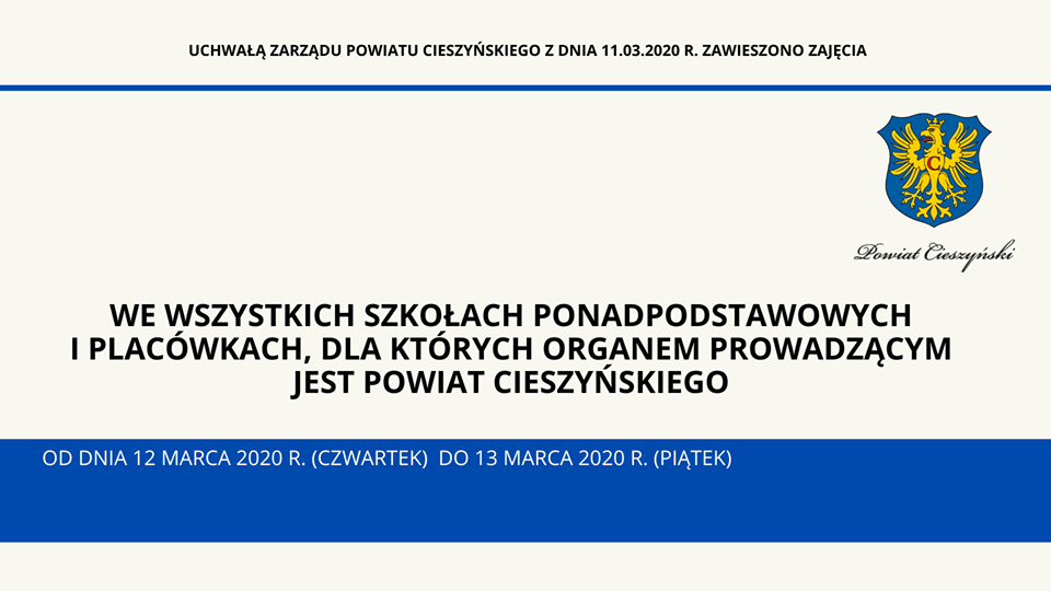 馃搷 W zwi膮zku z pojawieniem si臋 koronawirusa na terenie powiatu cieszy艅skiego Uchwa艂膮 Zarz膮du Powiatu Cieszy艅skiego z dnia 11.03.2020 r., zosta艂y zawieszone zaj臋cia w szko艂ach ponadpodstawowych i placówkach prowadzonych przez Powiat Cieszy艅ski.