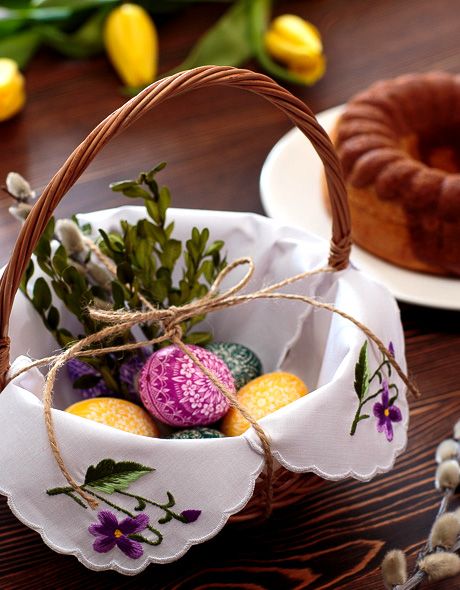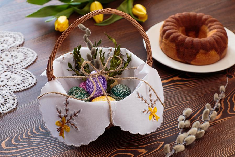 Wyhaftowany element przyszywamy na białą serwetkę, którą ułożycie na koszyku ze święconką.