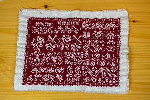 Na dzisiejszych zajęciach postanowiłam Wam przybliżyć trochę historii haftu beskidzkiego. Hafty górali śląskich zdobią stroje. Wyszycia te są jedyne tego rodzaju w całej Polsce. Jak ostatnio wspomniałam ich cechą jest to, że rzędy ściegów stanowią tło haftu, a motywy(wzory) tworzą nie pokryte wyszyciem partie tkaniny. I tak, w ubiorze męskim hafty były najczęściej brązowe z niewielkimi elementami czarnymi i czerwonymi, był to tzw. znak na koszuli męskiej,mankiety oraz zoniedrze. Natomiast w stroju dziewczęcym i młodych kobiet był haft czerwony a kobiety starsze- miały czarne. Ozdabiano w nim czyli w kabotku kołnierzyk - obójka oraz mankiety- lemieczki. Warto wiedzieć że: