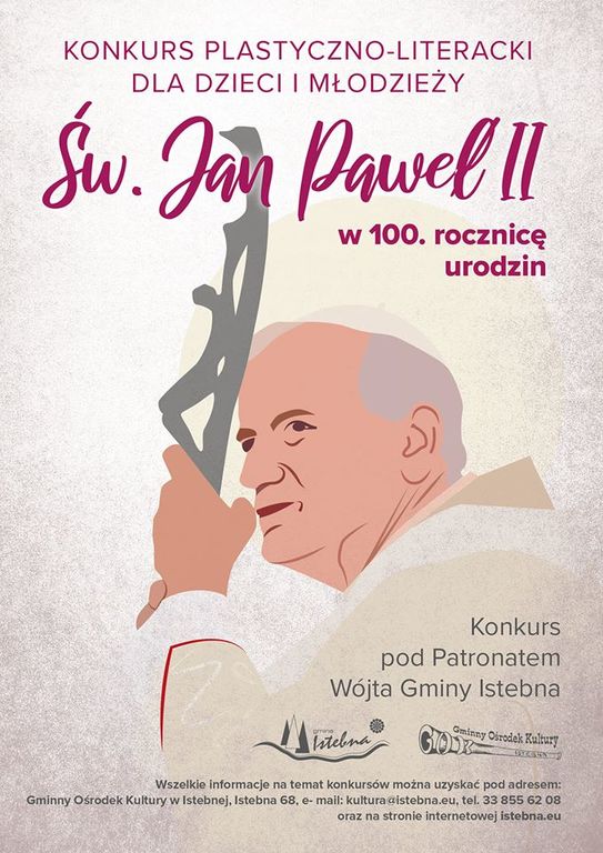 Łucja Michałek- Wójt Gminy Istebna oraz Gminny Ośrodek Kultury serdecznie zapraszają dzieci i młodzież z terenu gminy Istebna do udziału w KONKURSIE plastyczno-literackim pt. “ Święty Jan Paweł II w 100. rocznicę urodzin“. ZAPRASZAMY!