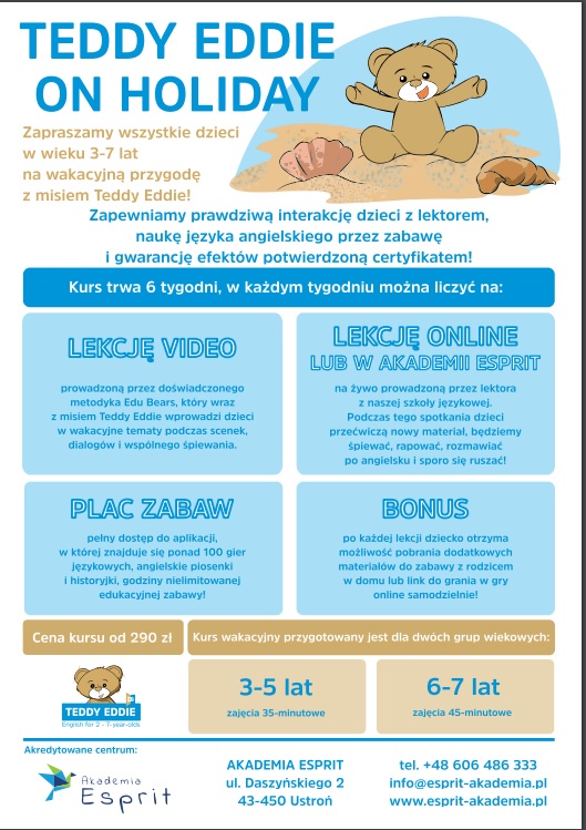 Spotkania s膮 pe艂ne humoru, w typowo wakacyjnym klimacie! Dzieci b臋d膮 艣piewa膰, bawi膰 si臋, rozmawia膰 - i uczy膰 si臋 j臋zyka angielskiego! Lekcje online pozwalaj膮 wzi膮膰 udzia艂 w kursie z dowolnego miejsca na ziemi!