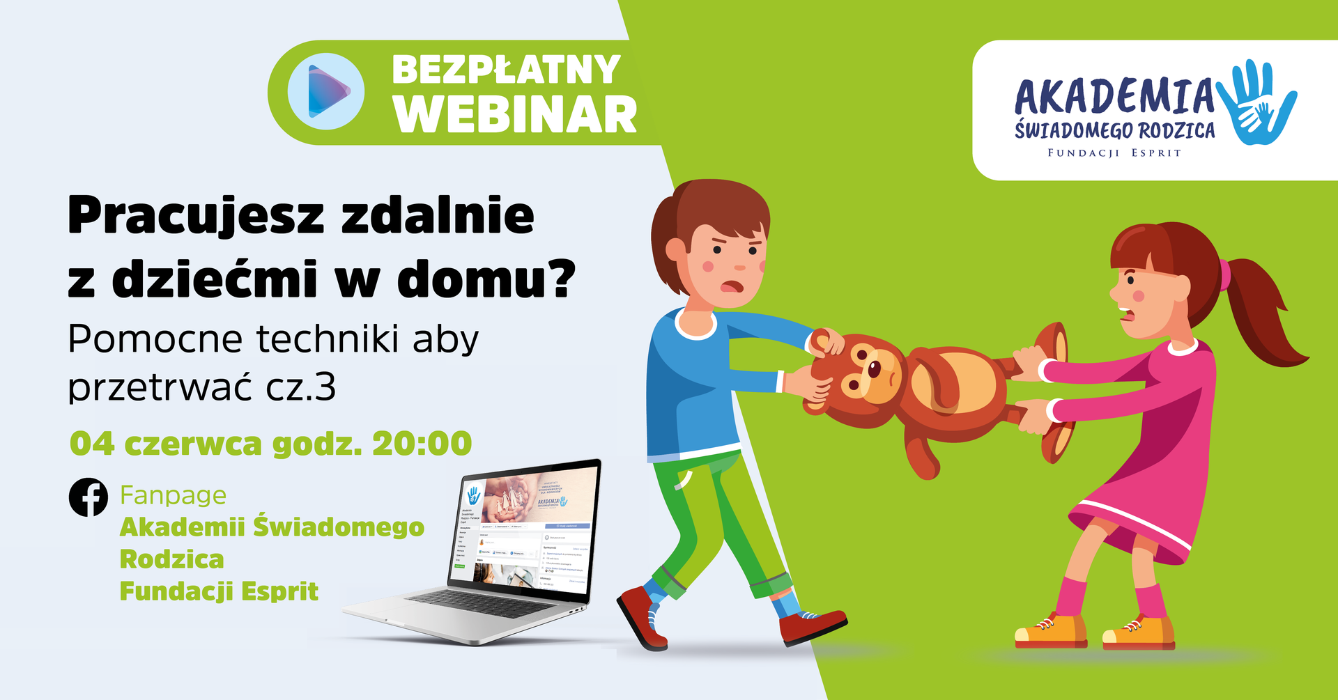 Kliknij „zainteresowany/a” lub „wezmę udział”, a w dniu webinaru otrzymasz przypomnienie i bądź z nami w czwartek 04.06.2020 o godzinie 20:00 na fanpage Akademia Świadomego Rodzica Fundacji Esprit.