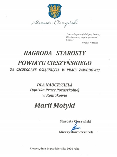 Z wielką radością informujemy, że nasza koleżanka i współpracownica Maria Motyka otrzymała Nagrodę Starosty Cieszyńskiego za szczególne osiągnięcia w pracy zawodowej
