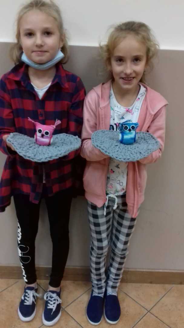 Z różnych grubości szydełka (heknadli) i nici można uheklować nie tylko koronki (rózićki), Roksana i Oliwia prezentują wykonane przez siebie sowy🦉🦉🦉 i podstawki ze sznurka.🧶🧶🧶