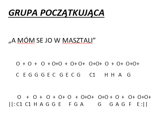 Dzi艣 wprowadzenie linii basowej dla grupy pocz膮tkuj膮cej w utworze "A MÓM SE JO W MASZTALI" a ju偶 jutro na 艣rodowe zaj臋cia filmik ca艂o艣ci tego nr plus linia basowa dla grupy zaawansowanej i propozycje obiegników oraz akompaniamentu