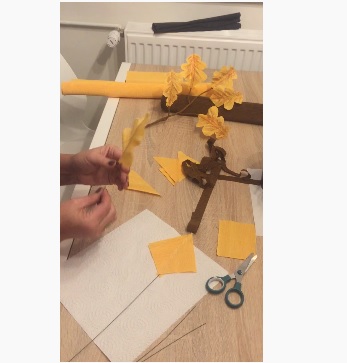 Na dzisiejszych zajęciach koła bibułkarskiego będziemy tworzyć wspólnie jesienną gałęź z liśćmi dębu. Do jej wykonania potrzebować będziecie: