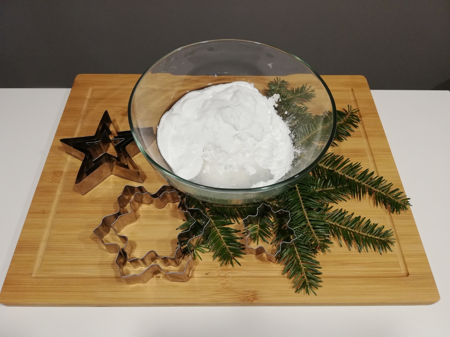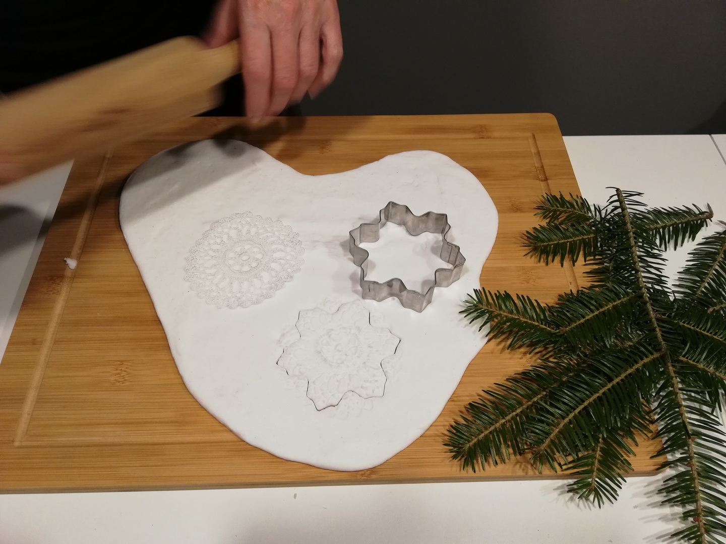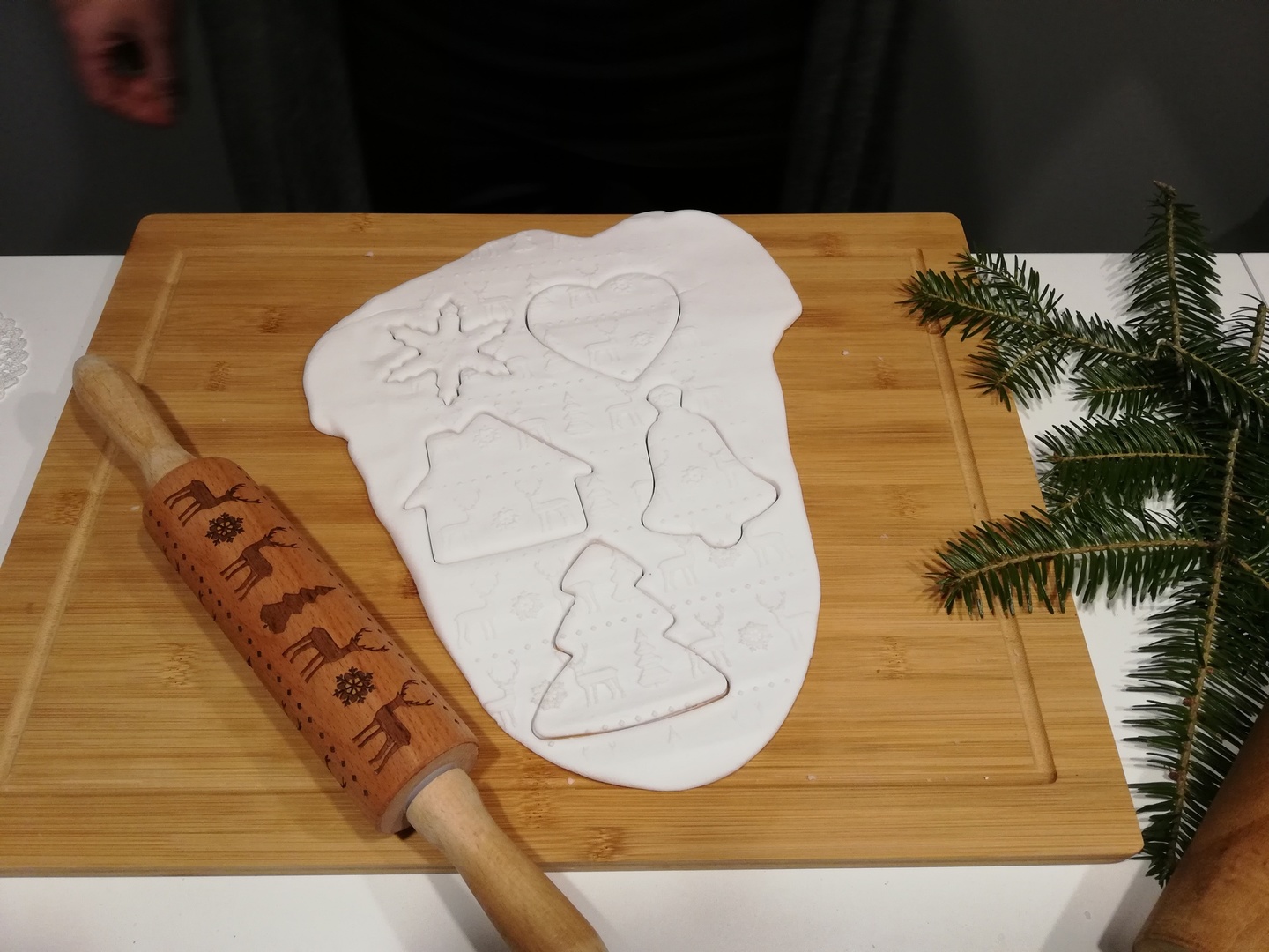 Wszystkie składniki musimy dokładnie ze sobą wymieszać. Jest to bardzo ważne, bo od starannego wyrobienia zależy to czy masa będzie gładka i czy po wyschnięciu nie będzie na niej pęknięć. Wyrobioną masę rozwałkowujemy na grubość około 4 mm, następnie odciskamy wzory wedle upodobań.