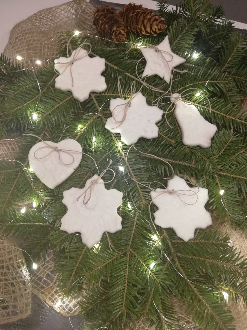 Wbrew pozorom znalezienie tego jedynego przepisu, gdzie masa po wyschnięciu nie będzie pękać wcale nie jest takie proste. Swój przetestowałam i mogę go Wam polecić…Ozdoby po wyschnięciu nie pękają, są pięknie, śnieżnobiałe i robi się je naprawdę szybko i łatwo. Plusem masy porcelanowej jest to, że pracuje się w niej naprawdę dobrze. Nie przywiera i nie klei się. Dobrze odciska się w niej najdokładniejsze szczegóły, takie jak serwetkę, koronkę, wzór umieszczony na wałku, wełniany sweterek itp.