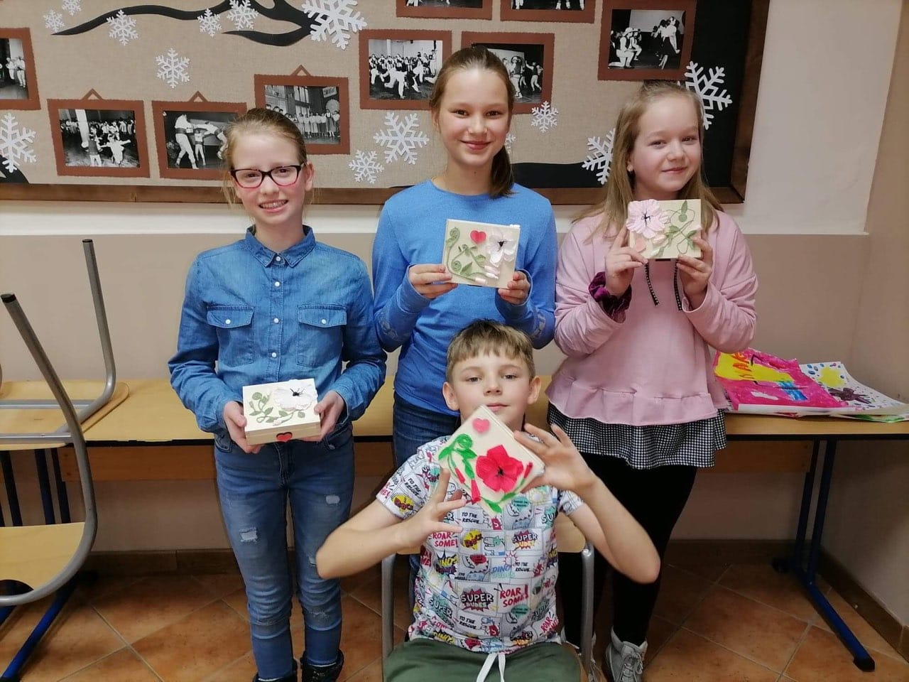 Ozdobne pudełka wykonane podczas zajęć koła bibułkarskiego prowadzonego przez Panią Grażynę Haratyk