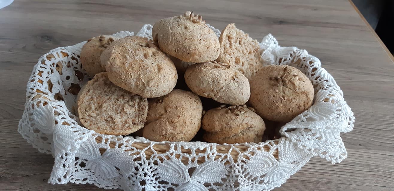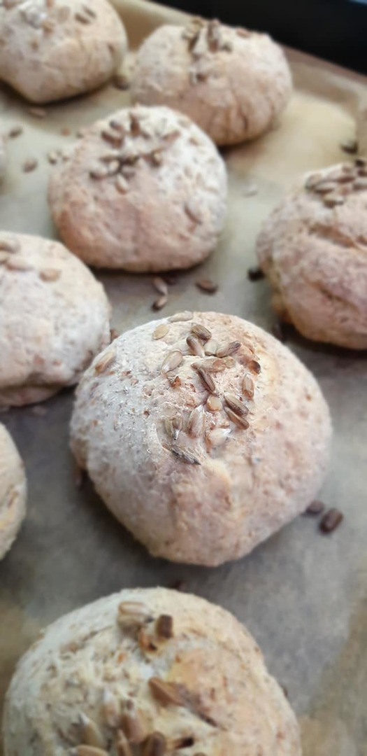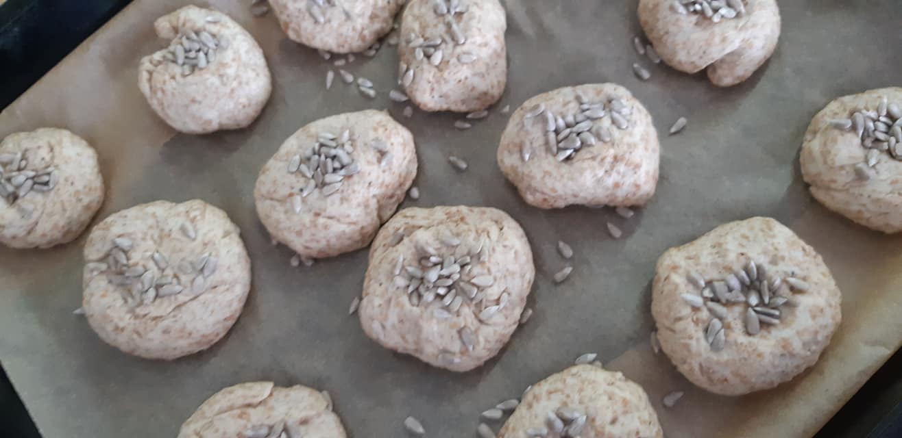 Ręce naśladować oliwa z oliwek aby lepiej się formowalo. Bułeczki dekorujemy ziarnami słonecznika lub pestkami dyni