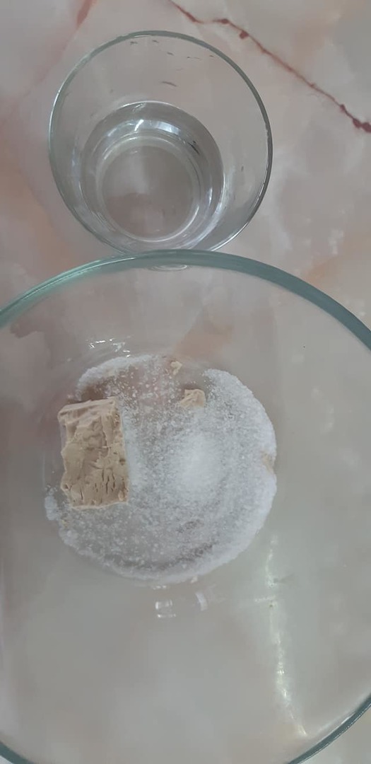 1. Drożdże kruszymy do miski, dodajemy łyżeczkę cukru i wlewamy 50 ml ciepłej wody. Zaczyn mieszamy, przykrywamy bawełnianą ściereczką i odstawiamy do spienienia w ciepłe miejsce.