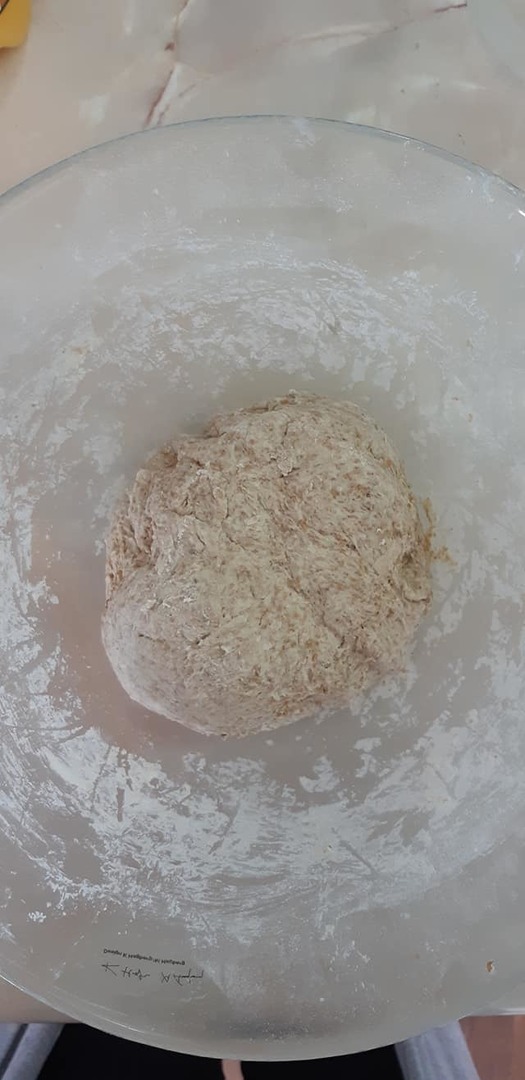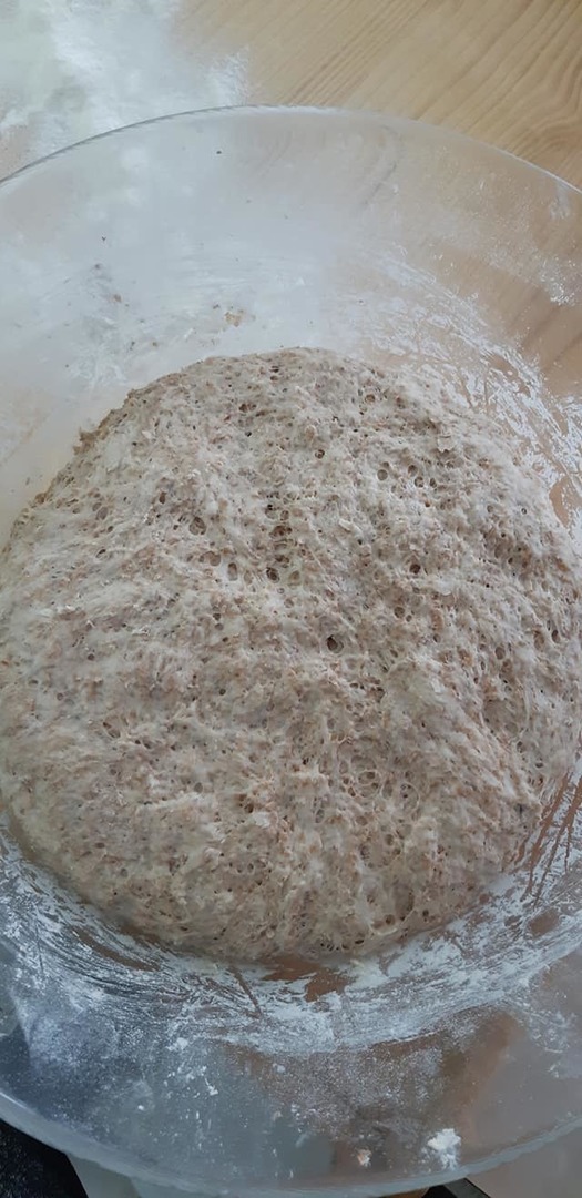 2. Mąkę, sól, oliwę z oliwek i resztę cieplej wody mieszamy w drugiej misce . Dodajemy zaczyn i wszystko dokladnie wyrabiamy do momentu aby ciasto odklejalo się od tak i ścianek miski. Jeśli ciasto dalej będzie się kleić należy dodać jeszcze mąki. Przykrywamy ściereczką i odstawiamy do wyrośnięcia w ciepłe miejsce na ok 30 min