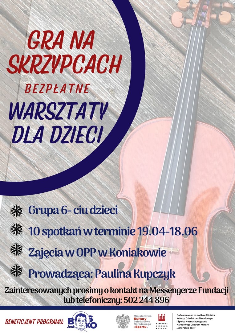 Dzięki dofinansowaniu z Narodowego Centrum Kulturyw ramach programu #EtnoPolska2021 Fundacja jest BOSKO będzie organizowała cykl warsztatów gry na skrzypcach dla dzieci Warsztaty skierowane są do grupy 6 dzieci w wieku od 7 do 12 lat zamieszkujących terenie Gmina Istebna Zajęcia prowadzić będzie doświadczona instruktorka, utalentowana skrzypaczka Paulina Kupczyk Cykl zajęć potrwa od 19.04 do 18.06, a odbywać się one będą w pomieszczeniach Ognisko Pracy Pozaszkolnej w Koniakowie - partnera projektu