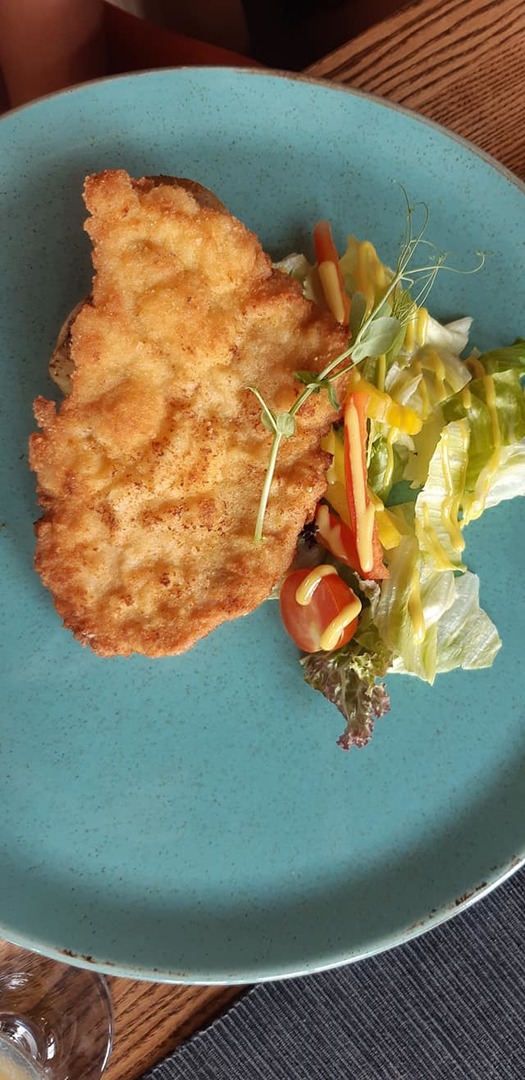 kotlet schabowy z grzybkami z ziemniaków i sałatką z dipem