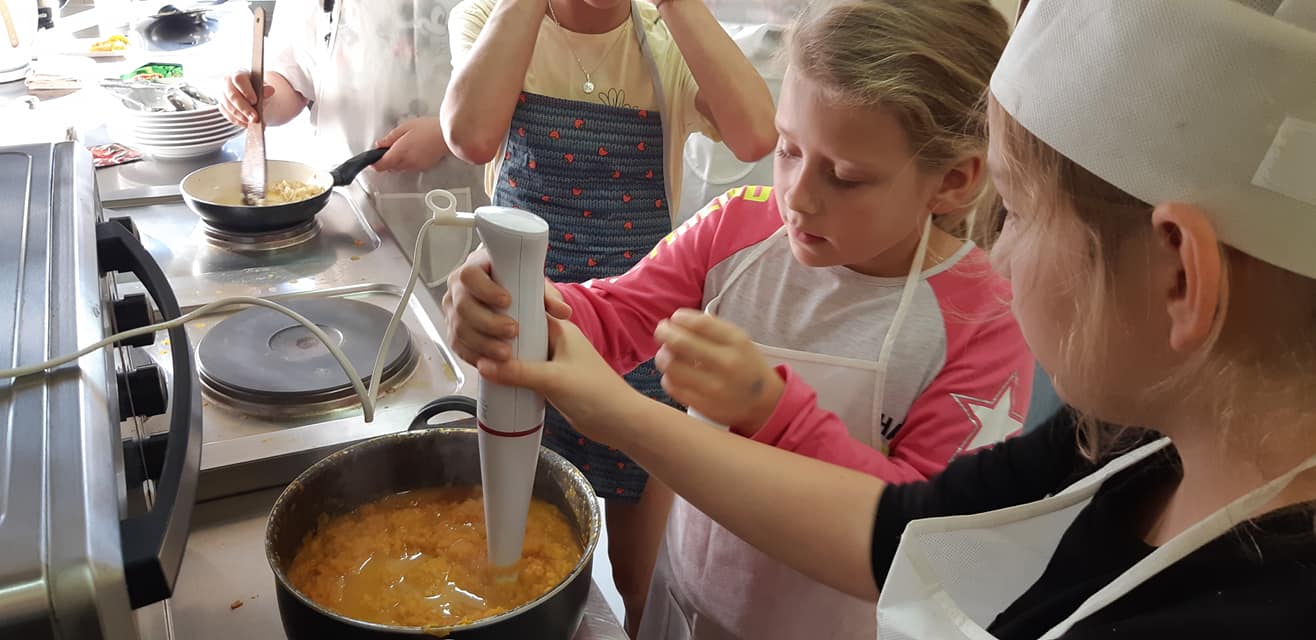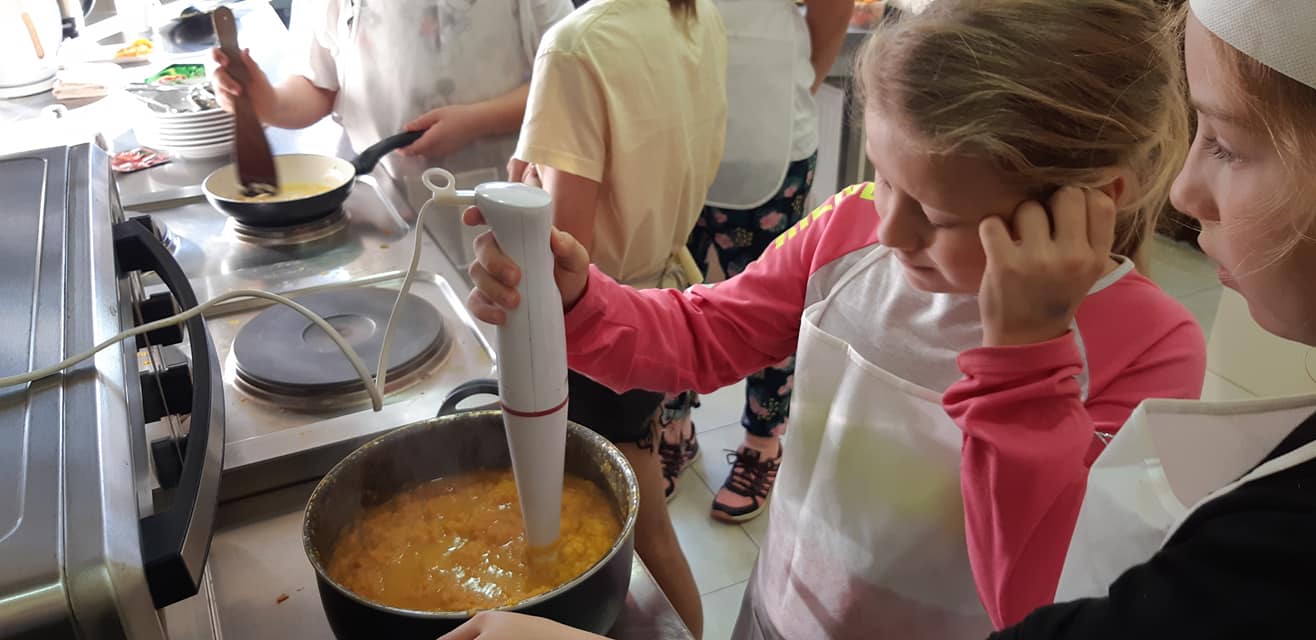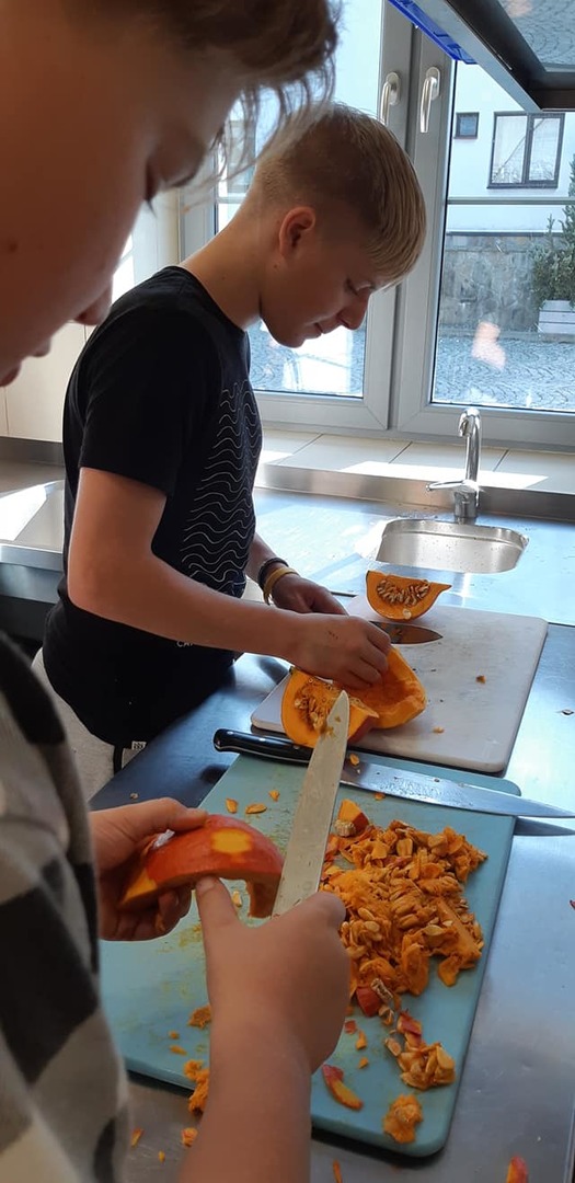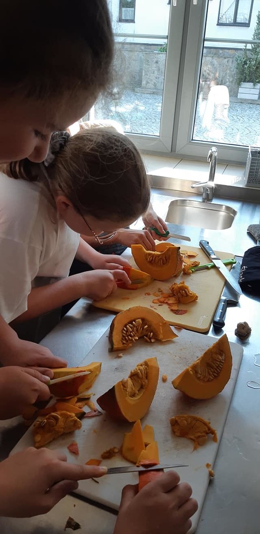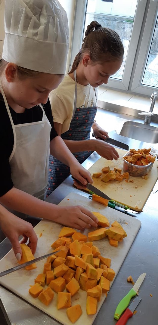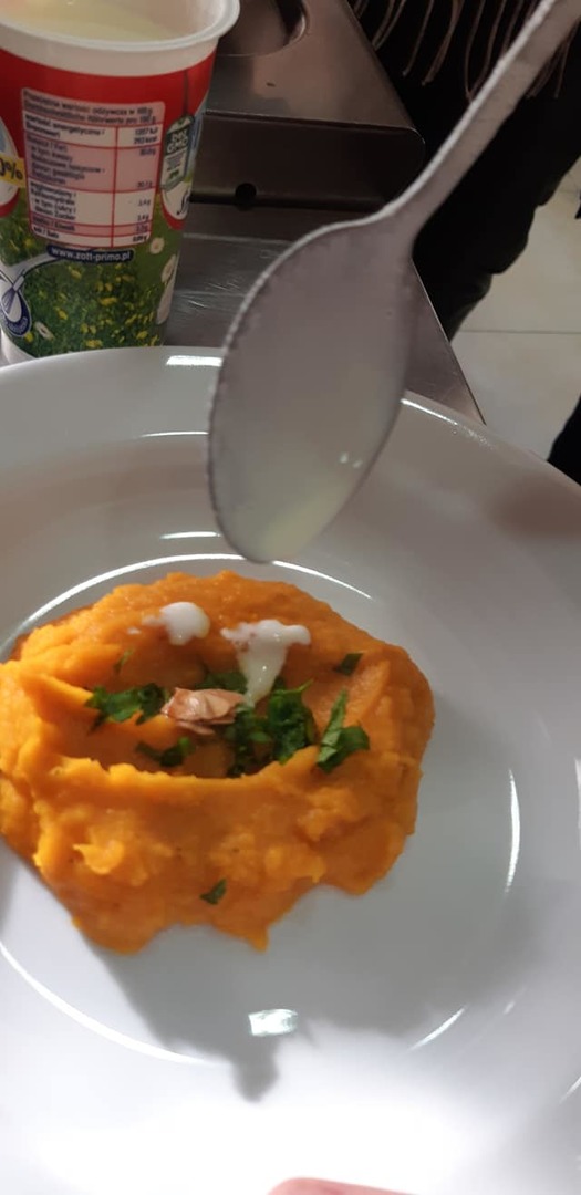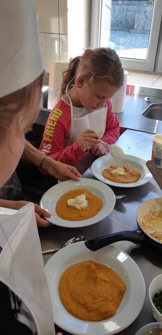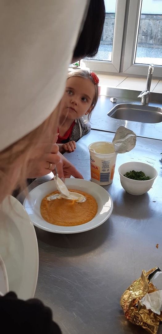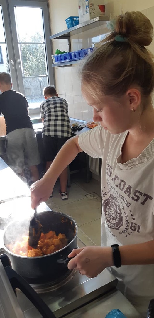 zarówno grupa m艂odsza jak i starsz膮 przygotowa艂y krem z dyni z pra偶onymi migda艂ami