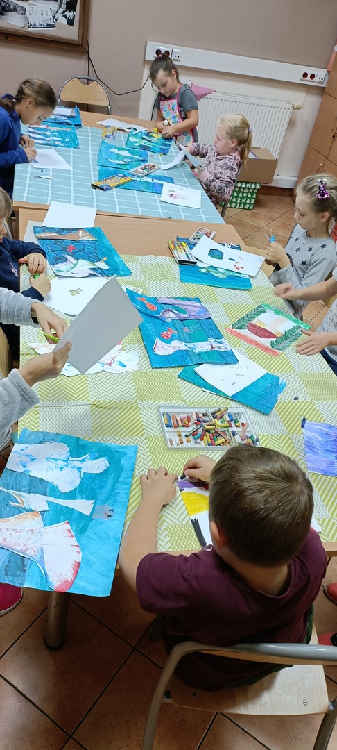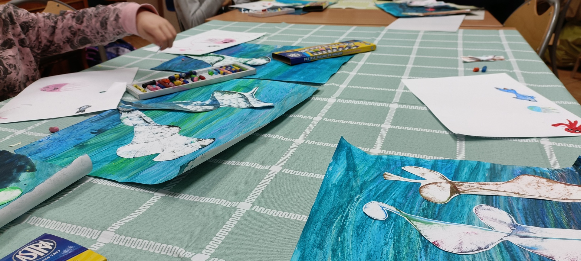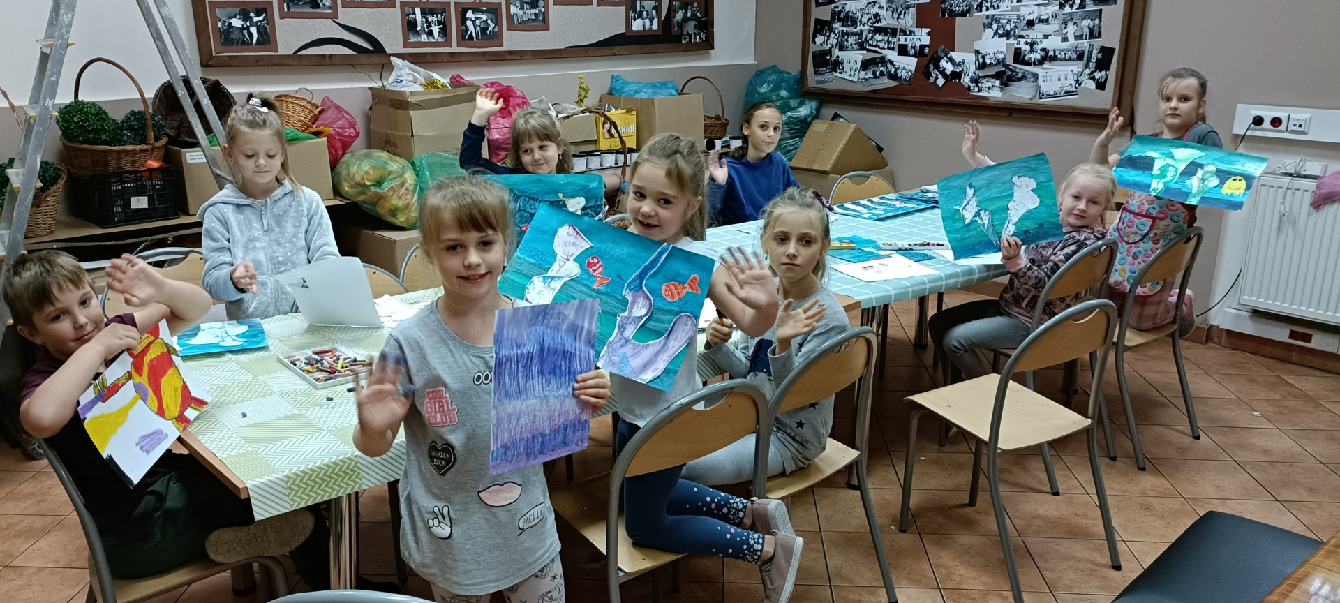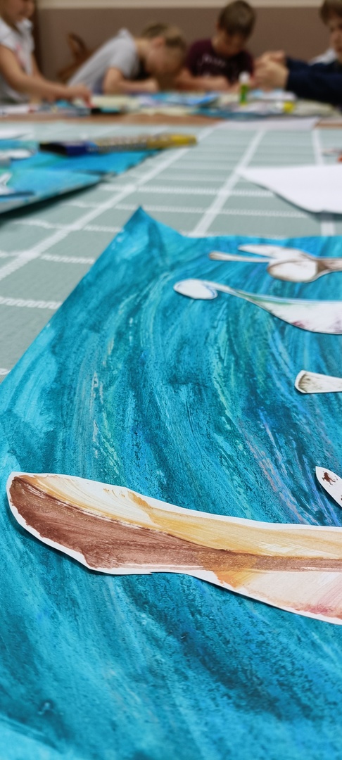 Tematem pracy była głębina, która powstawała przez 3 kolejne spotkania! Najpierw baza z pasteli olejnych i farb wodnych, następnie nicią i sznurkiem malowana roślinność, na koniec przeróżne żyjątka podwodne