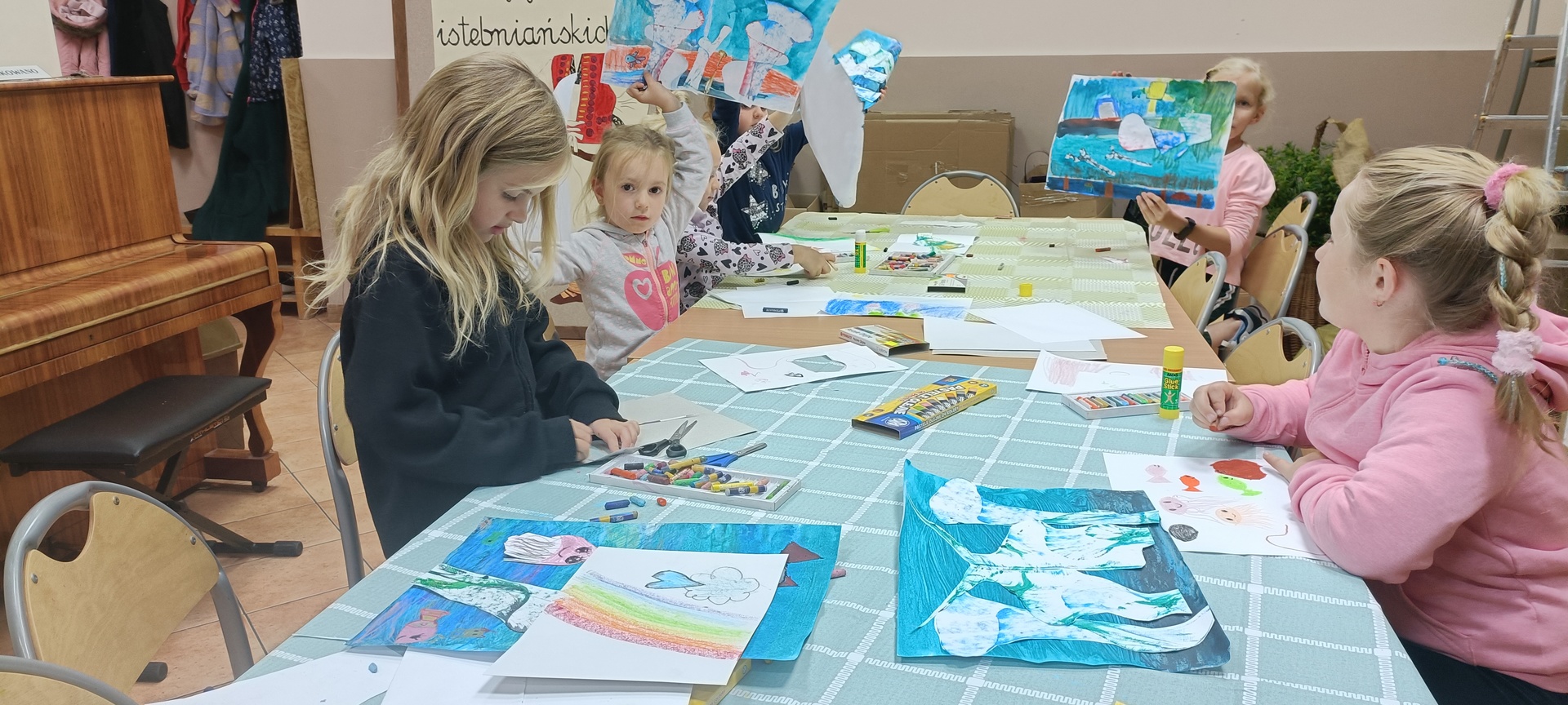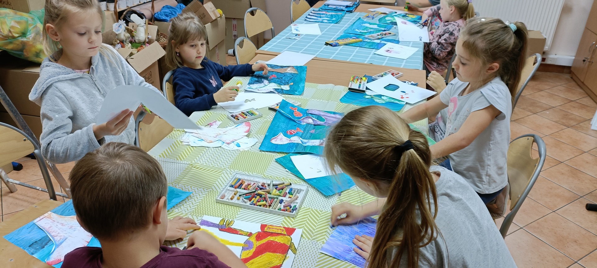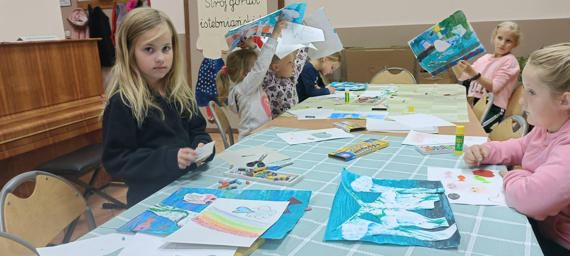 Tematem pracy była głębina, która powstawała przez 3 kolejne spotkania! Najpierw baza z pasteli olejnych i farb wodnych, następnie nicią i sznurkiem malowana roślinność, na koniec przeróżne żyjątka podwodne
