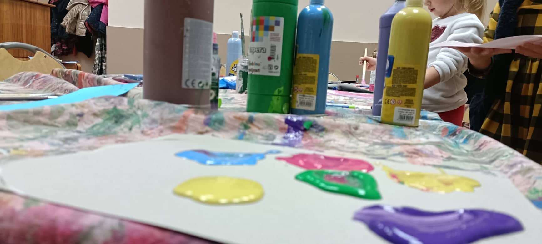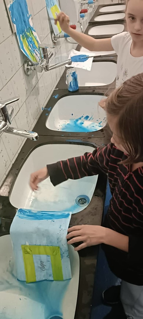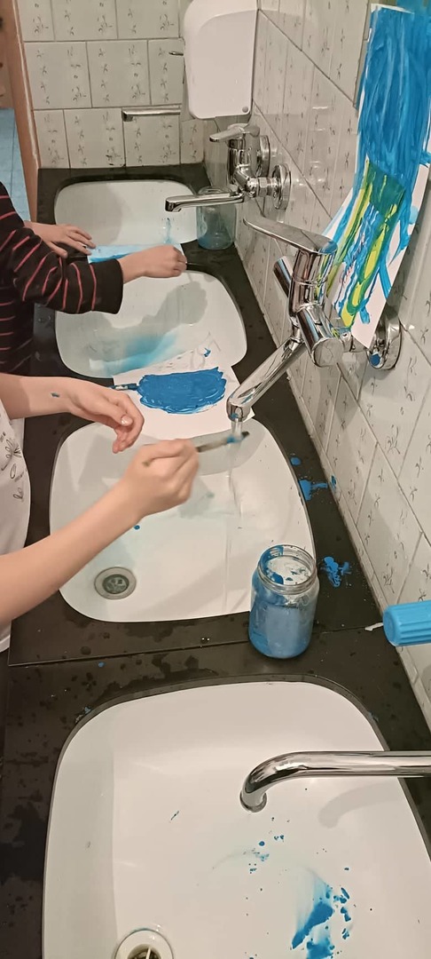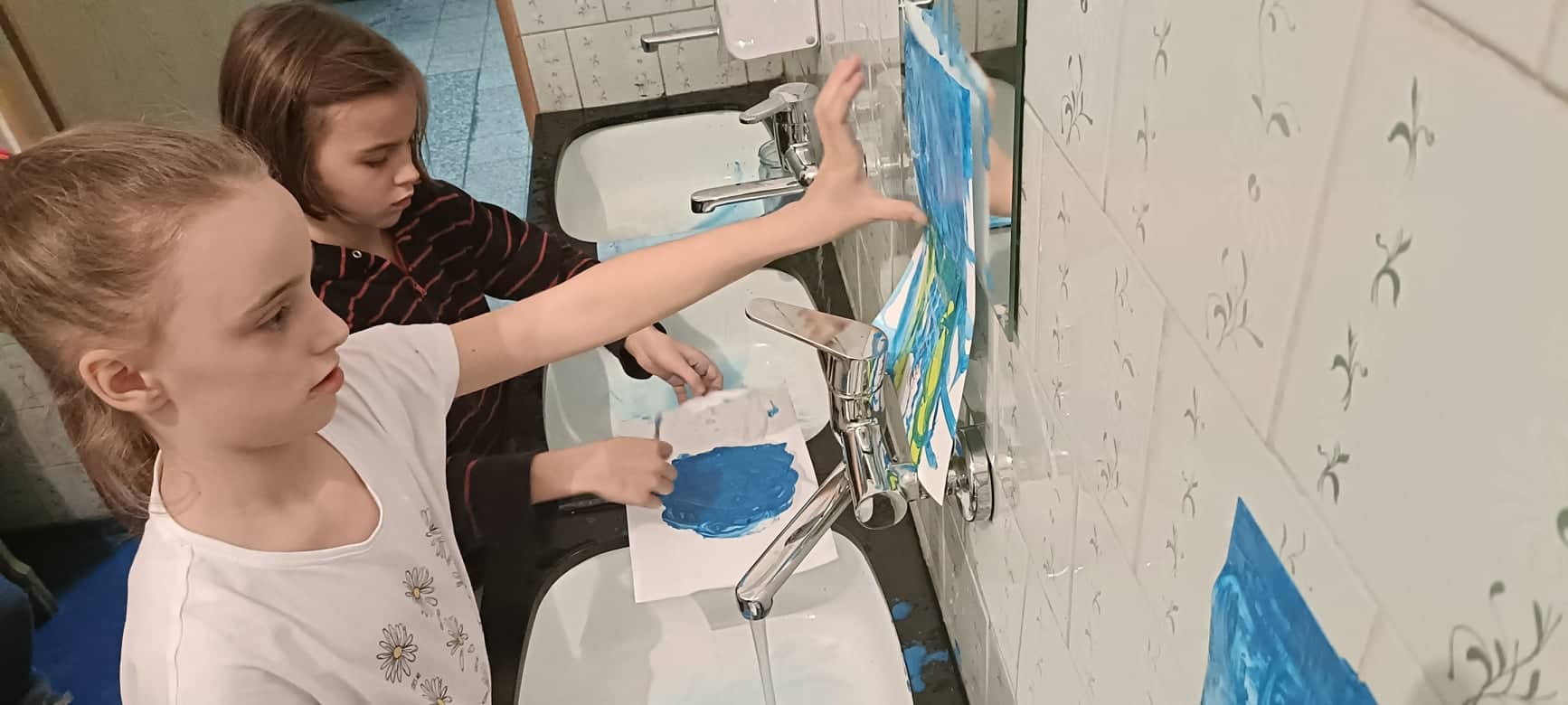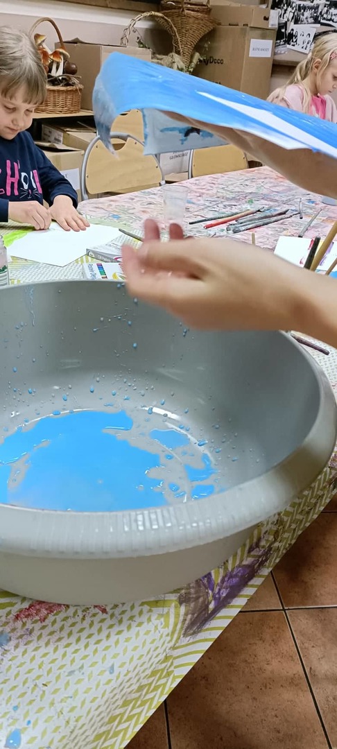 Najwięcej frajdy sprawiło wszystkim bezkarne obcowanie z miską i umywalką jako narzędziem malarskim. w domu na to zazwyczaj nie pozwalamy, dlatego uczestnicy mogli wyszaleć się na zajęciach!