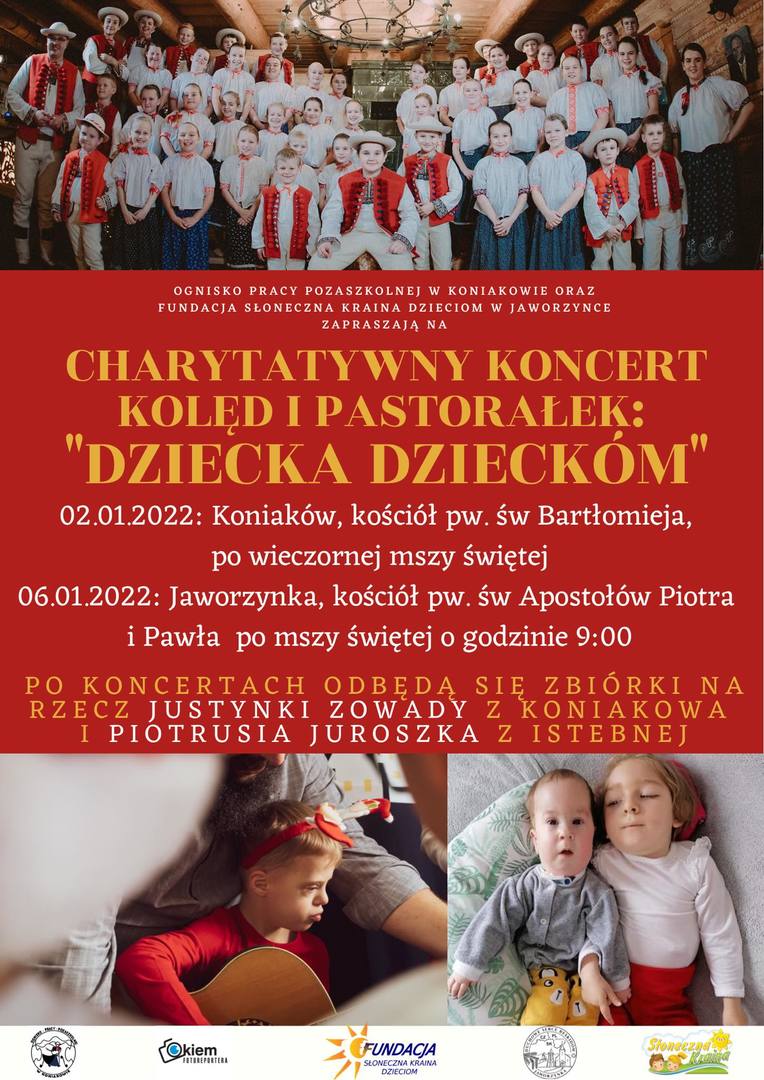 Wielkimi krokami zbliżają się Święta Bożego Narodzenia, a wraz z nimi okres tradycyjnego kolędowania. Razem z Terapeutyczny Punkt Przedszkolny w Jaworzynce już dziś gorąco zapraszamy do wspólnego kolędowania i udziału w charytatywnych koncertach na rzecz Justynki i Piotrusia W tym roku chcemy do kalendarza wydarzeń dołożyć dwa koncerty dziecięcych zespołów: Zespół Regionalny "MAŁA ISTEBNA", Dziecięcej Kapeli oraz Małego Koniakowa, działających przy naszym Ognisko Pracy Pozaszkolnej w Koniakowie, w Jaworzynce dołączą także nasze przedszkolaki