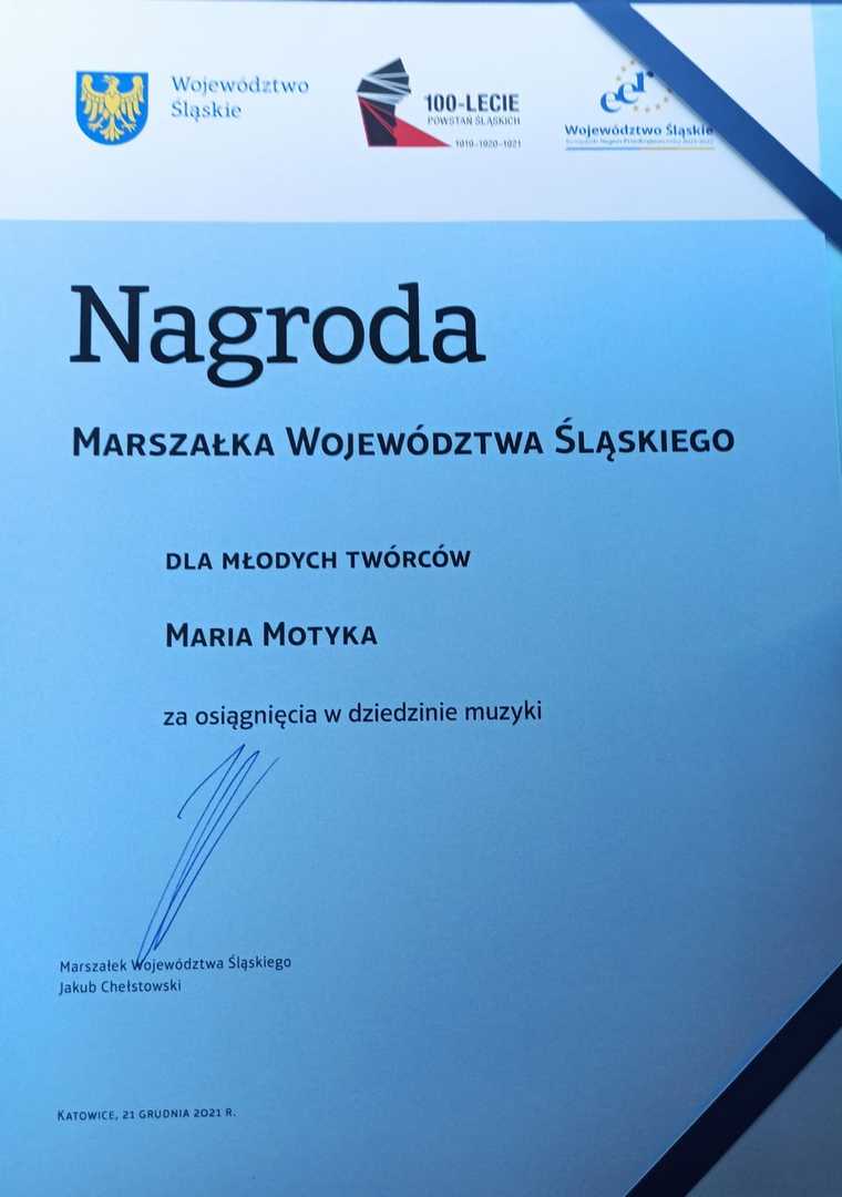 w dniu 14 lutego w sali Sejmiku 艢l膮skiego Marysia Motyka wzi臋艂a udzia艂 w uroczysto艣ciach wr臋czenia dyplomów zwi膮zanych z przyznanymi przez Marsza艂ka Jakuba Che艂stowskiego dla M艂odych Twórców za osi膮gni臋cia w dziedzinie muzyki