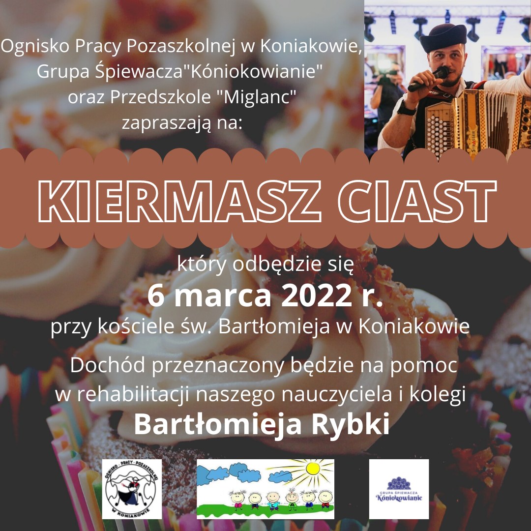 Razem z Grupa śpiewacza "Kóniokowianie" oraz Przedszkole "Miglanc" już po raz drugi zapraszamy na kiermasz ciast, który odbędzie się w niedzielę 6 marca 2022 r. przy Parafia Świętego Bartłomieja w Koniakowie