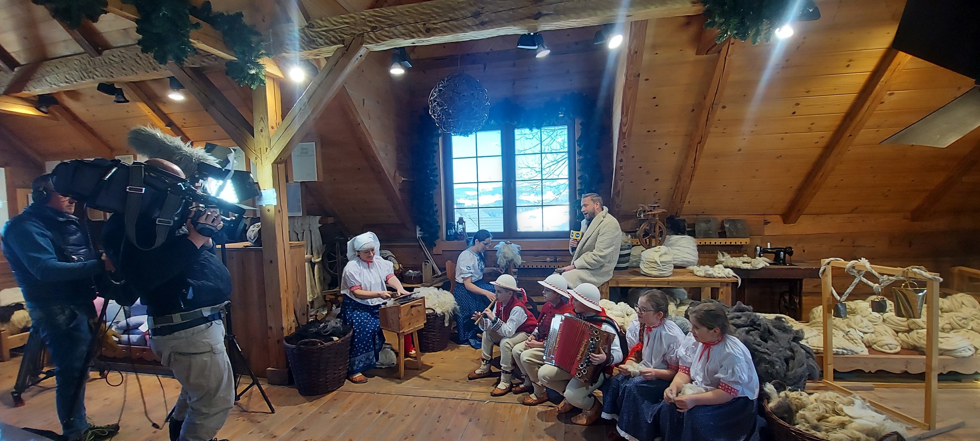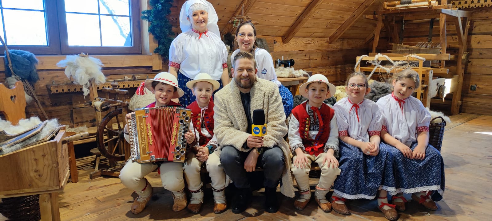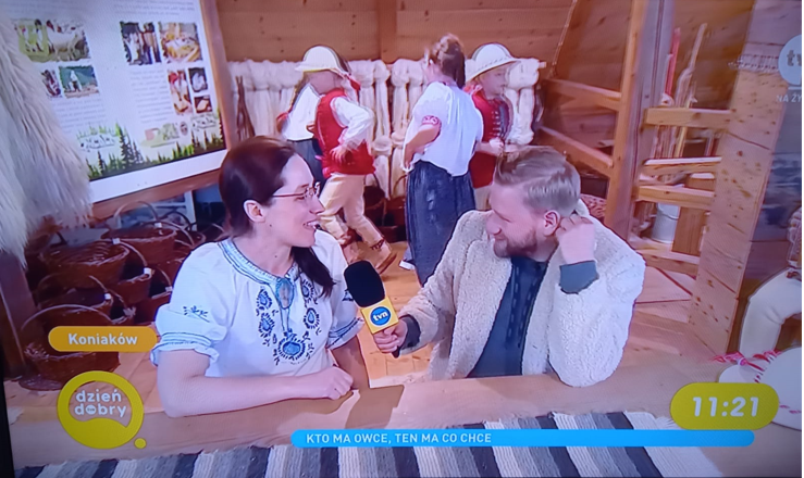 Przepiękna pogoda i roztańczone dzieci z Zespołu Regionalnego "Mały Koniaków" przywitały dzisiaj Pana Redaktora Bartłomieja Jedrzejaka w Centrum Pasterskie w Koniakowie . Była to pierwsza przygoda z telewizją dla małych zespoloków gdzie mogli zaprezentować naszą muzykę i tańce ludowe
