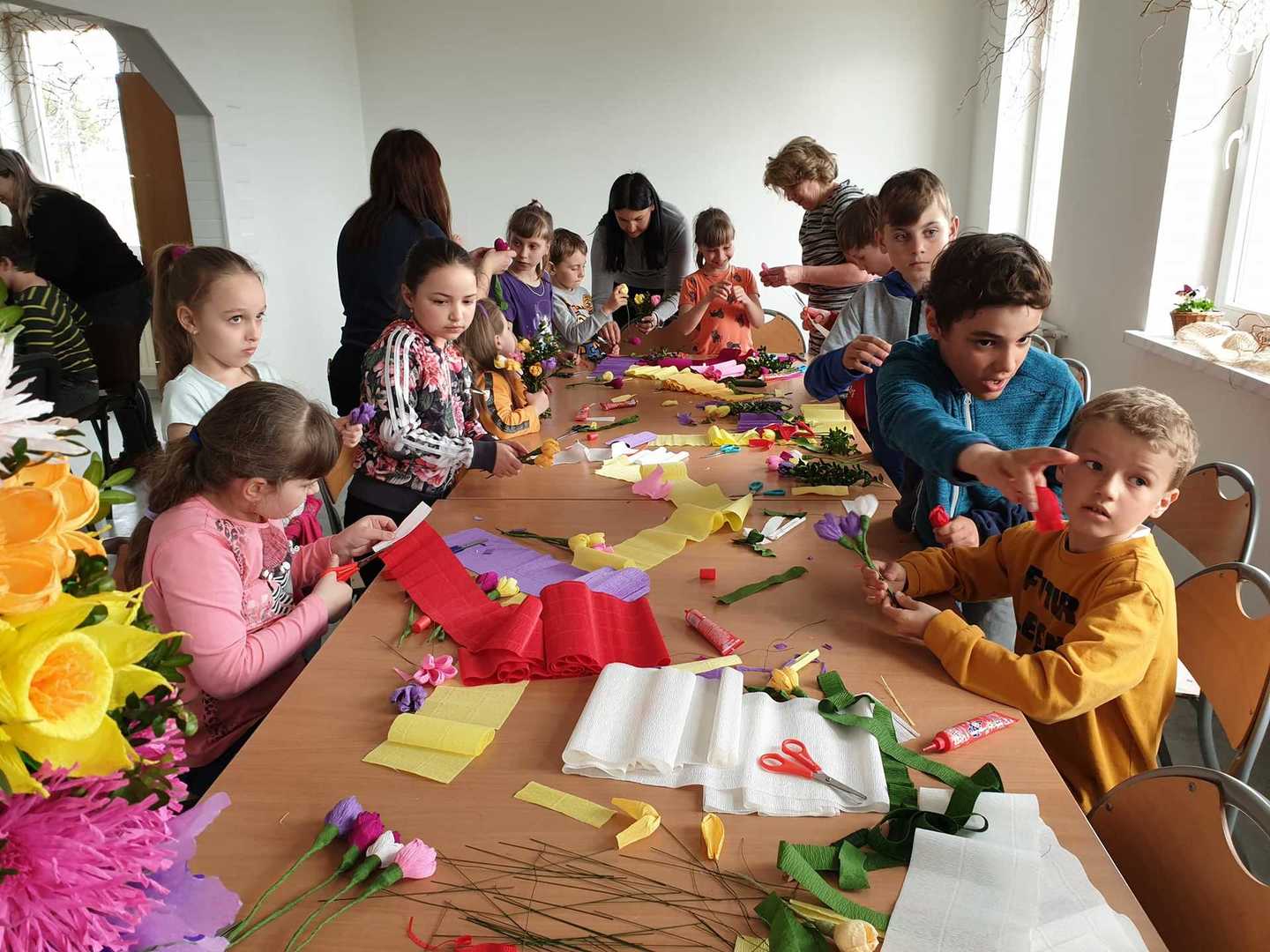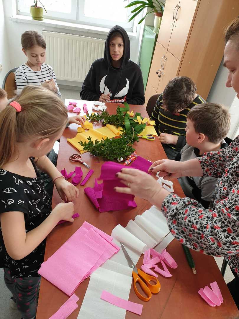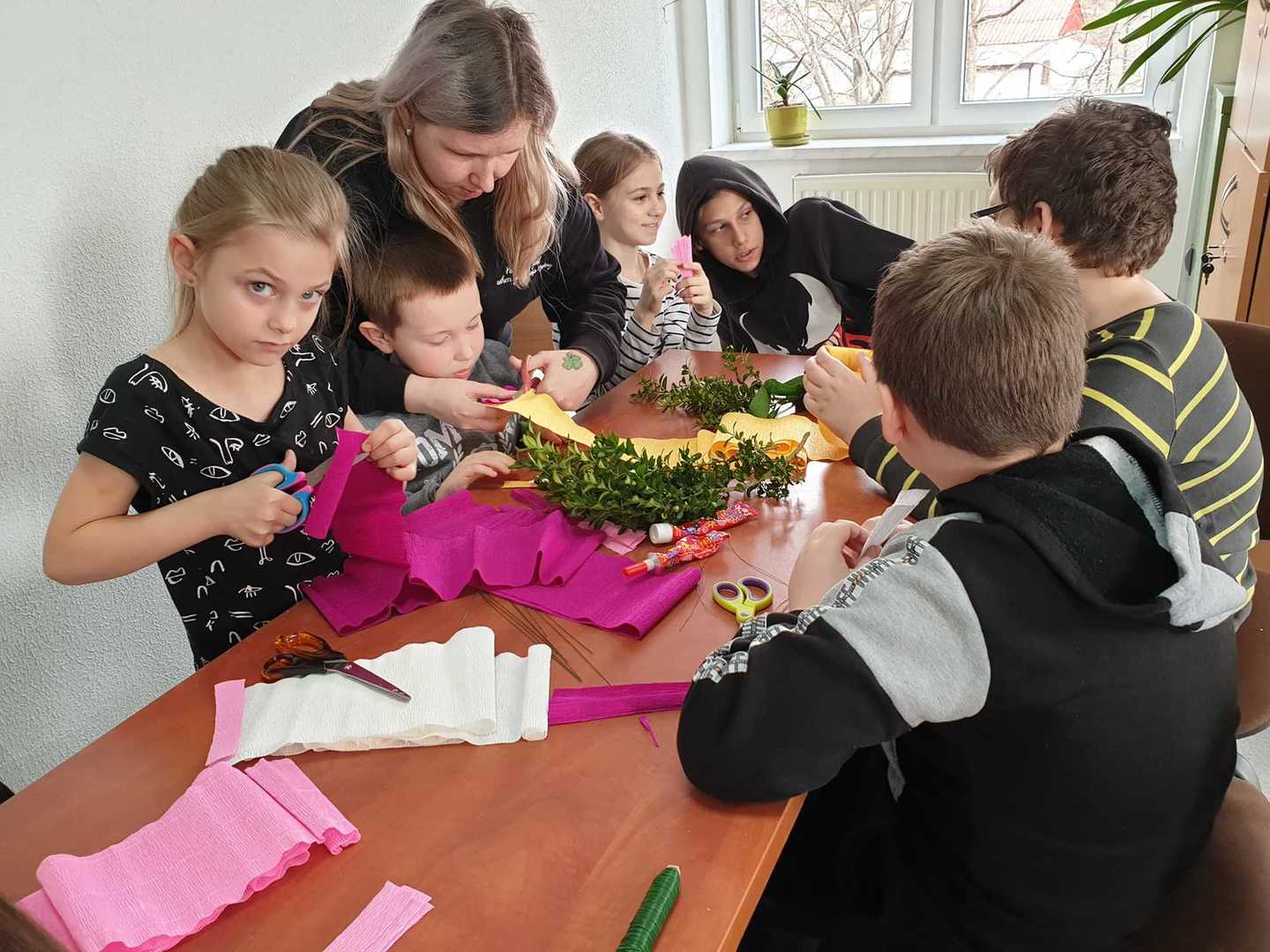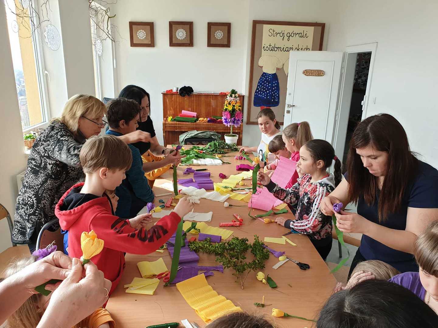 Dzieci pod czujnym okiem Pa艅 Agaty Polok, Teresy Vavra膰 i Katarzyny Suszka uczy艂y si臋 wi膰 kwiaty z bibu艂y, które pieknie ozdabiaj膮 wielkanocne palmy. Dziekujemy Pani Magdalenie Matuszny, Dominice Zeman i Krzysztofowi Pawlakowi za pomoc w organizacji i koordynacji spotkania