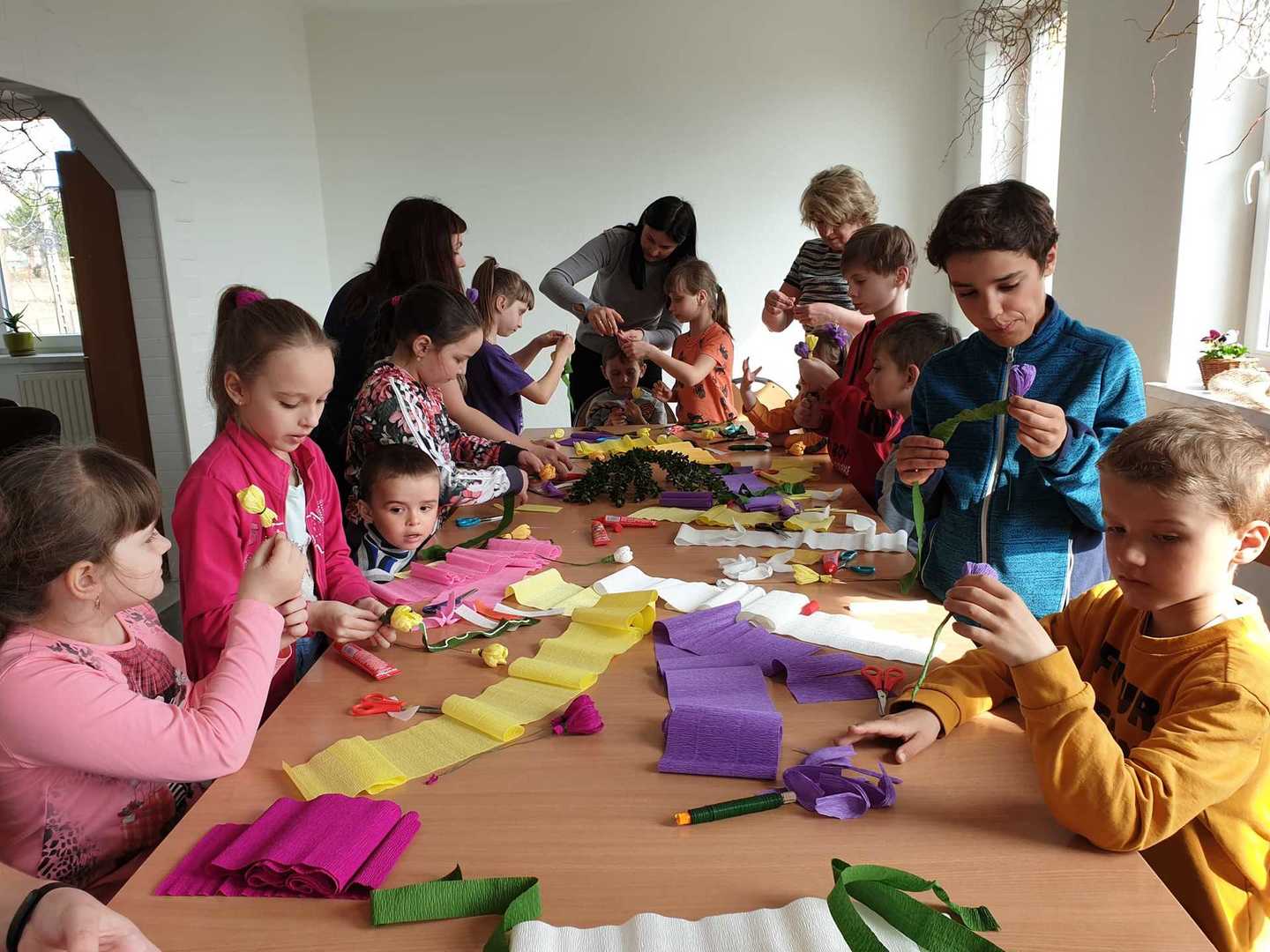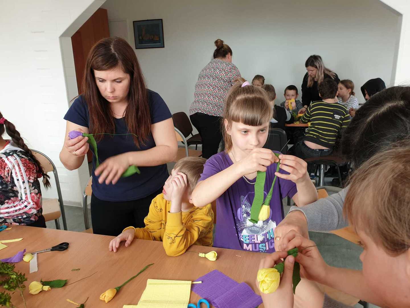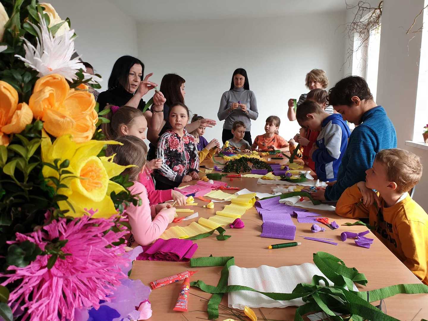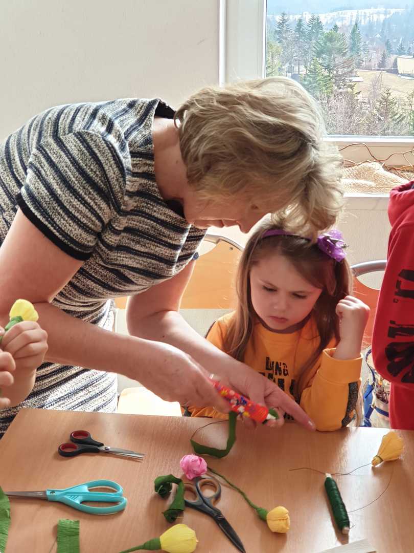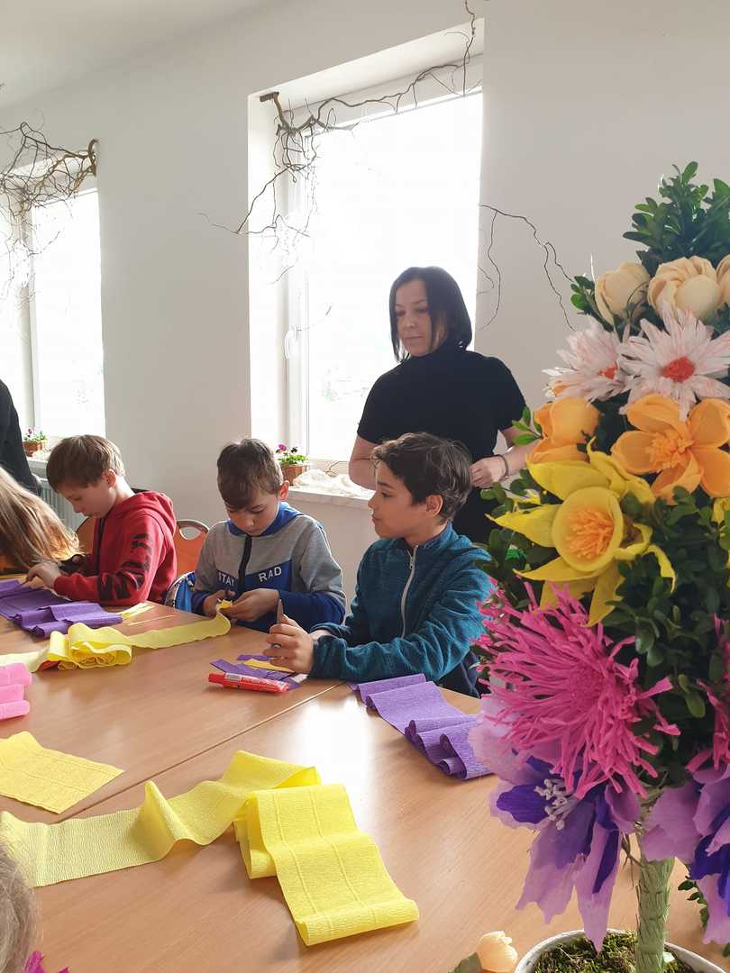 Dzieci pod czujnym okiem Pa艅 Agaty Polok, Teresy Vavra膰 i Katarzyny Suszka uczy艂y si臋 wi膰 kwiaty z bibu艂y, które pieknie ozdabiaj膮 wielkanocne palmy. Dziekujemy Pani Magdalenie Matuszny, Dominice Zeman i Krzysztofowi Pawlakowi za pomoc w organizacji i koordynacji spotkania