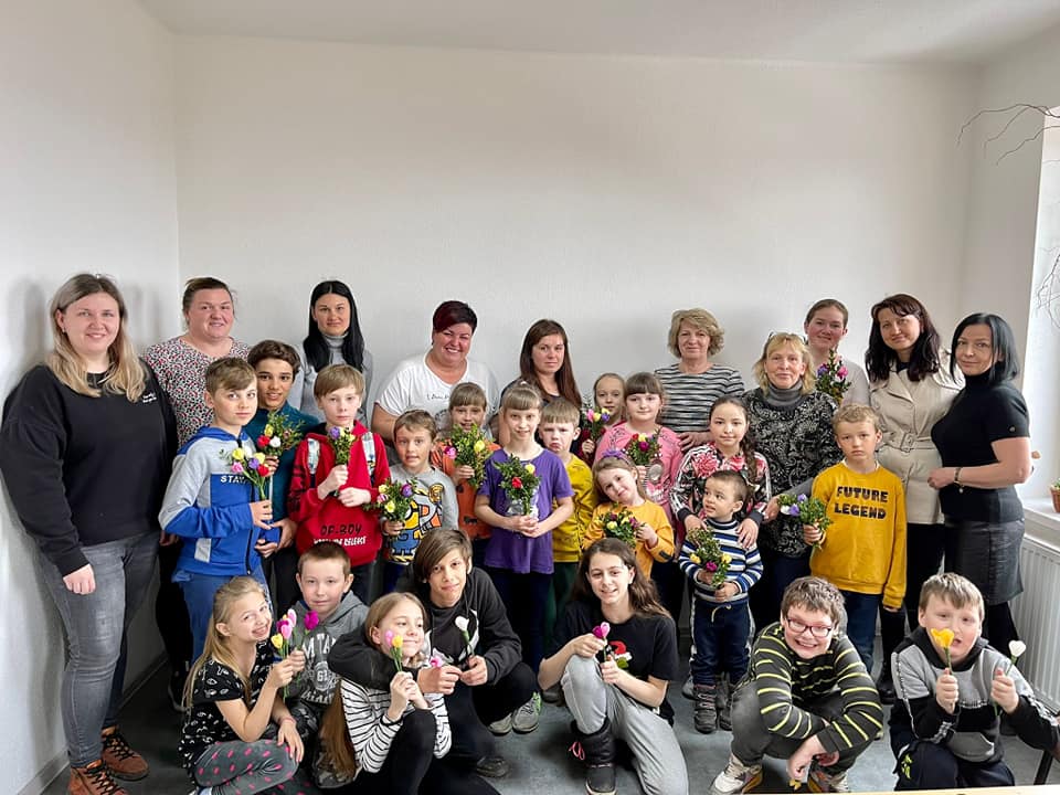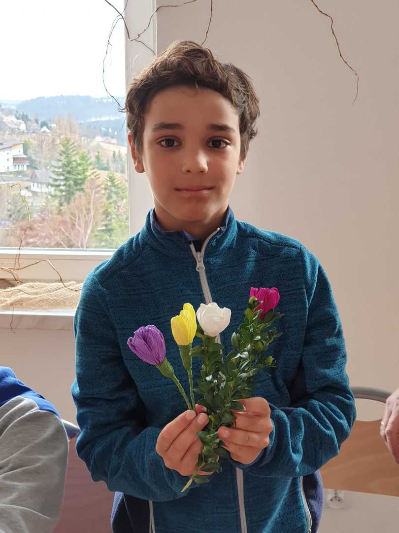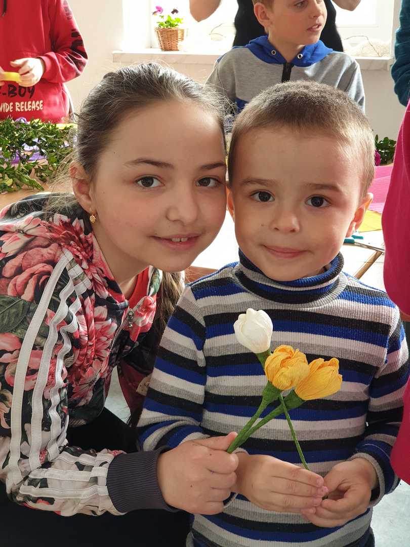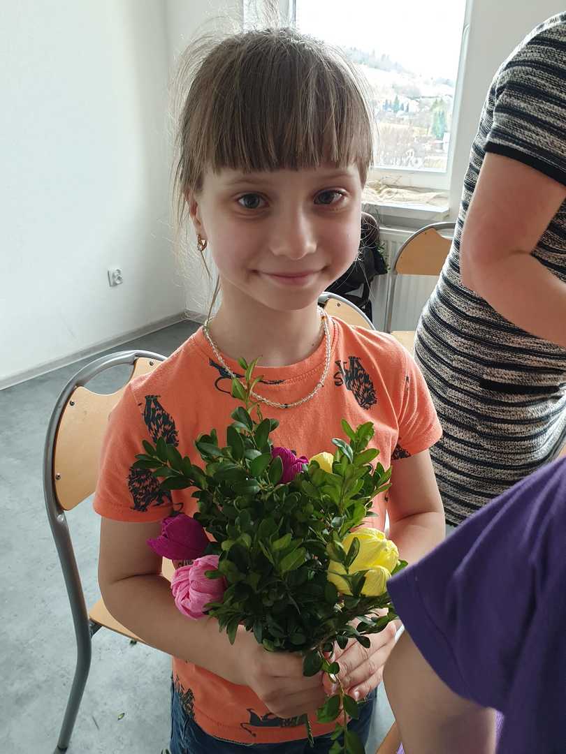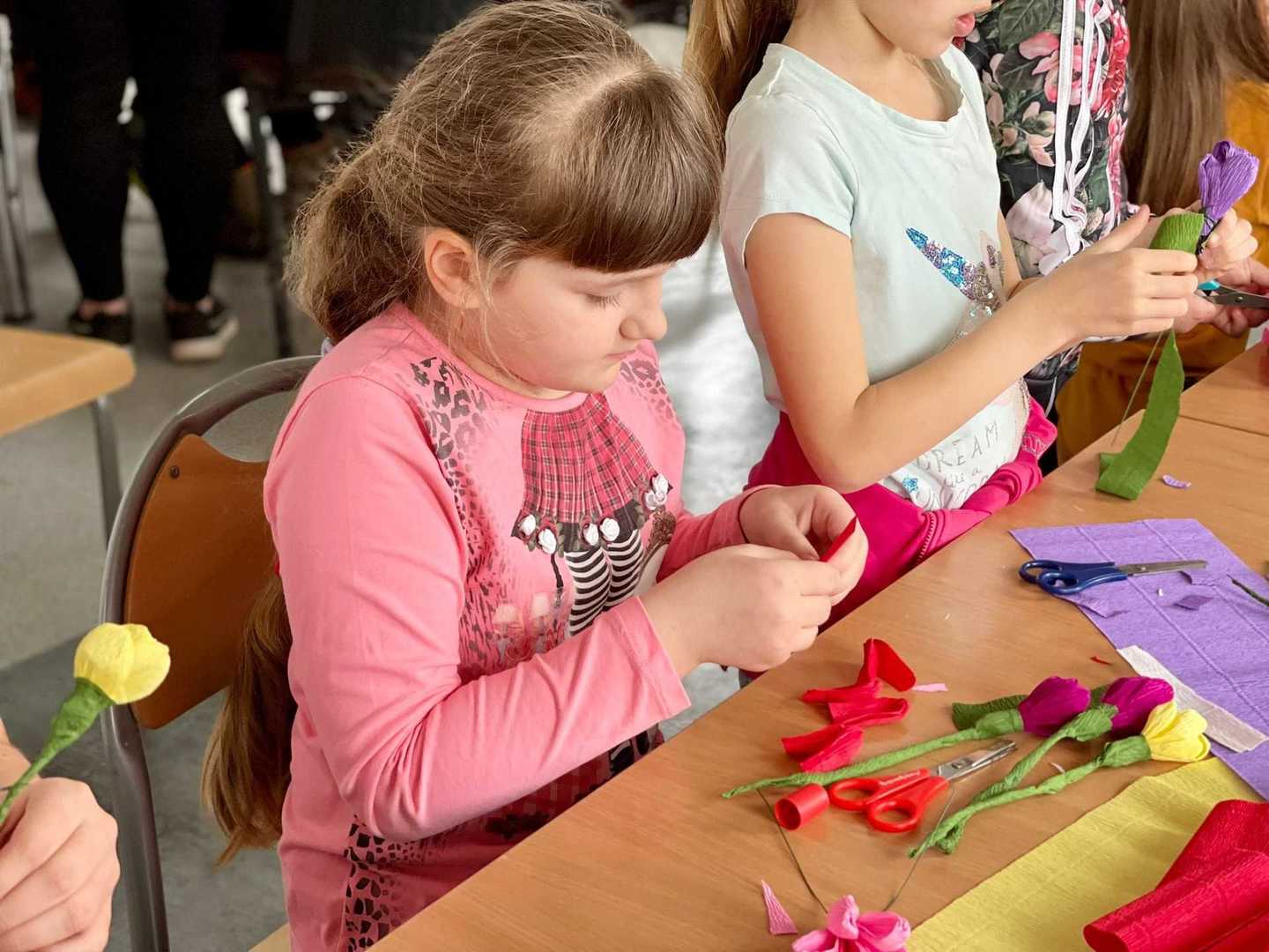 Dzieci pod czujnym okiem Pa艅 Agaty Polok, Teresy Vavra膰 i Katarzyny Suszka uczy艂y si臋 wi膰 kwiaty z bibu艂y, które pieknie ozdabiaj膮 wielkanocne palmy. Dziekujemy Pani Magdalenie Matuszny, Dominice Zeman i Krzysztofowi Pawlakowi za pomoc w organizacji i koordynacji spotkania