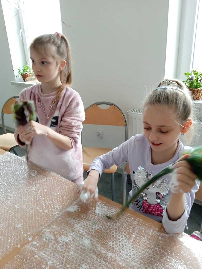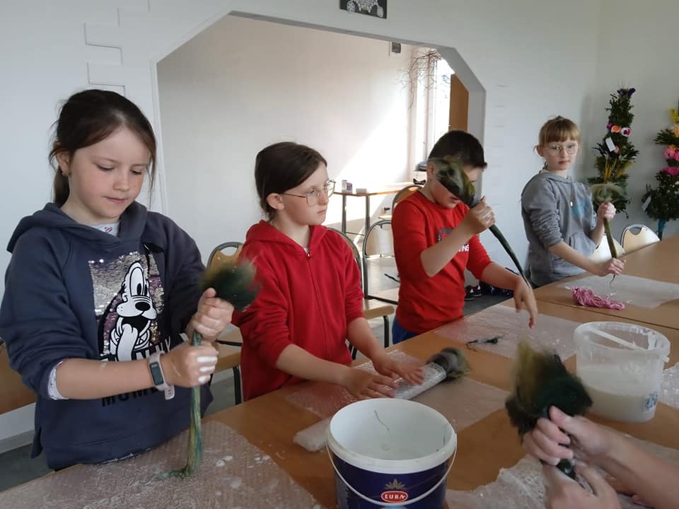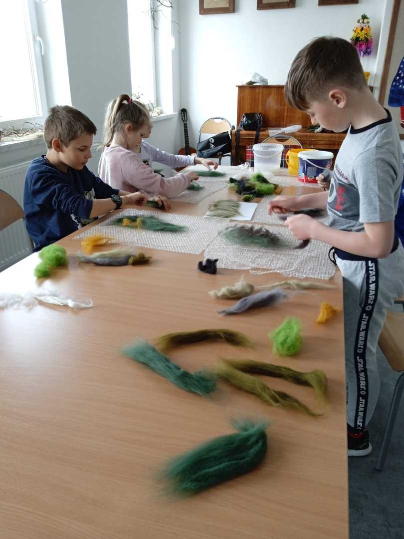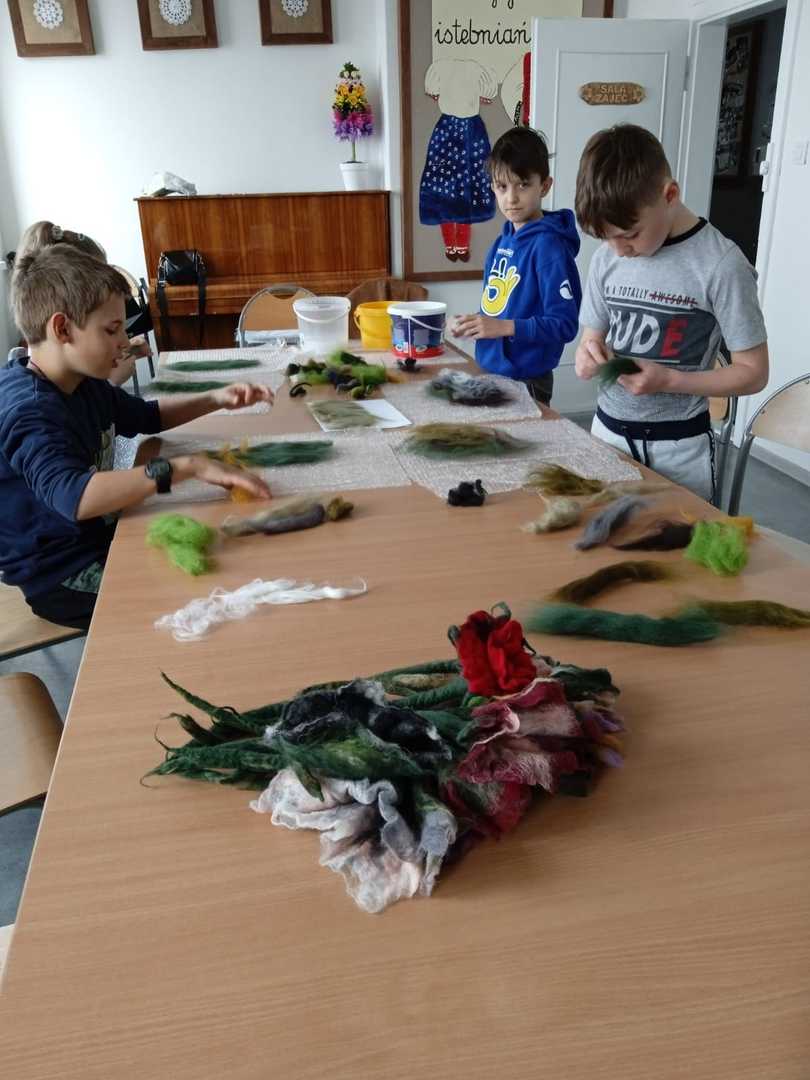 Podopieczni ko艂a zr臋cznych r膮k tym razem dla swoich Mam postanowili wykona膰 kwiaty technik膮 filcowania na mokro. Polega ona na po艂膮czeniu ze sob膮 poszczególnych pasm we艂ny poprzez moczenie, pocieranie, wygniatanie, wa艂kowanie i wreszcie suszenie.