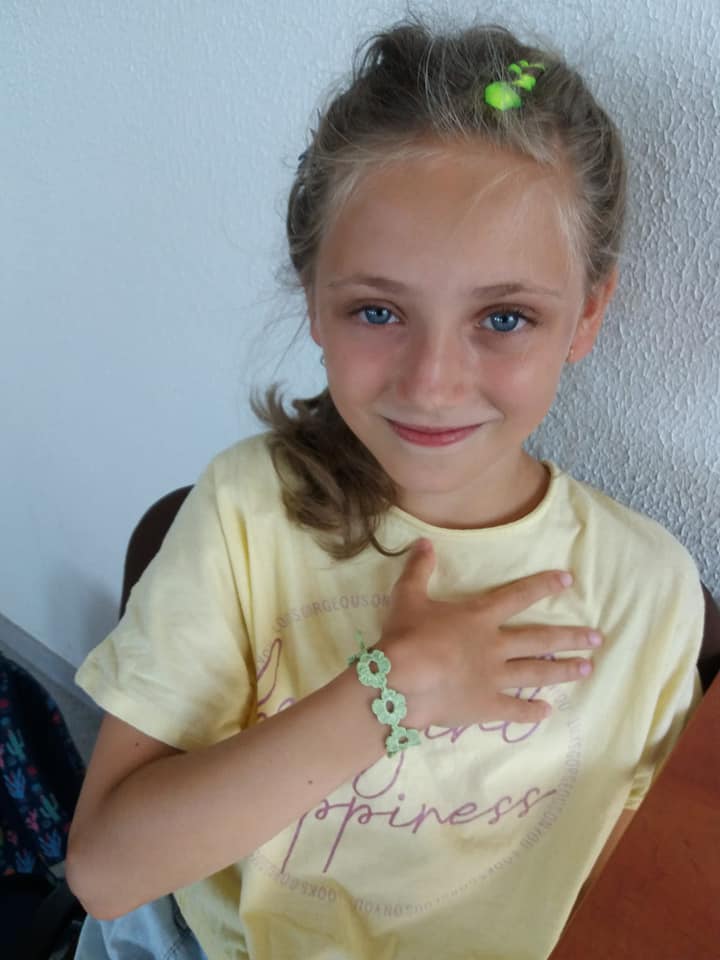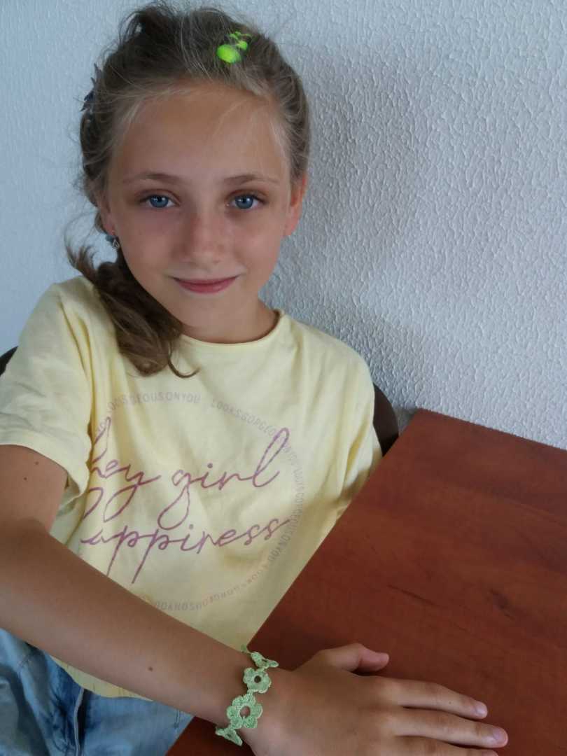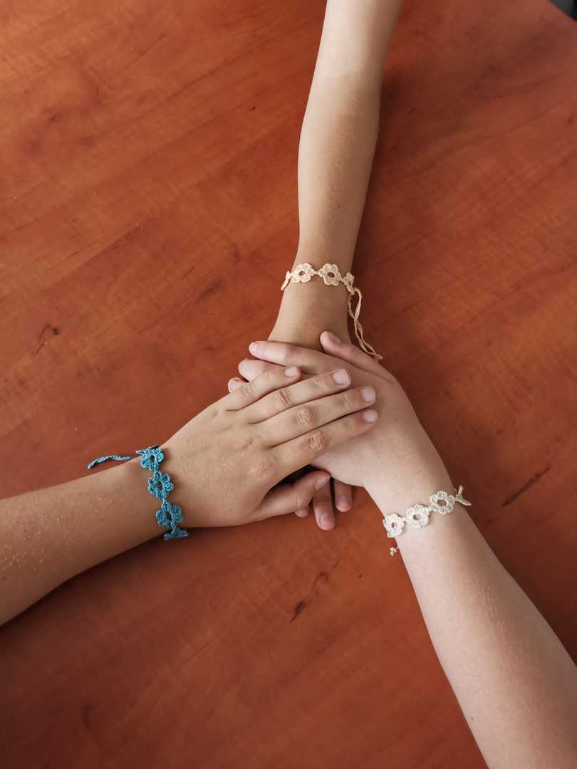 Młode koronczarski z kółka koronczarskiego wyheklowały sobie letnią biżuterię - bransoletki z kwiatuszkow