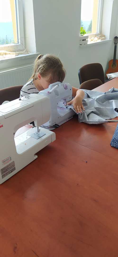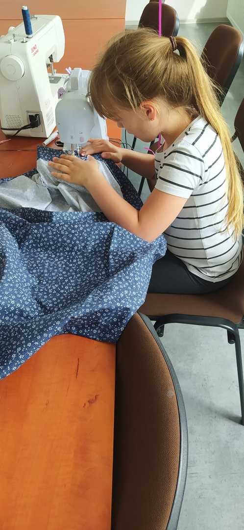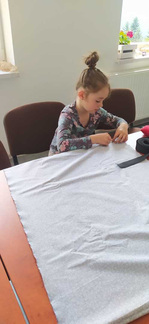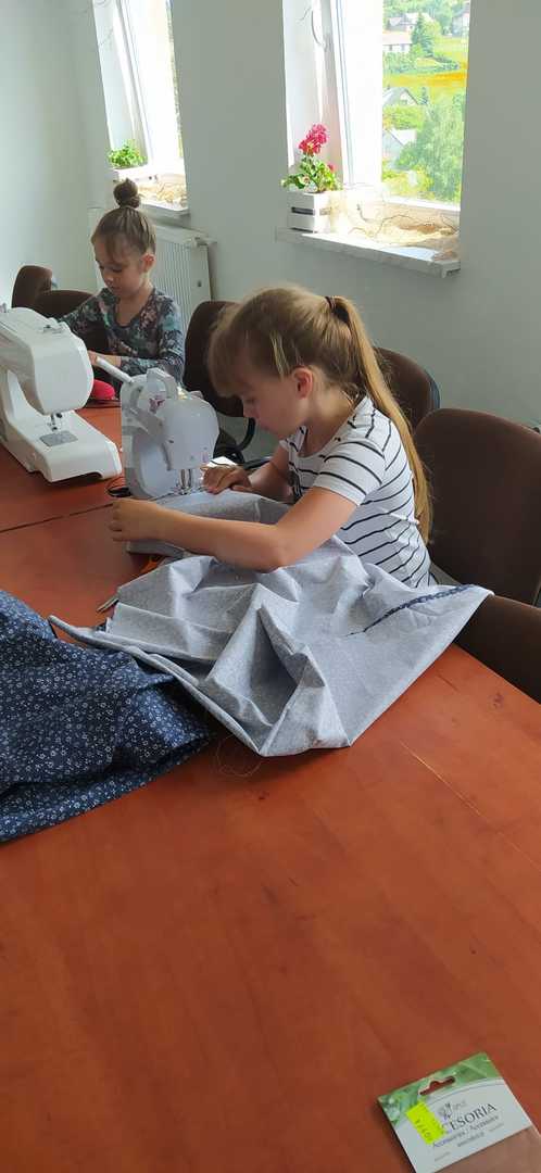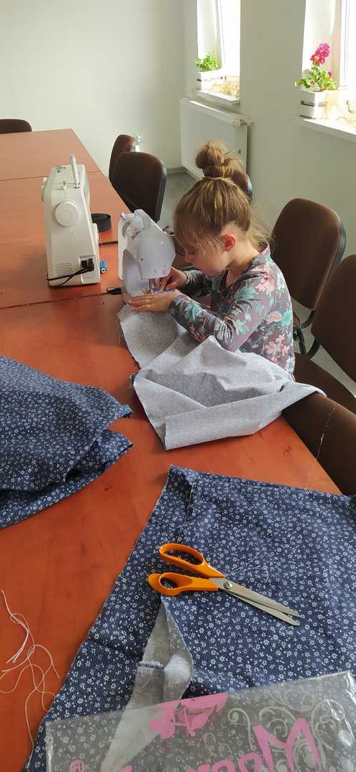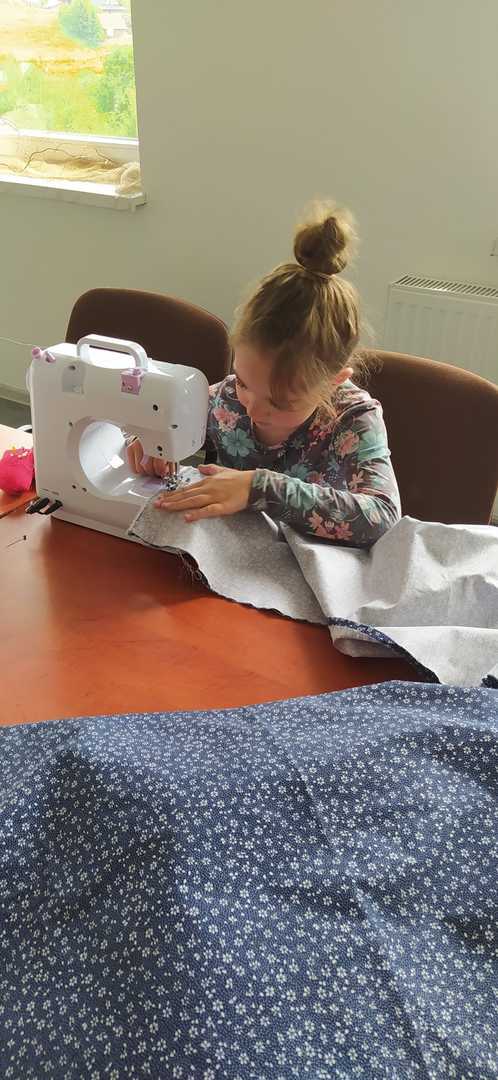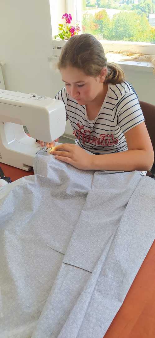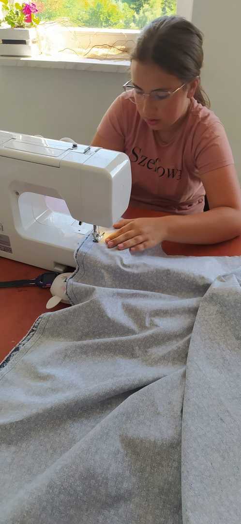 Nasza instruktorka Katarzyna Suszka, ktora na codzień szyje stroje ludowe przekazuje tą tradycję dziewczynkom z koła krawieckiego.