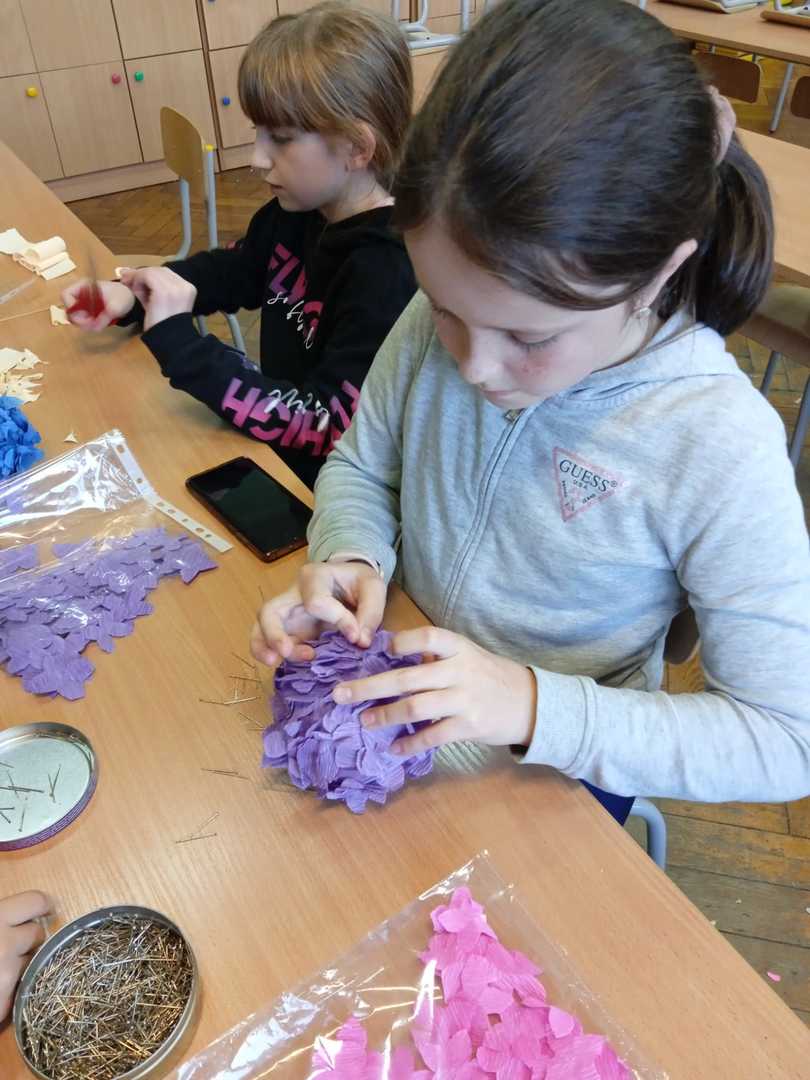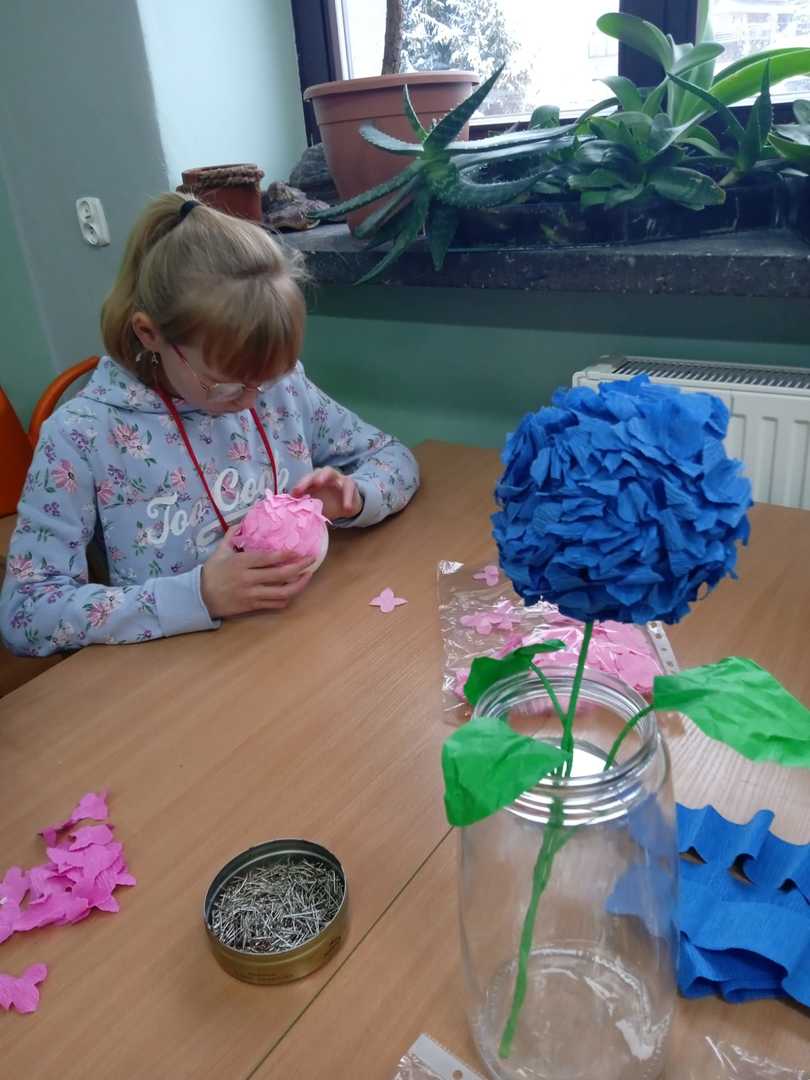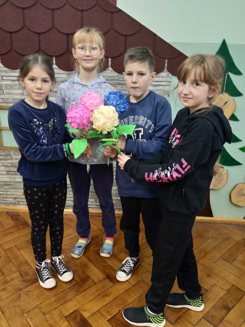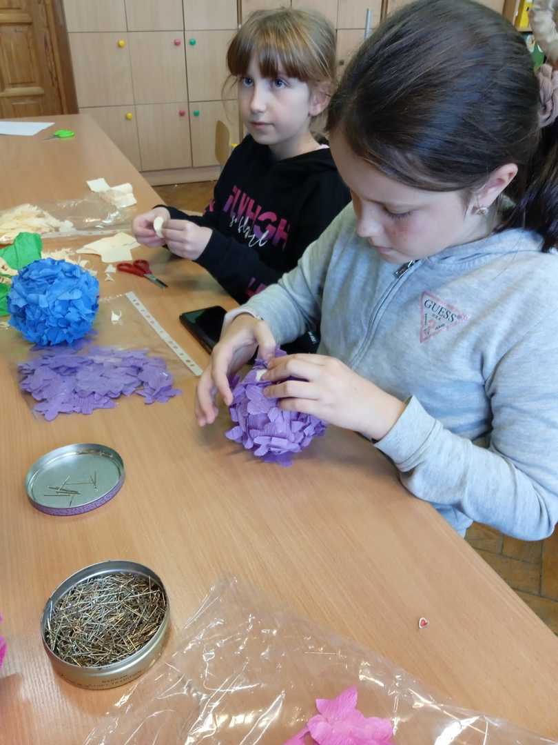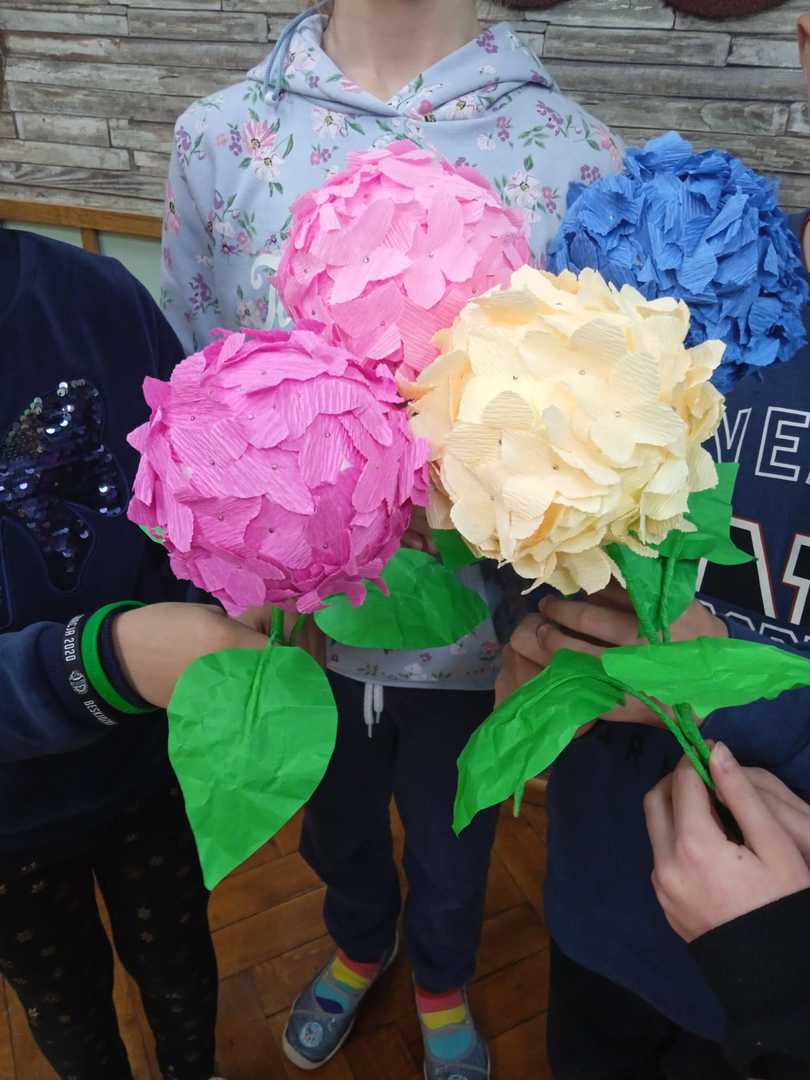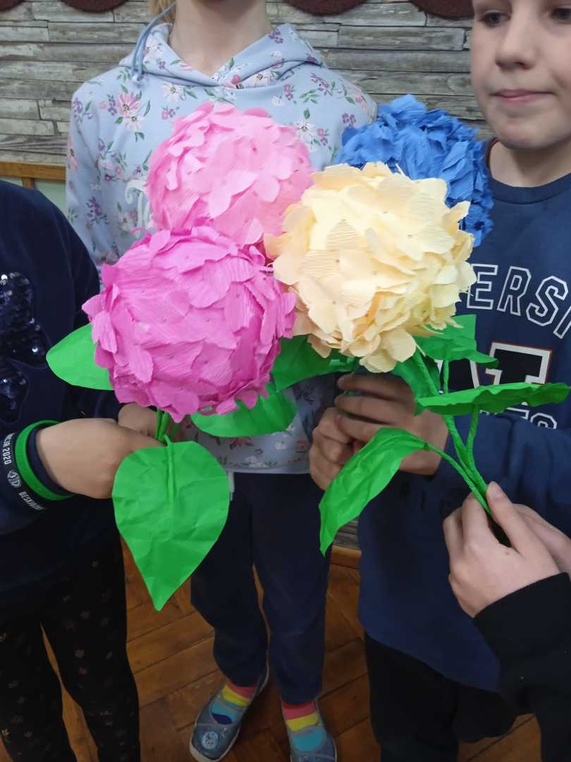 Podczas gdy młodsza grupa dzieci z koła bibułkarskiego na swoich ostatnich zajęciach demonstrowała piękne chryzantemy, grupa starsza w tym czasie zajmowała się tematem hortensji. Te piękne i okazałe kwiaty wykonane przez starszych wychowanków niewątpliwie robią wrażenie 🌺🌸🌼💐