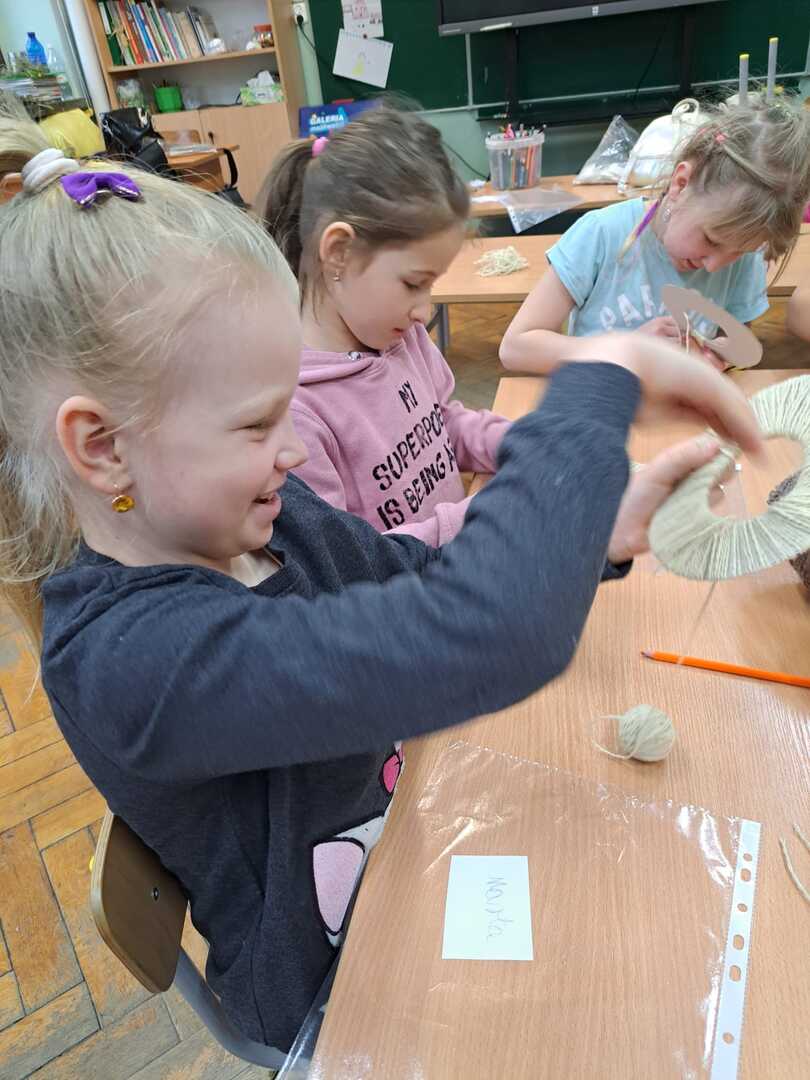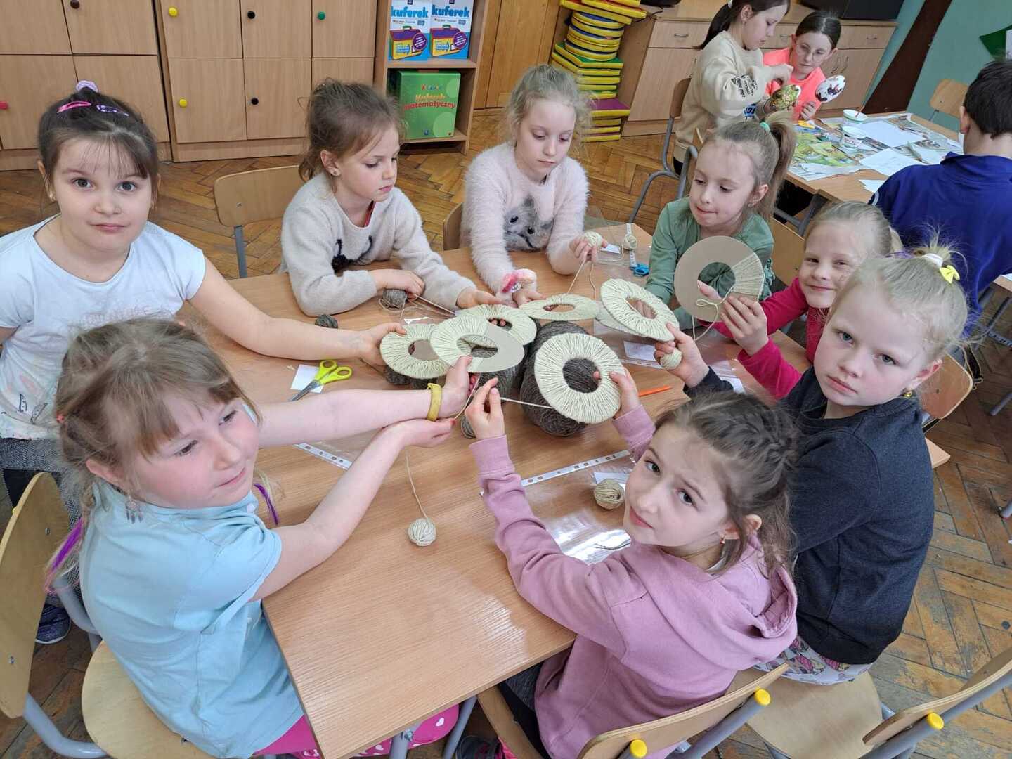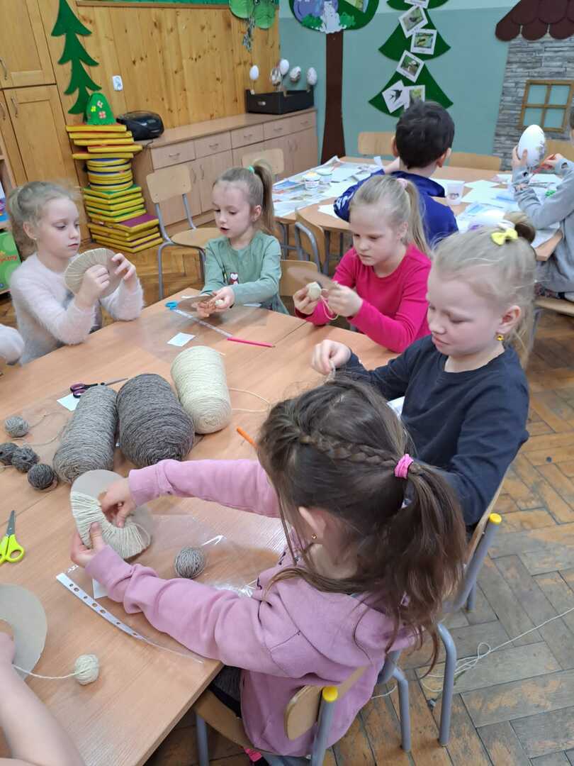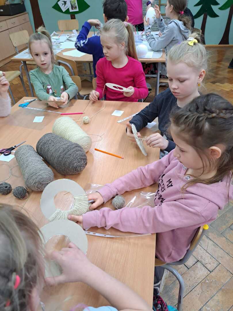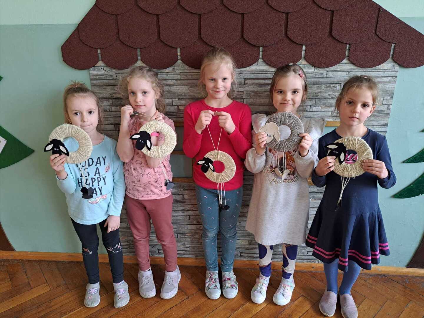 M艂odsza grupa dzieci z ko艂a zr臋cznych r膮k wykona艂a dekoracj臋 na ten wyj膮tkowy czas. Owieczki ozdobione we艂n膮, 艣wietnie sprawdz膮 si臋 zawieszone w oknach lub na wianku wielkanocnym