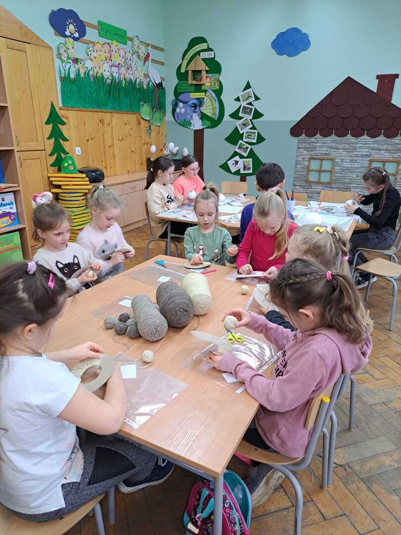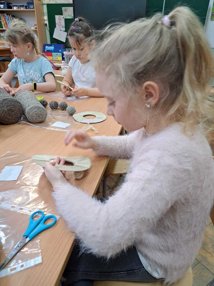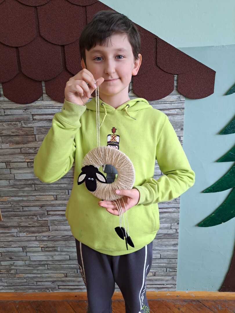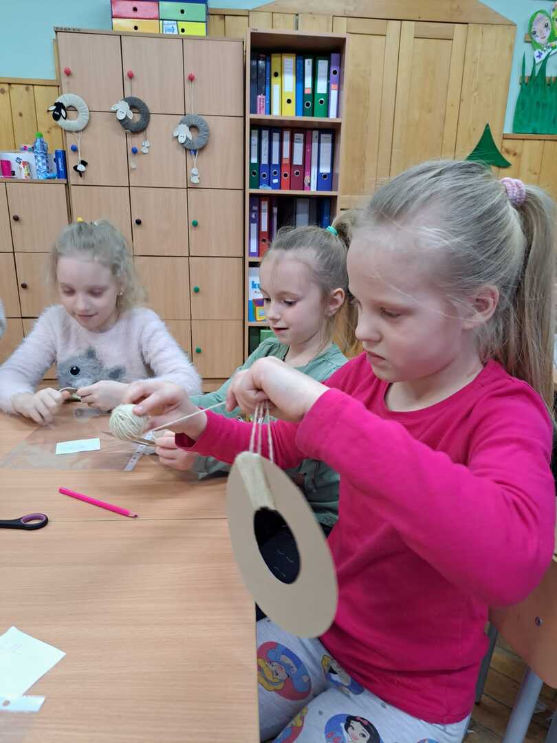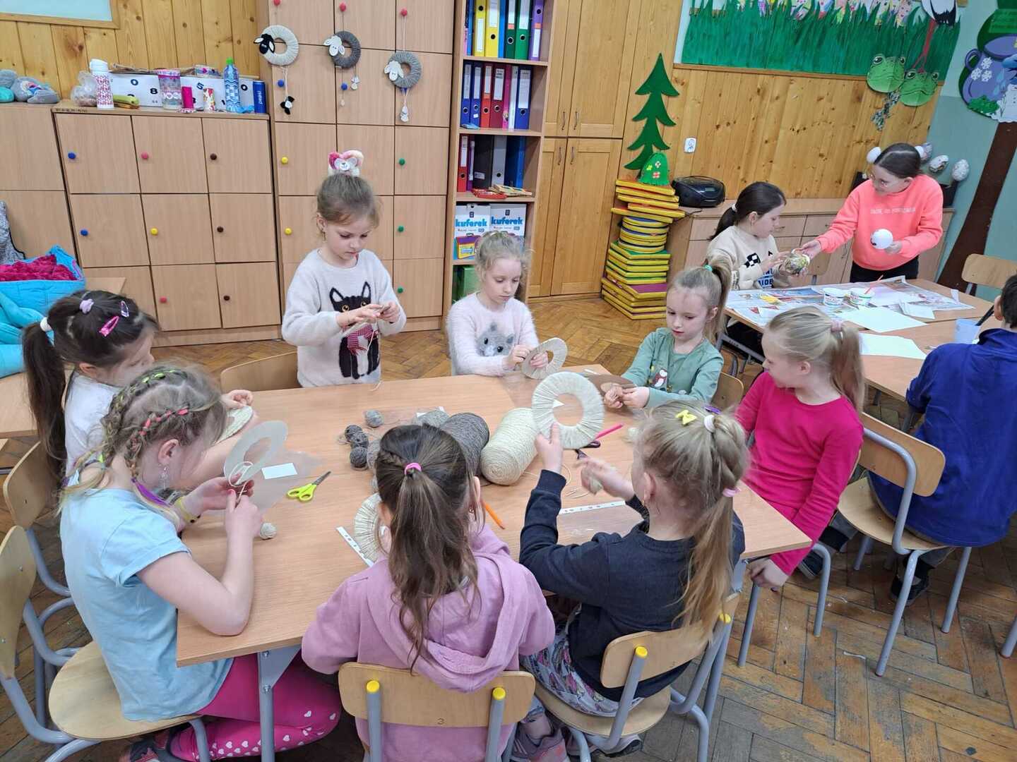 M艂odsza grupa dzieci z ko艂a zr臋cznych r膮k wykona艂a dekoracj臋 na ten wyj膮tkowy czas. Owieczki ozdobione we艂n膮, 艣wietnie sprawdz膮 si臋 zawieszone w oknach lub na wianku wielkanocnym