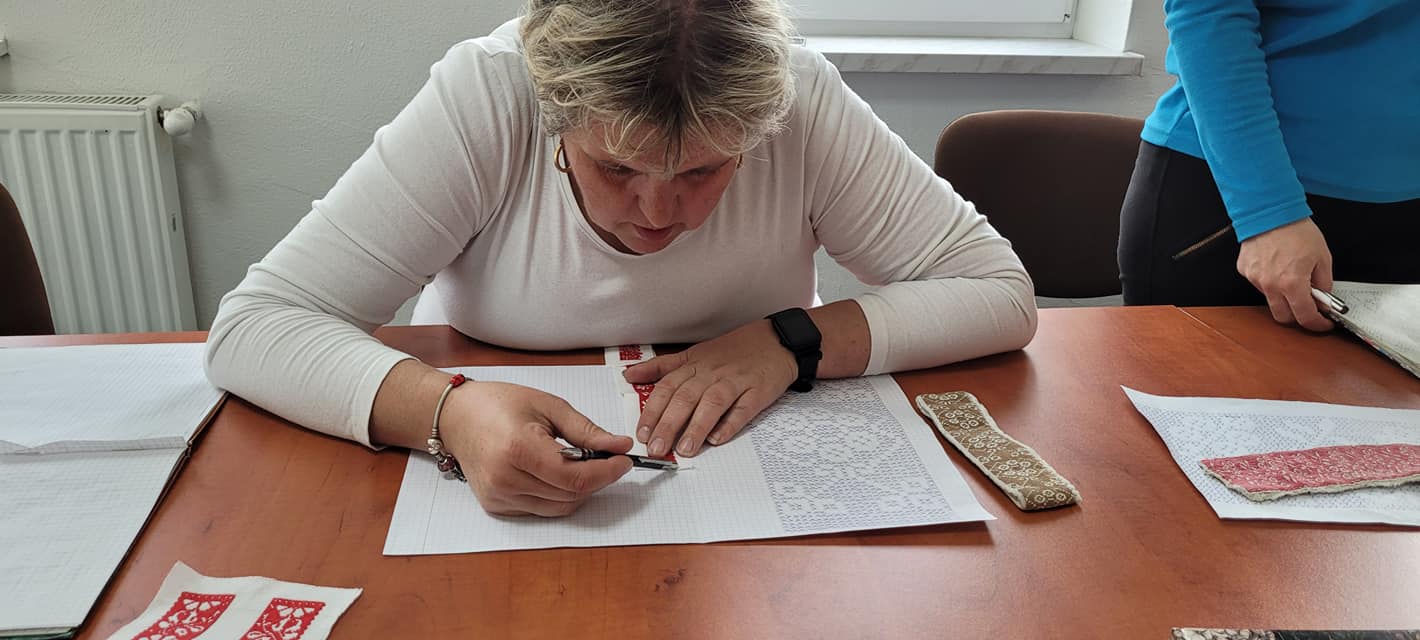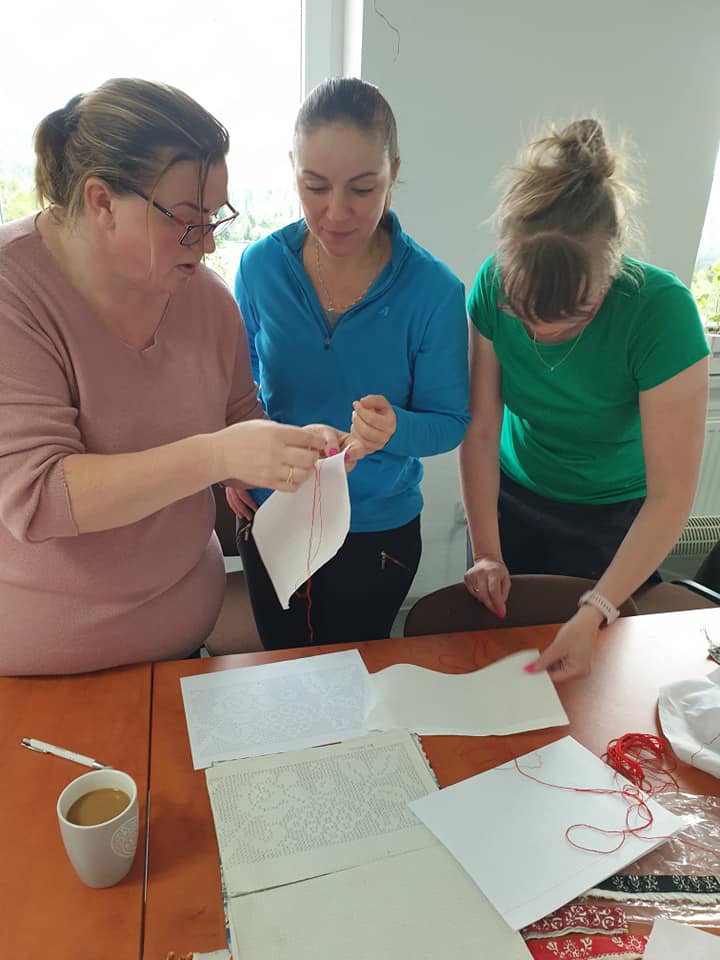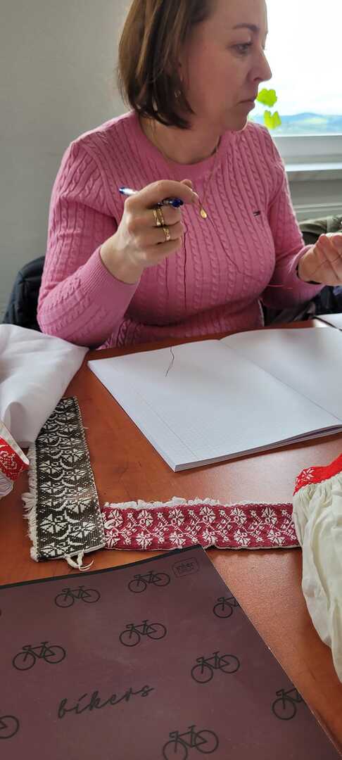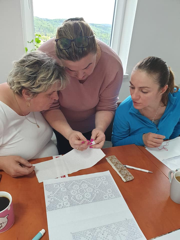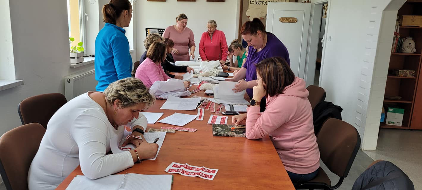 Na pierwszych zajęciach uczestniczki miały możliwość zapoznania się z archaicznymi wzorami haftów oraz sposobami ich wykonywania. Umiejętności te będą doskonalone podczas najbliższych spotkań warsztatowych, które prowadzi Katarzyna Suszka