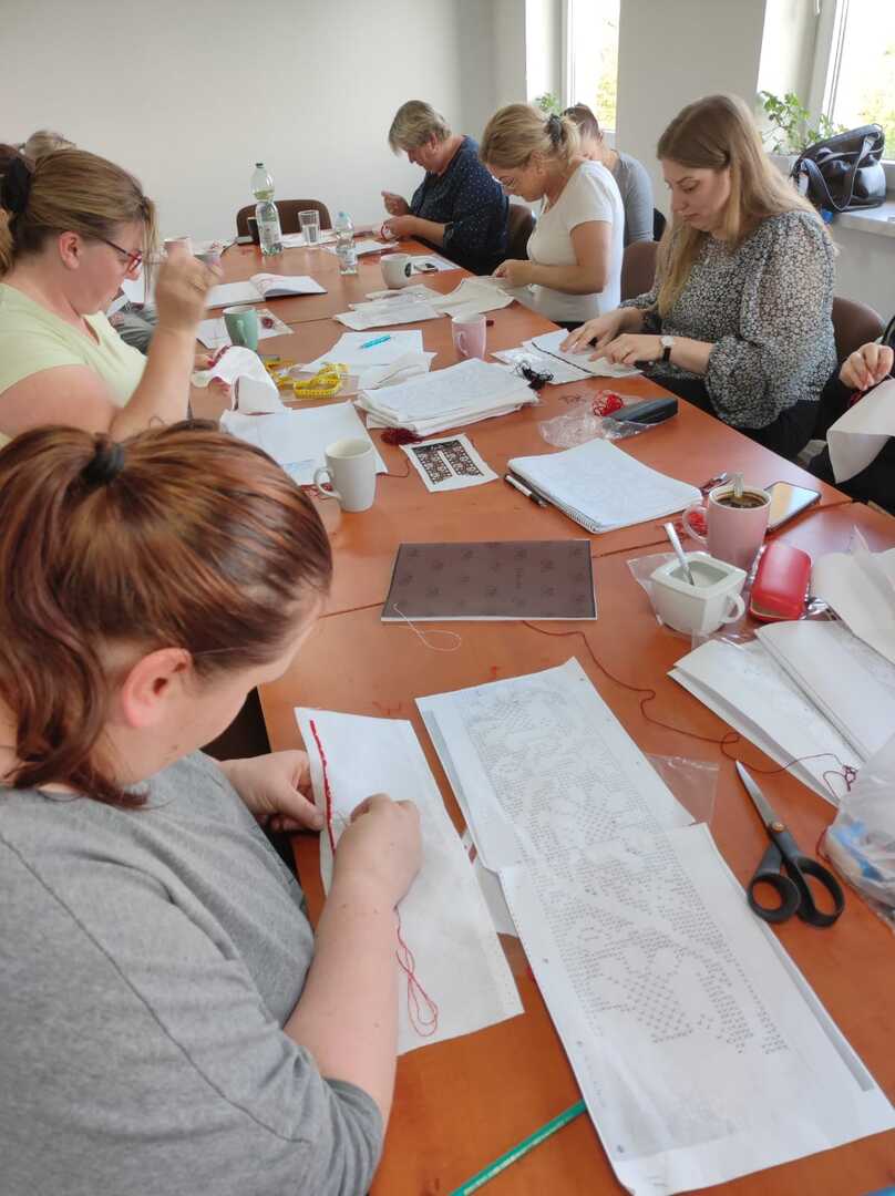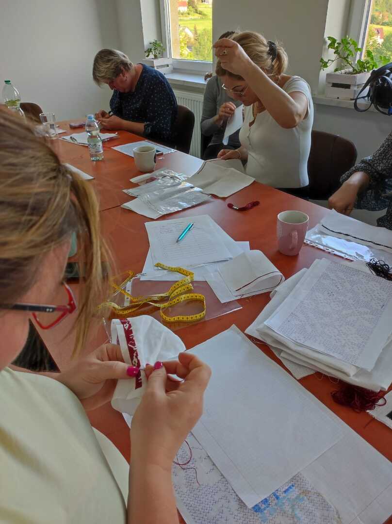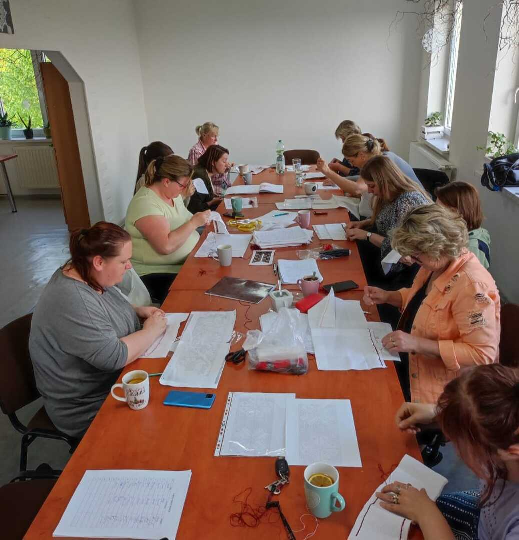 Nasze uczestniczki obecnie wyszywają archaiczne wzory haftów, które będą wykorzystane do wykonania kabotkow Umiejętności te będą doskonalone podczas najbliższych spotkań warsztatowych, które prowadzi Katarzyna Suszka