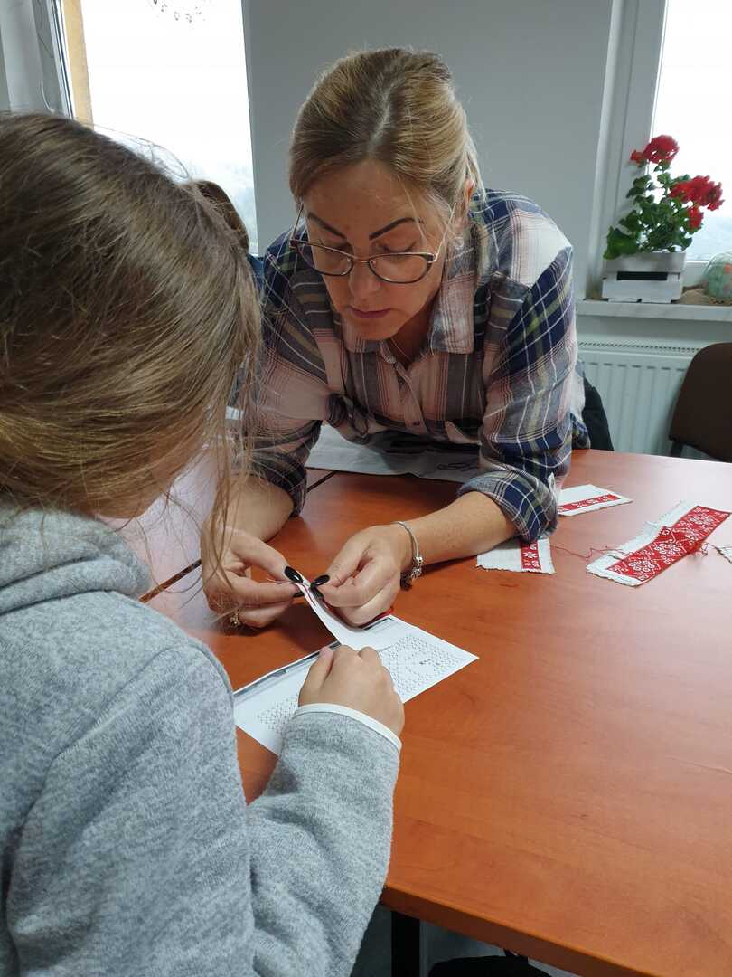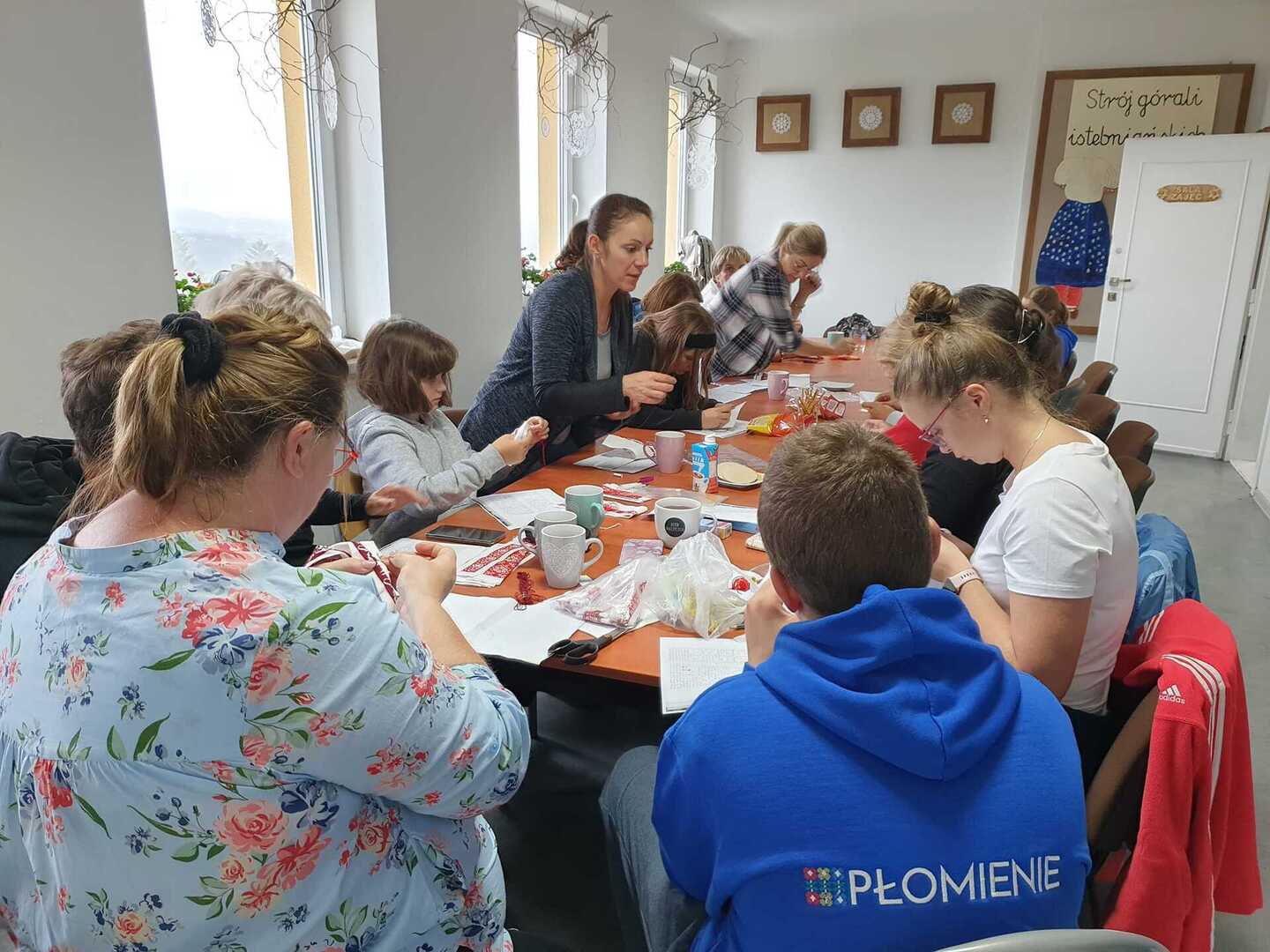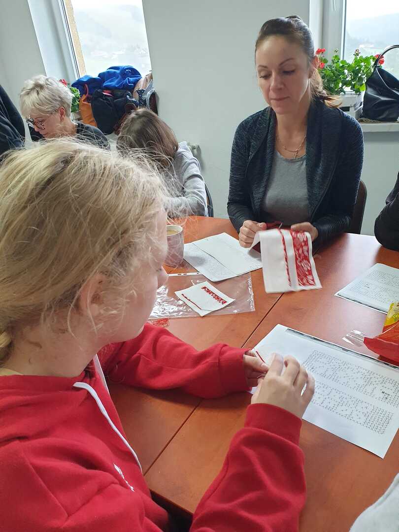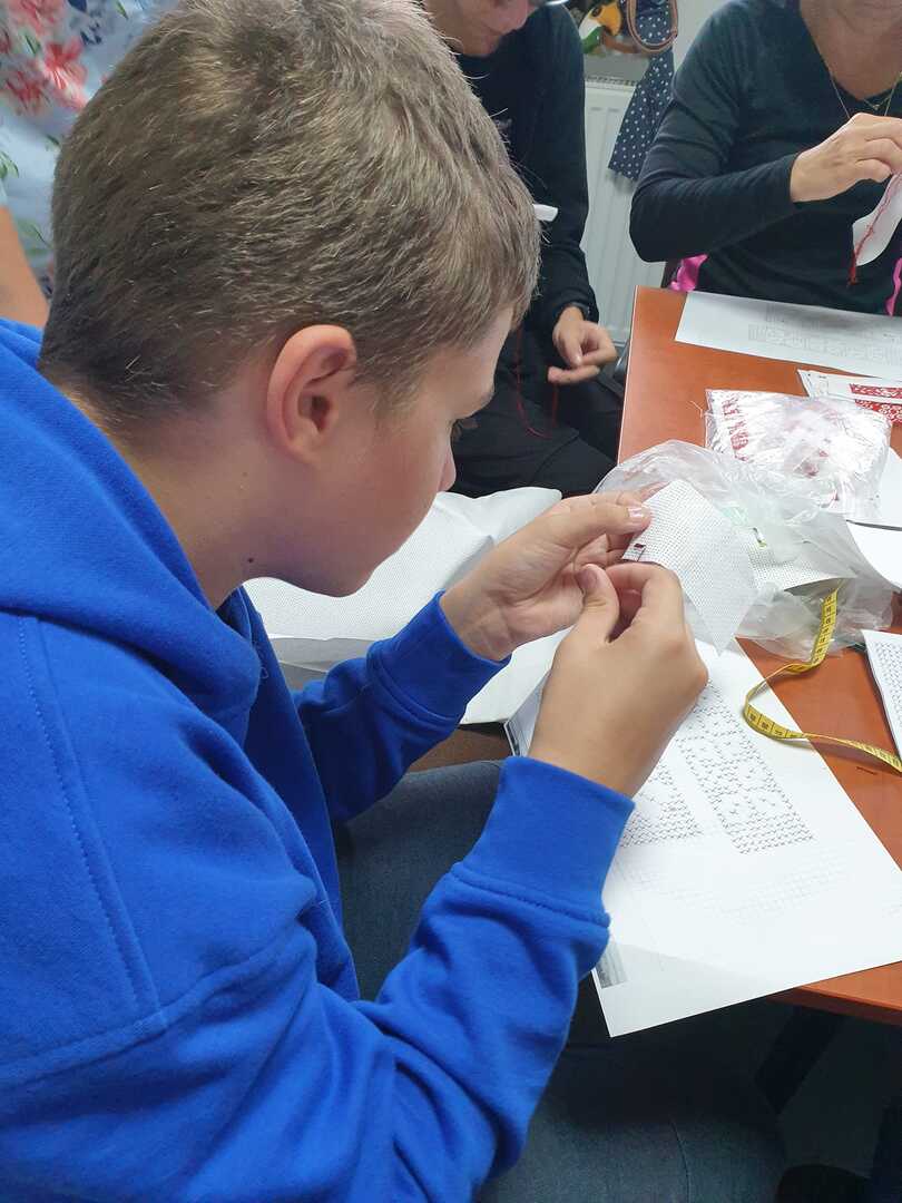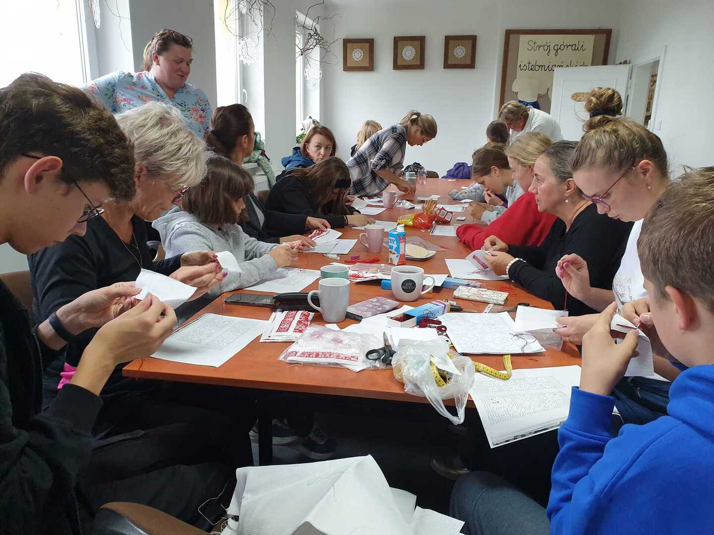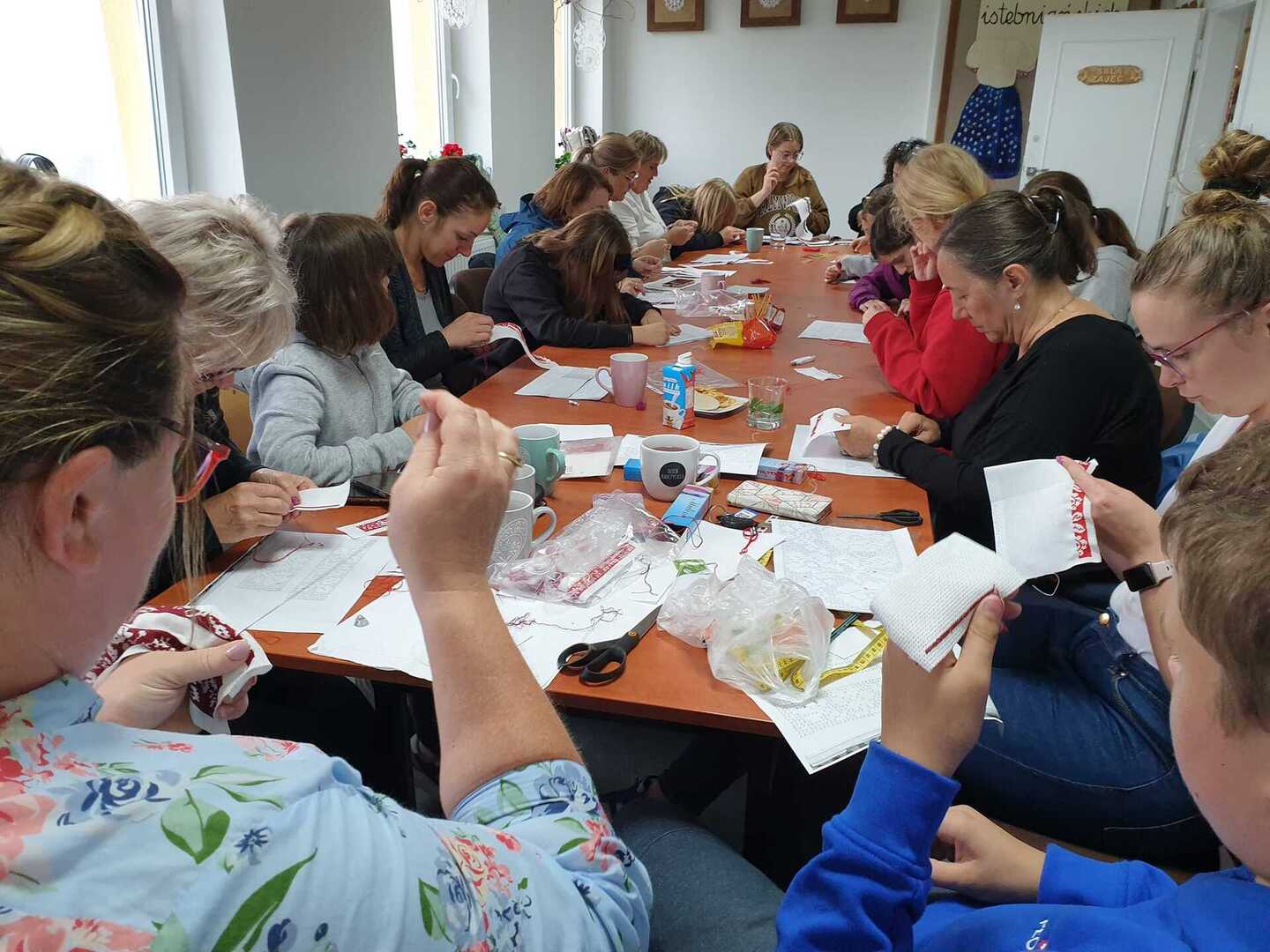 Warsztaty wyszywania obójków i lymiyczków do kabotkow ju偶 na finiszu. Na ostatnim spotkaniu odwiedzi艂a nas grupa dzieci i m艂odzie偶y z