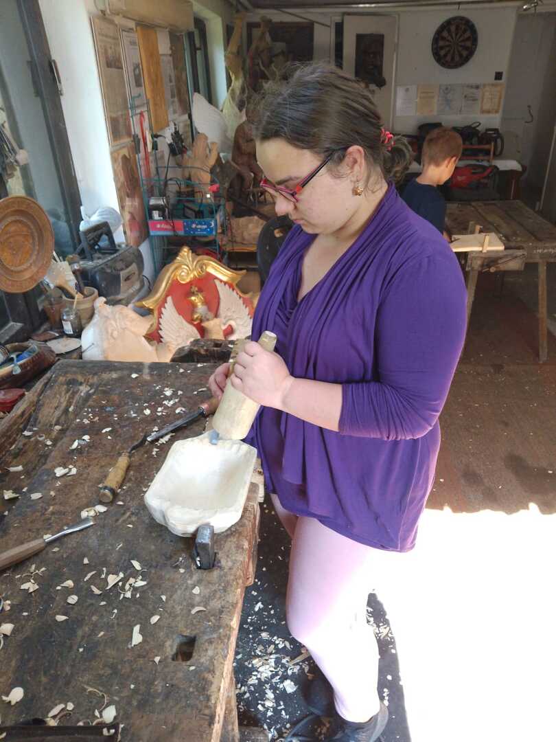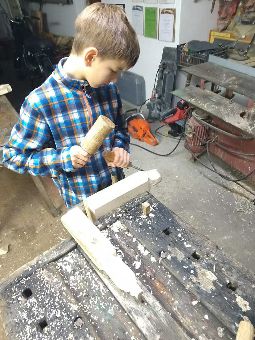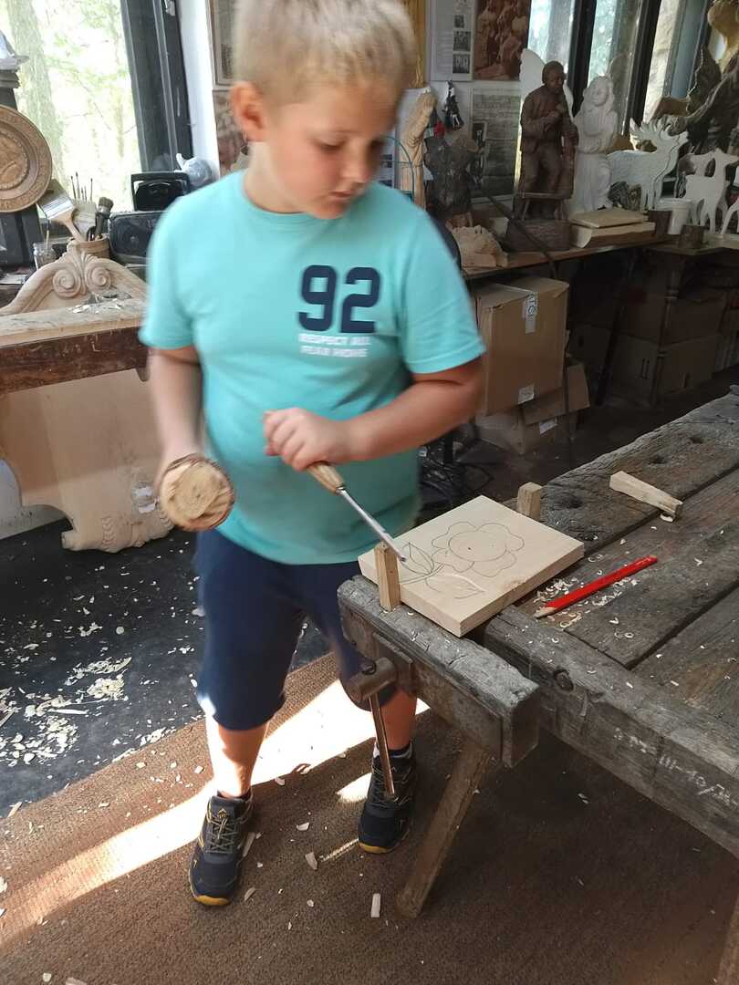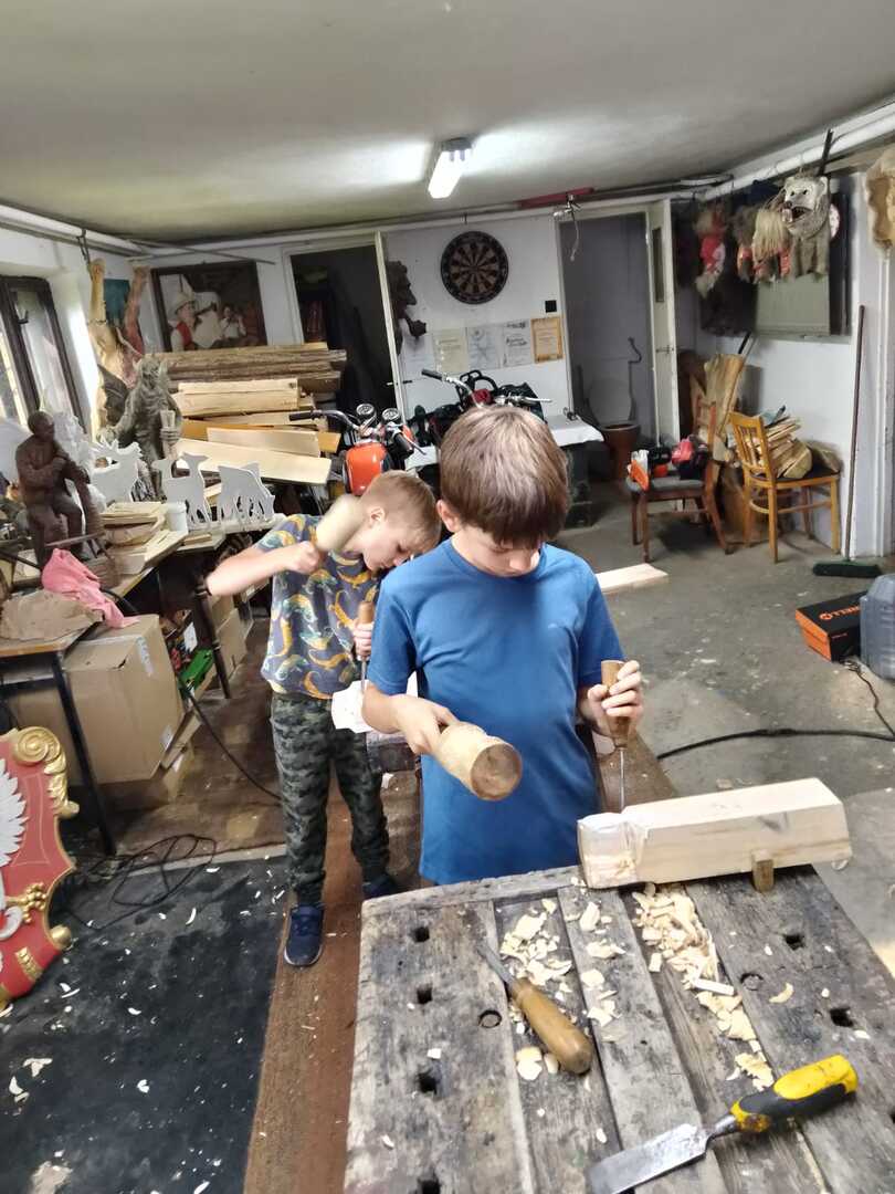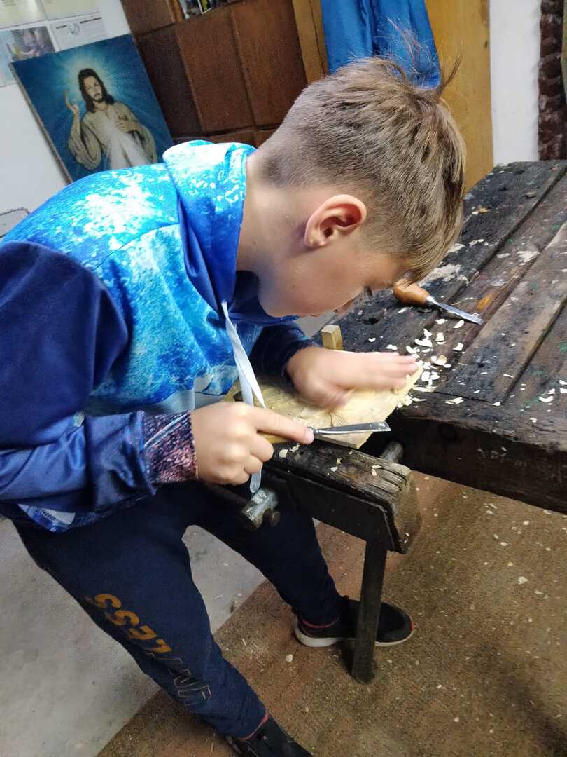 Starsza grupa naszego koła rzeźbiarskiego wykonuje drewniane regionalne misy, a młodzi adepci rzeźbiarstwa rozpoczynają swoją przygodę z tym rzemiosłem. Uczą się precyzji i kompozycji oraz ostrożności w obchodzeniu się z narzędziami. Podziwiają też prace swojego mistrza rzeźbiarstwa.