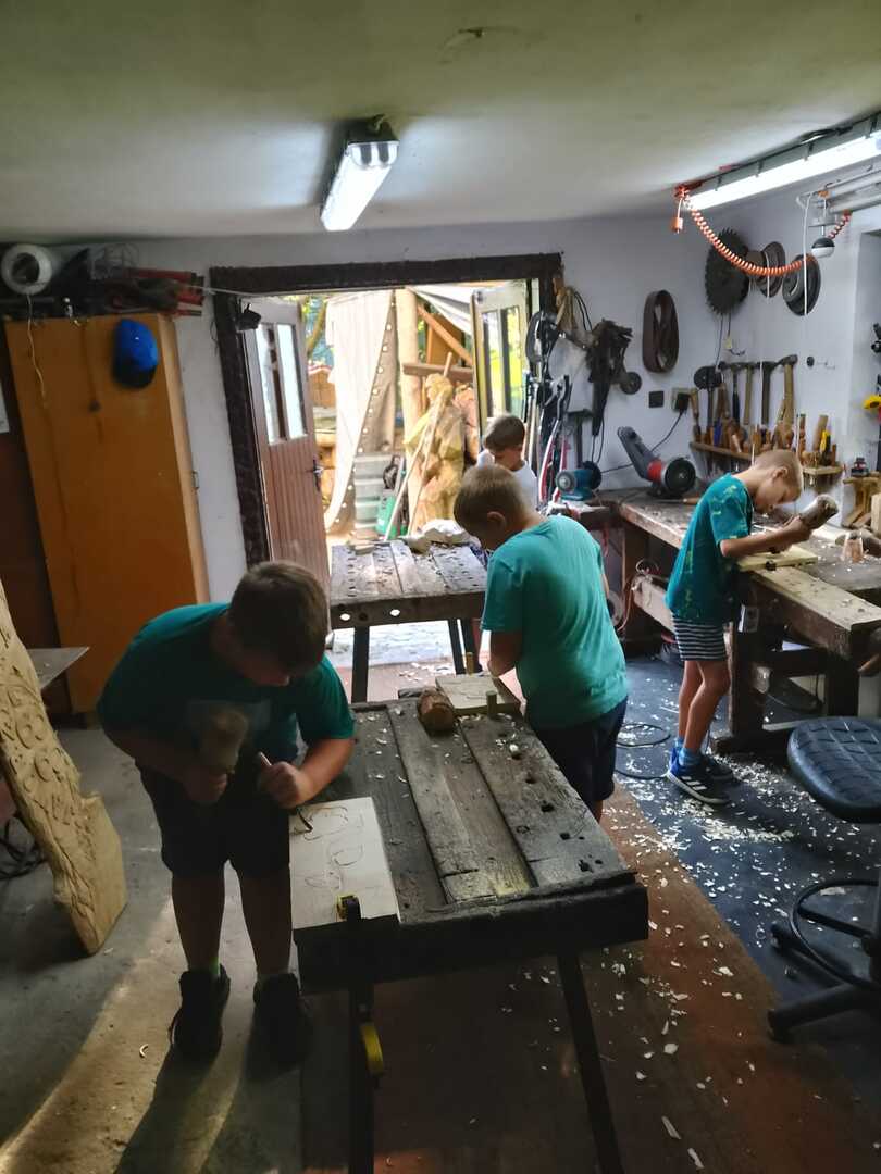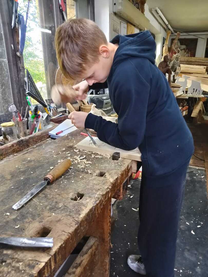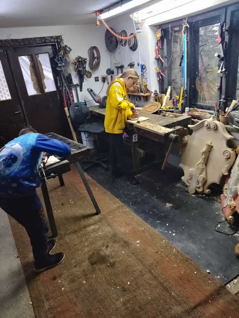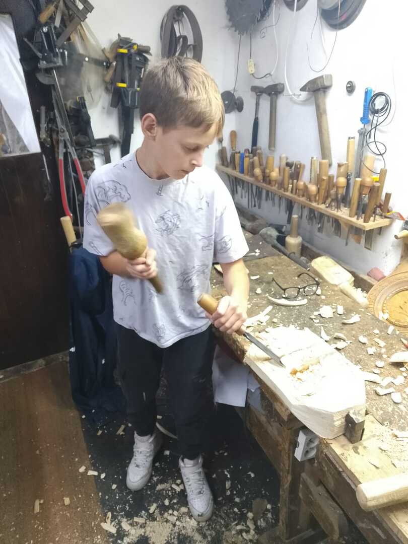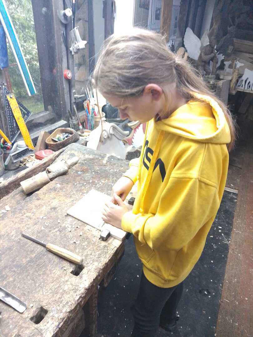 Starsza grupa naszego koła rzeźbiarskiego wykonuje drewniane regionalne misy, a młodzi adepci rzeźbiarstwa rozpoczynają swoją przygodę z tym rzemiosłem. Uczą się precyzji i kompozycji oraz ostrożności w obchodzeniu się z narzędziami. Podziwiają też prace swojego mistrza rzeźbiarstwa.