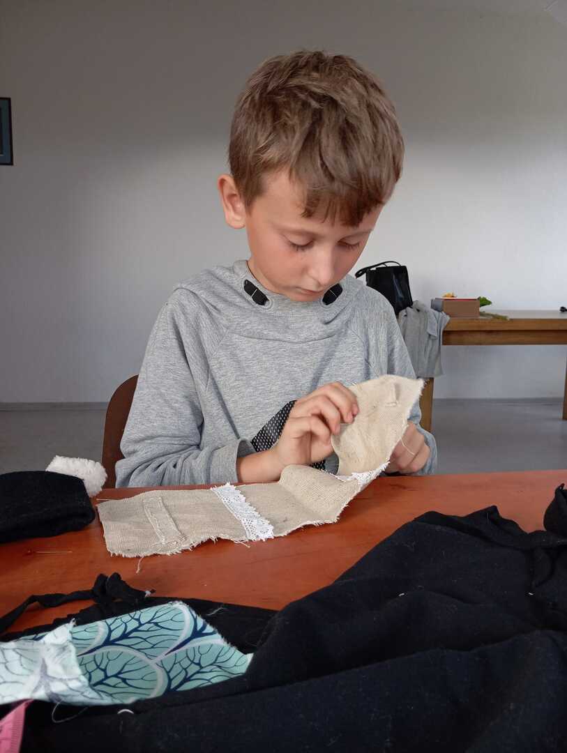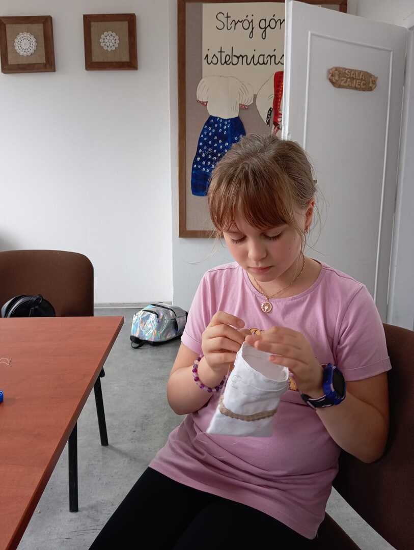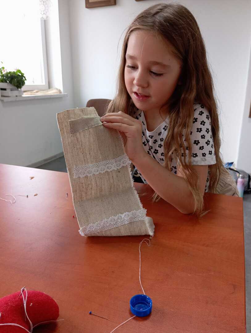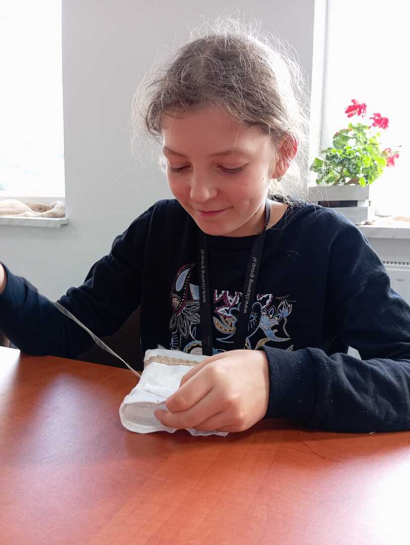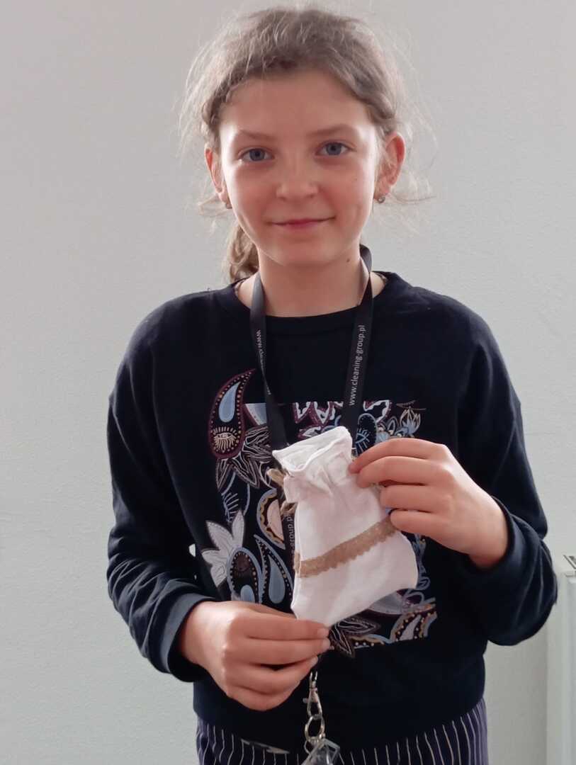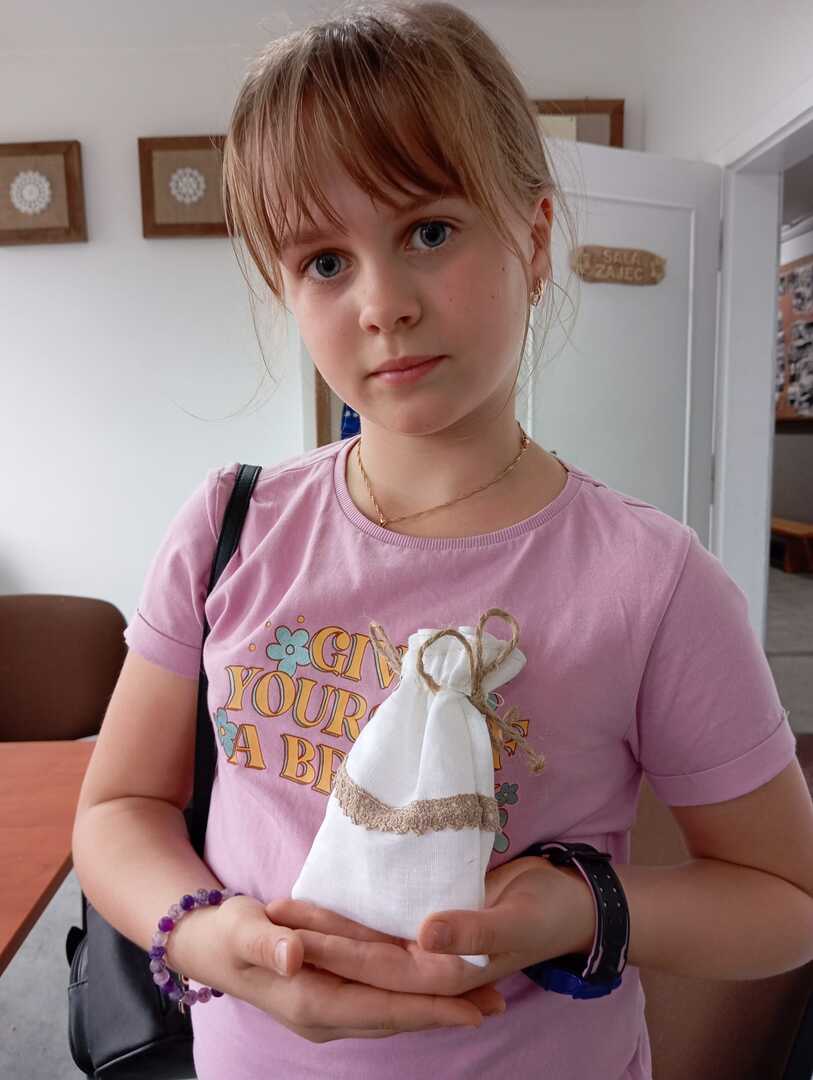 Dzieciom udało się wykonać woreczki z tkaniny z ozdobną tasiemką. Teraz wystarczy je tylko wypełnić mieszanką ziół, lawendą lub herbacianym suszem z dodatkiem olejków eterycznych i w ten sposób uzyskamy naturalne saszetki zapachowe, które odświeżą naszą szafę, a nawet odstraszą mole.