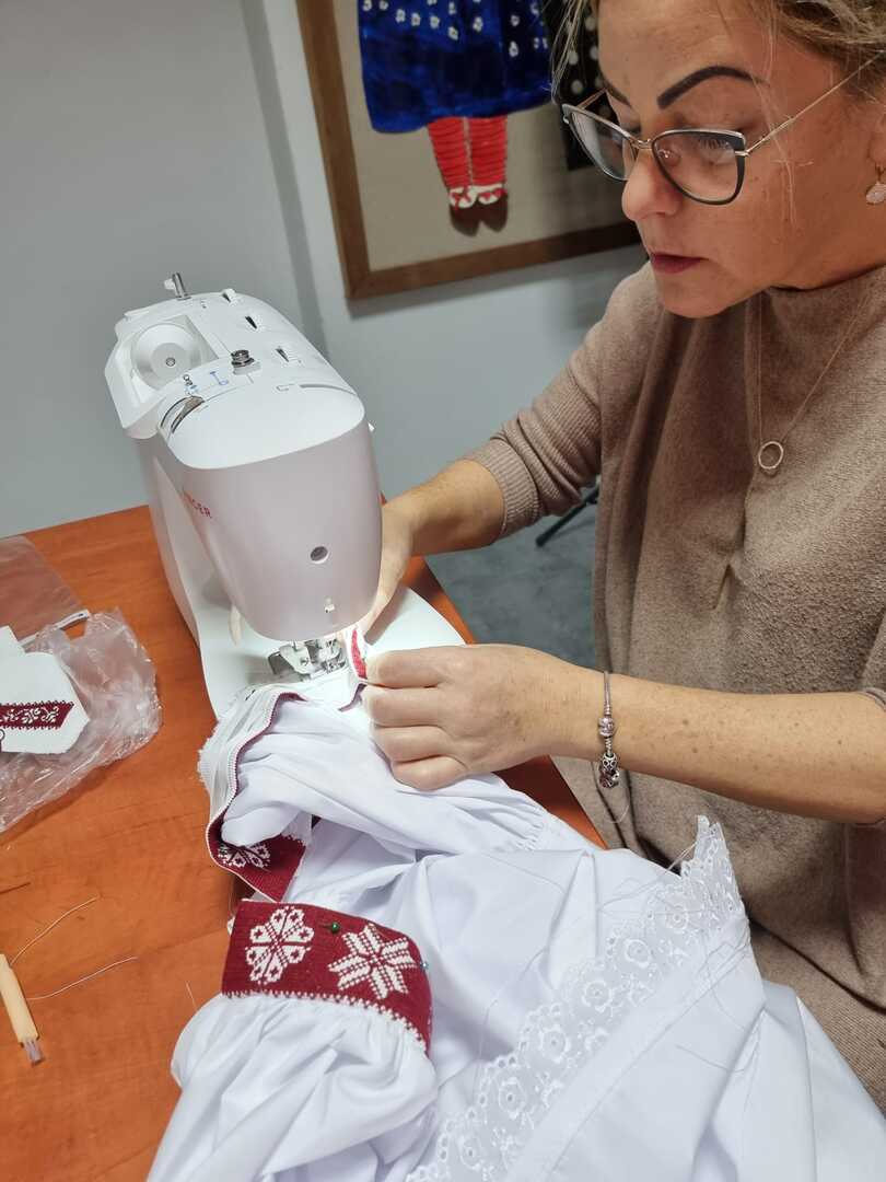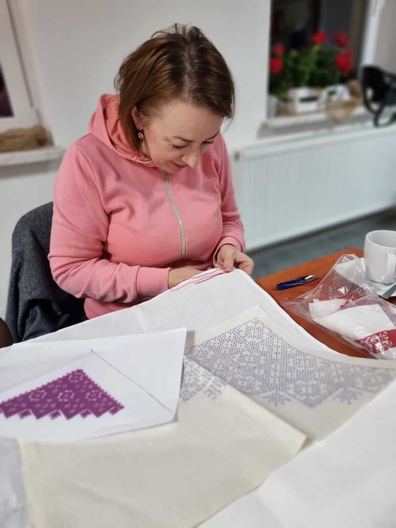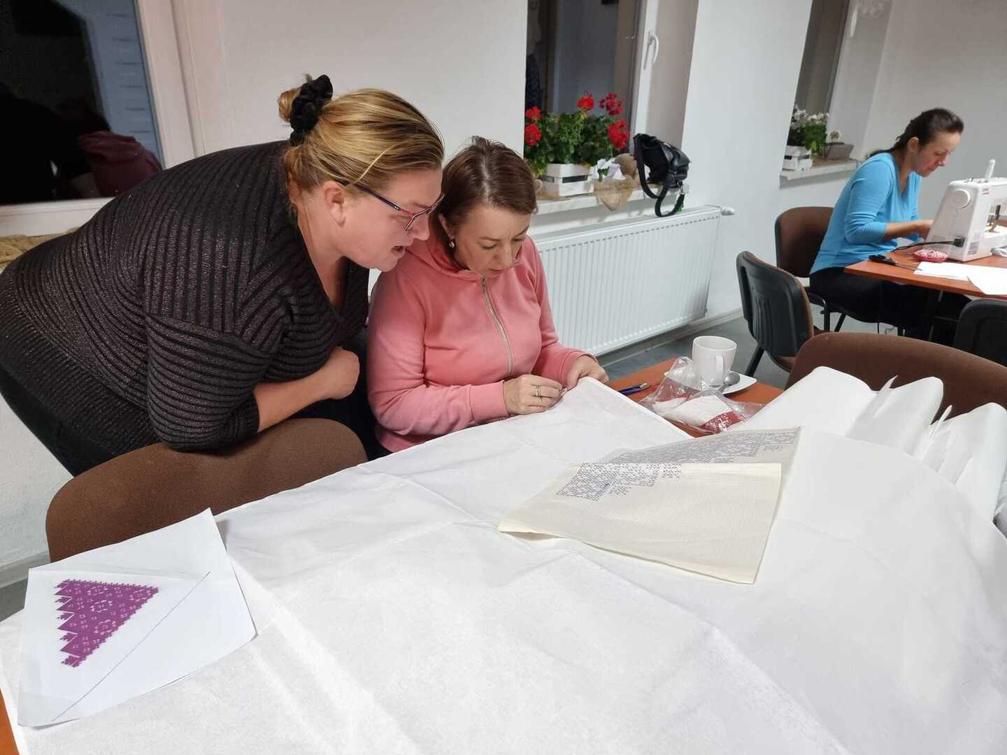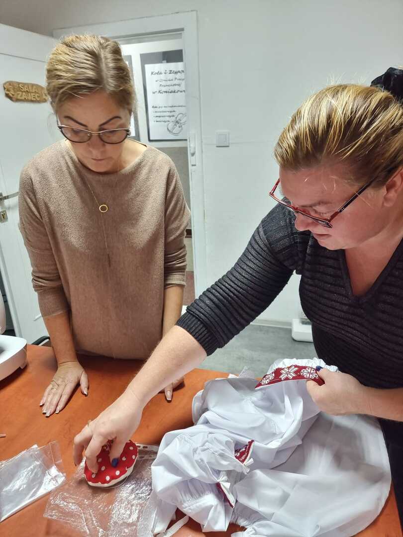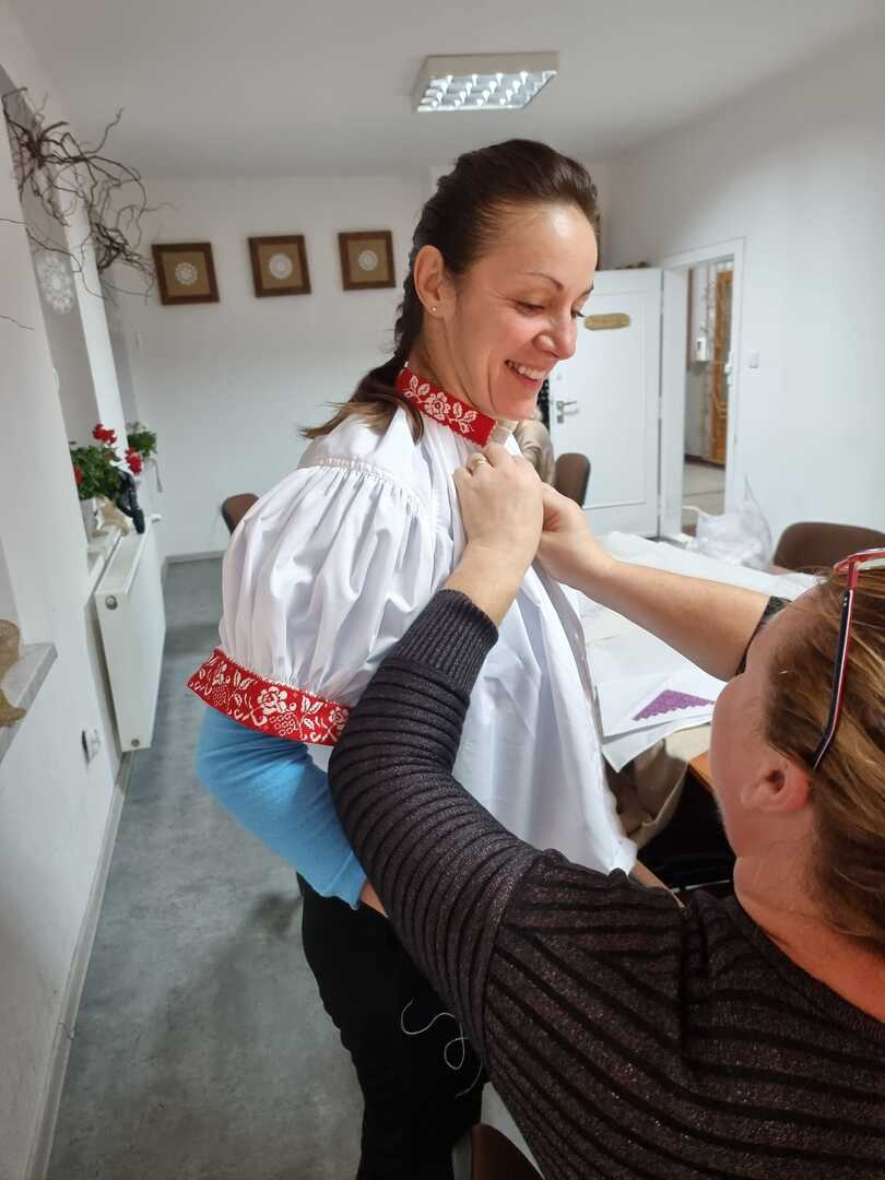 Podczas wczorajszych zajęć, pod okiem Katarzyny Suszka uczestniczki kontynuowały naukę szycia kabotków i wyszywania chust czepinowych. Widać piękne efekty długich godzin spędzonych nad wyszyciami. To prawie gotowe, nowe elementy stroju regionalnego, nad których powstaniem wytrwale pracujemy od maja.