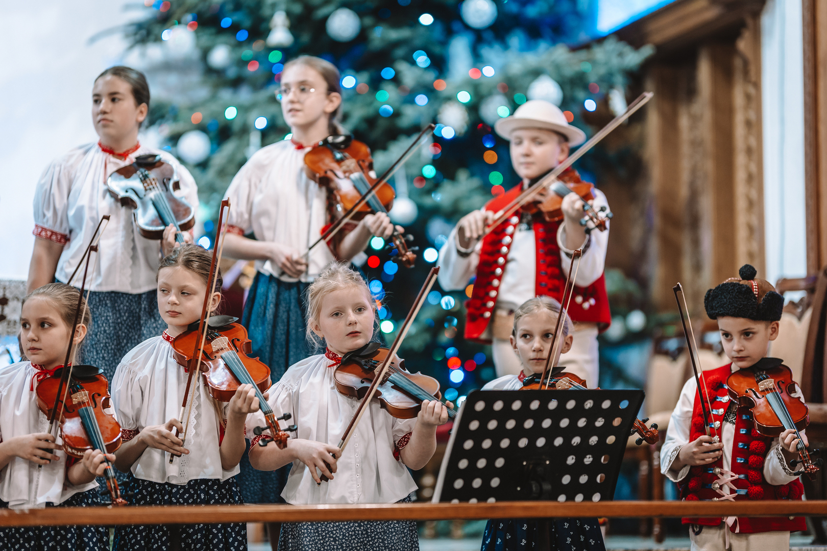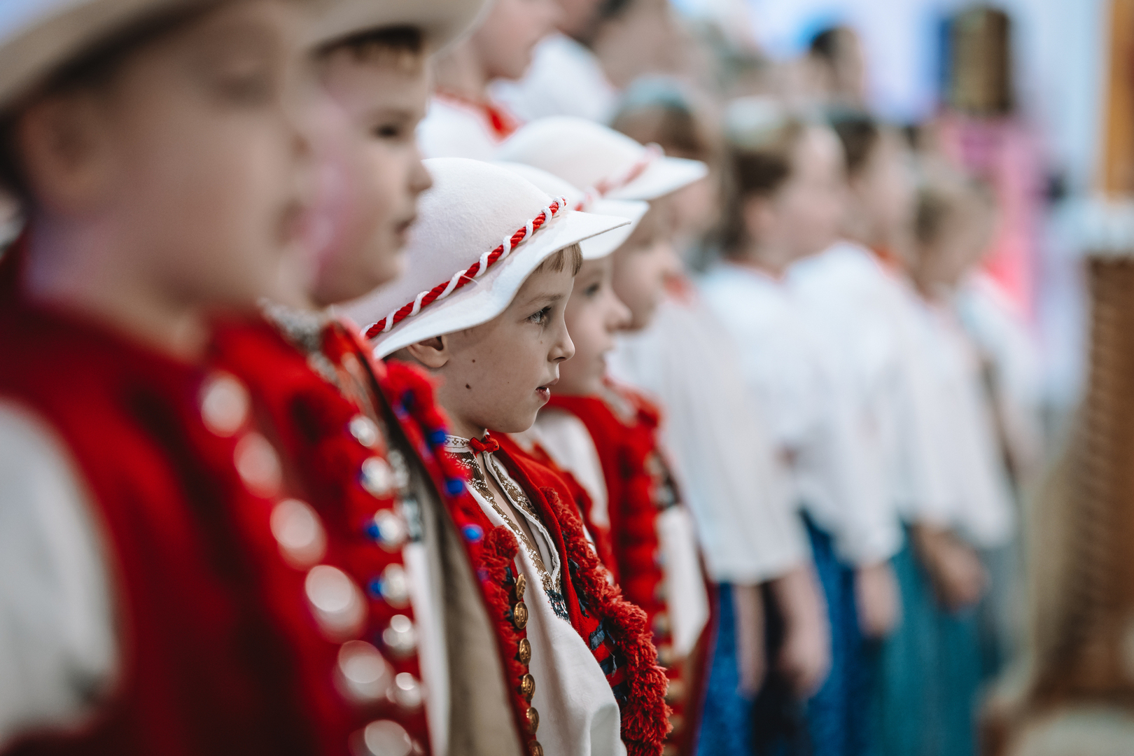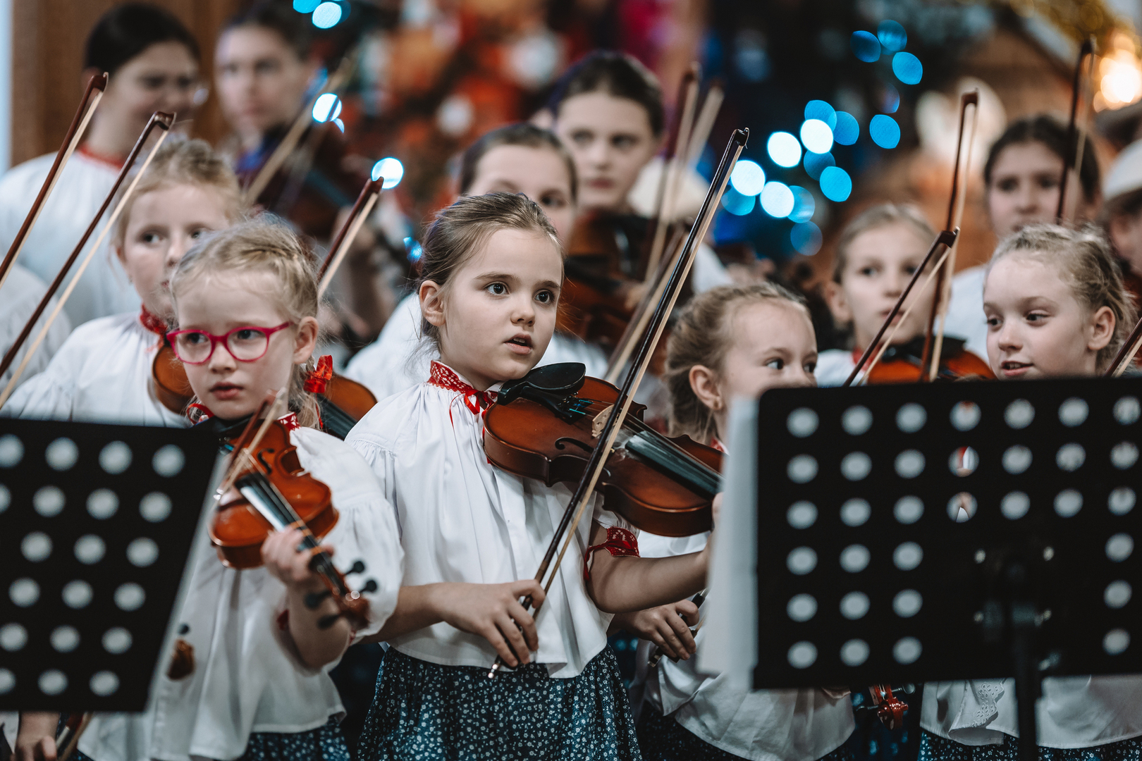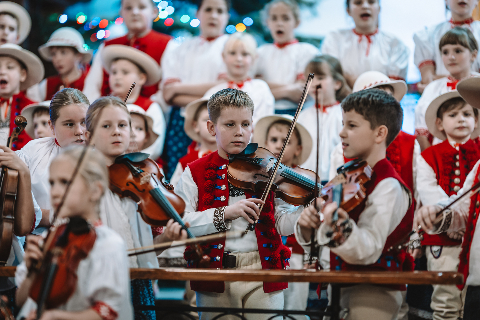 Dzieci z koła gry na instrumentach ludowych prowadzonego przez Antoniego Suszkę oraz uczniowie Karola Wiercigrocha