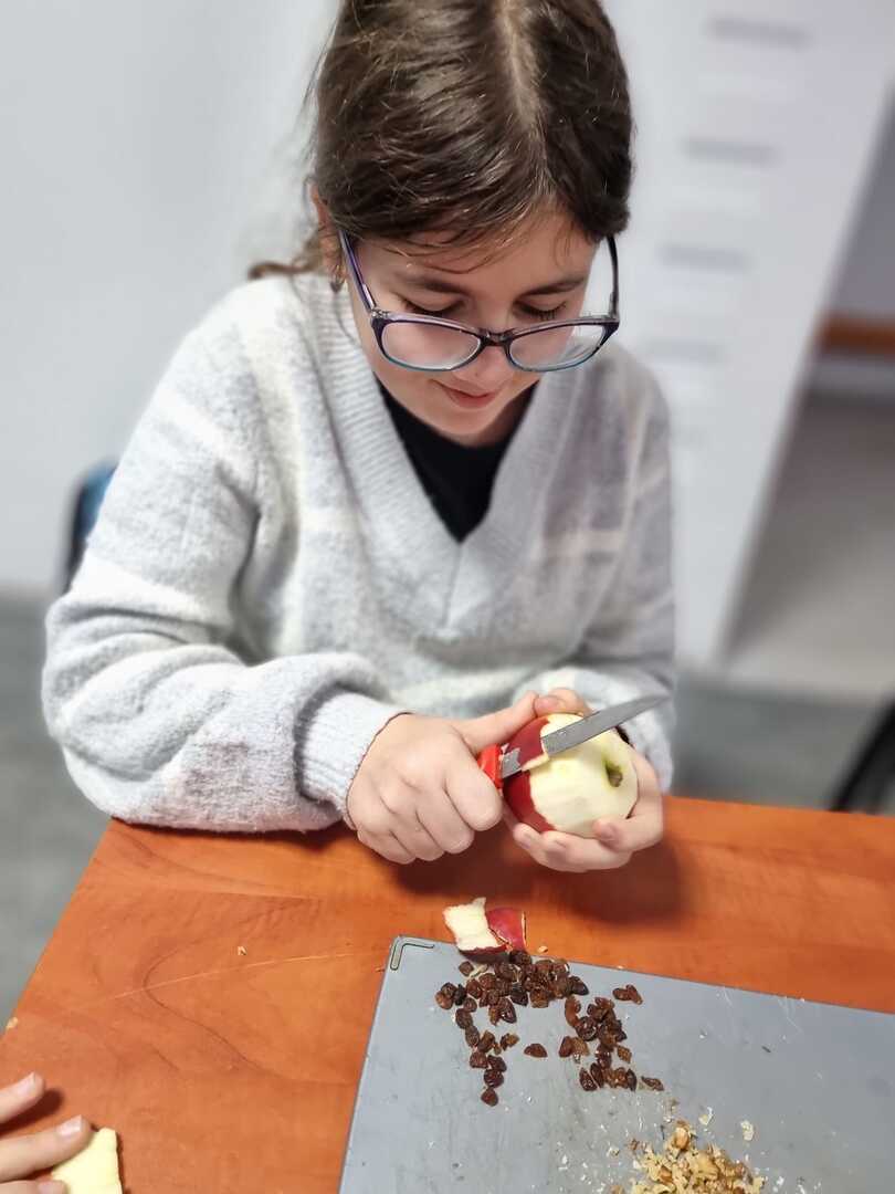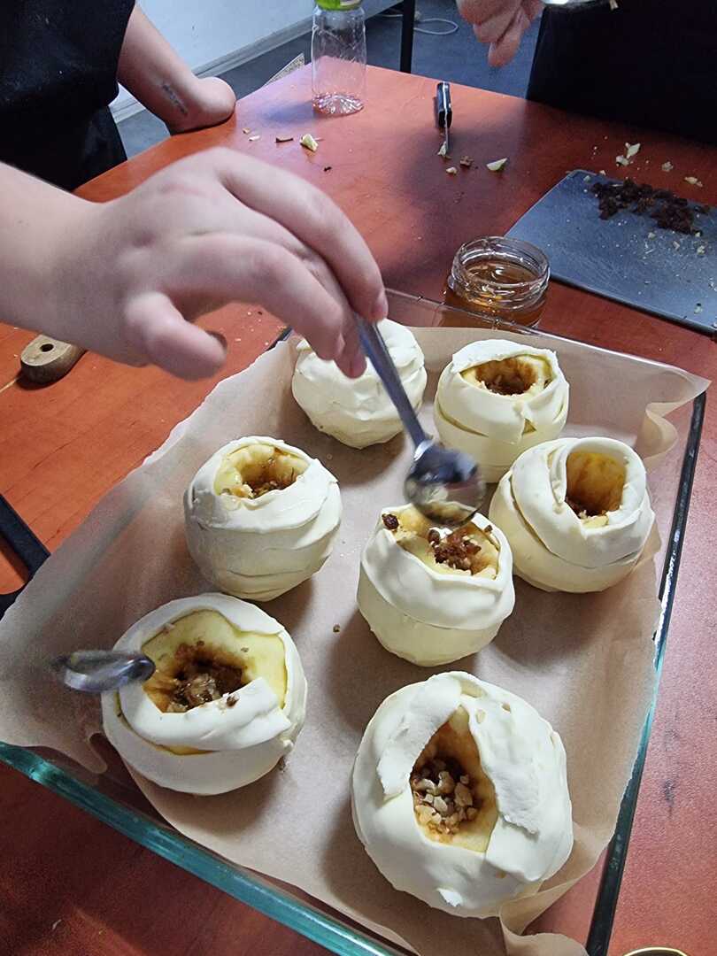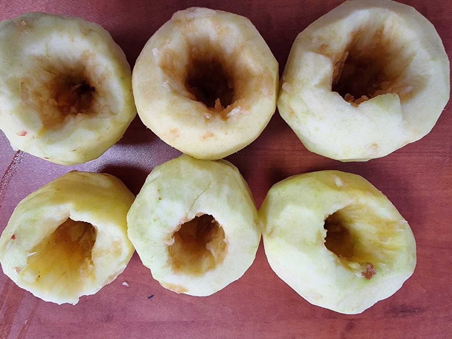 Najpierw obraliśmy i wydrążyliśmy jabłka, potem wypełniliśmy je nadzieniem z bakalii i miodu z dodatkiem cynamonu.