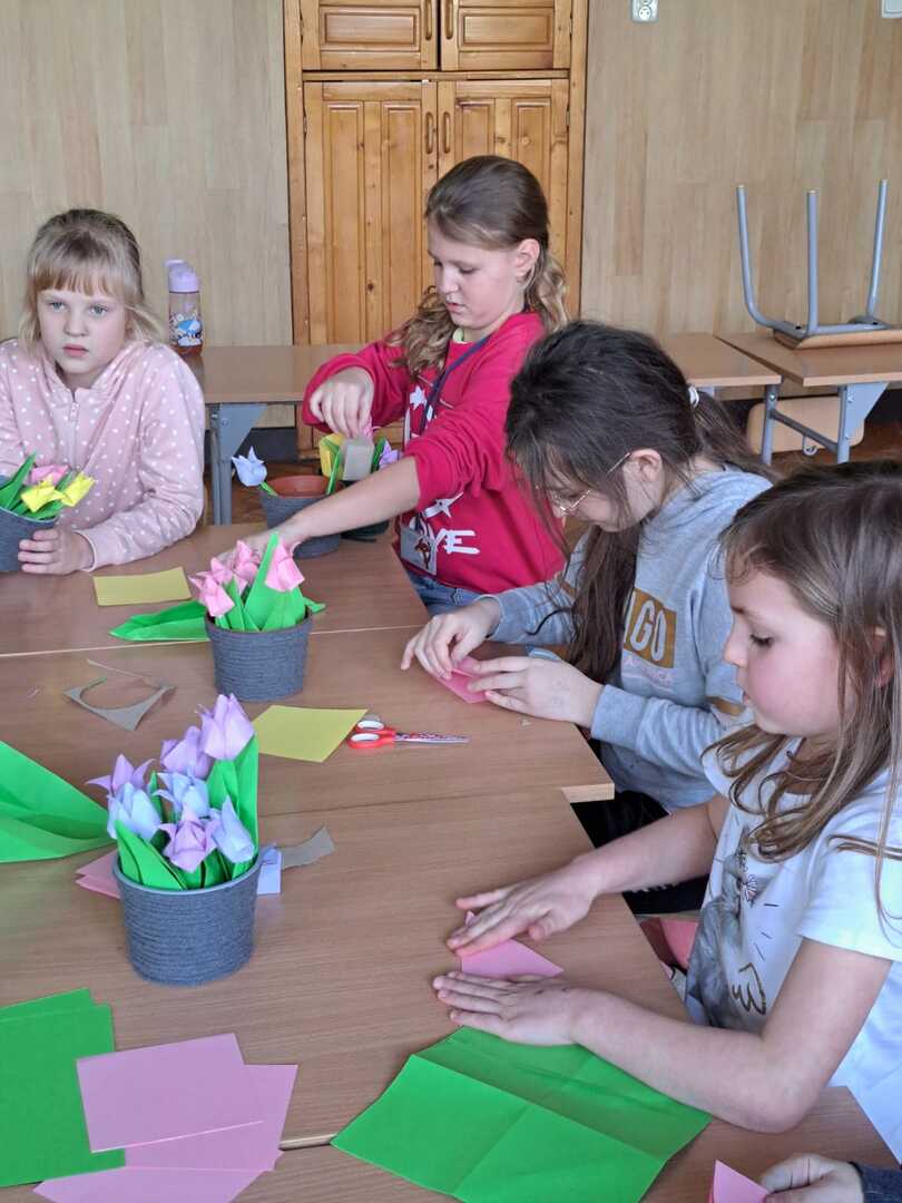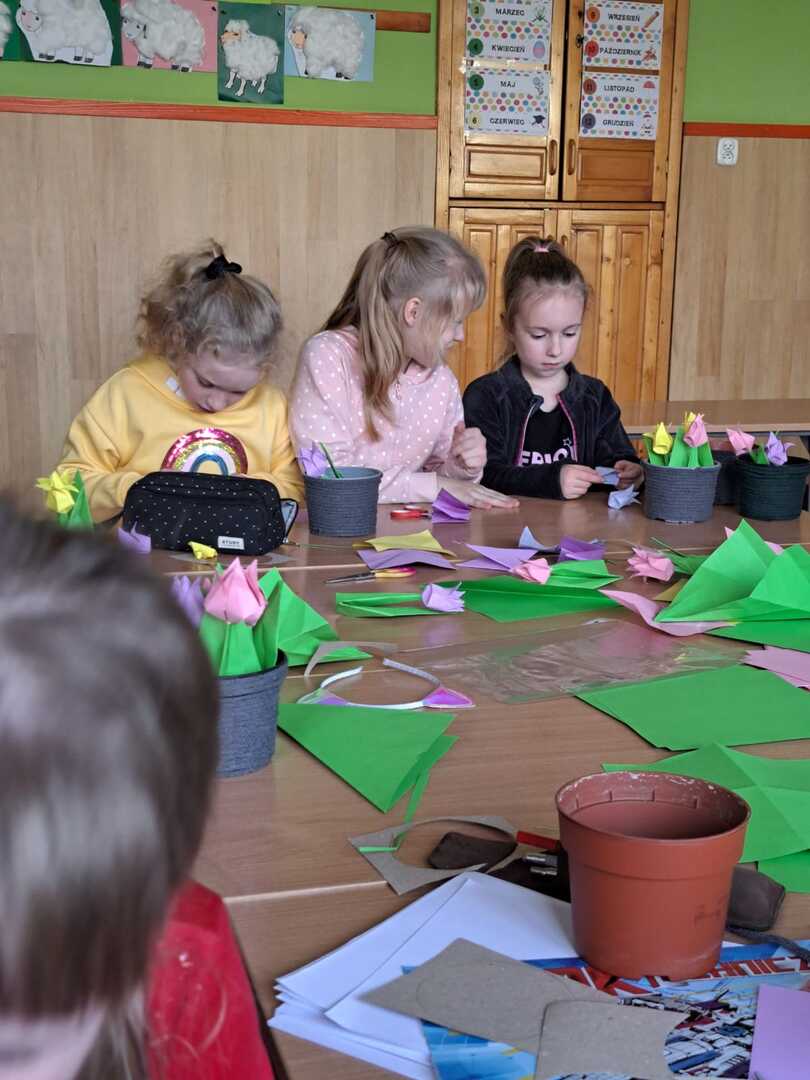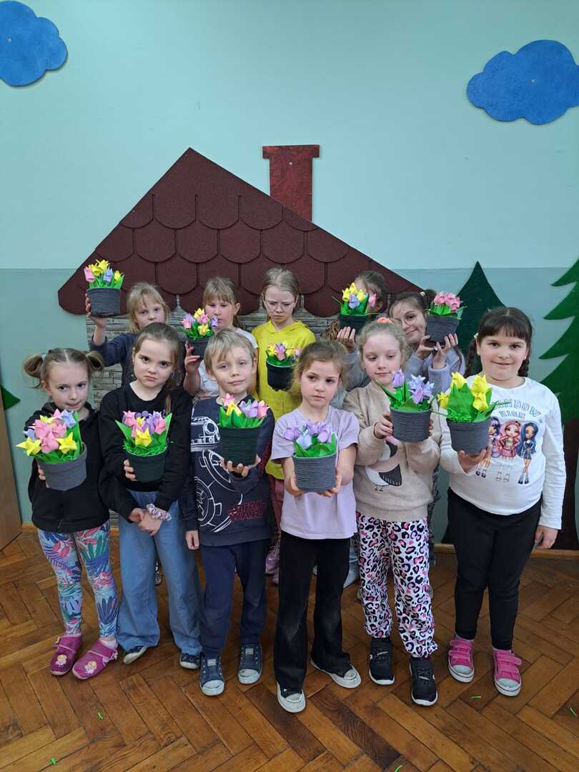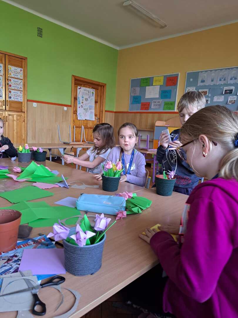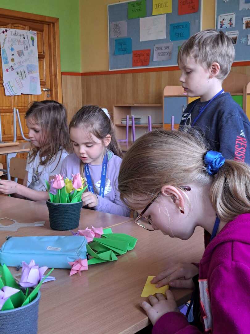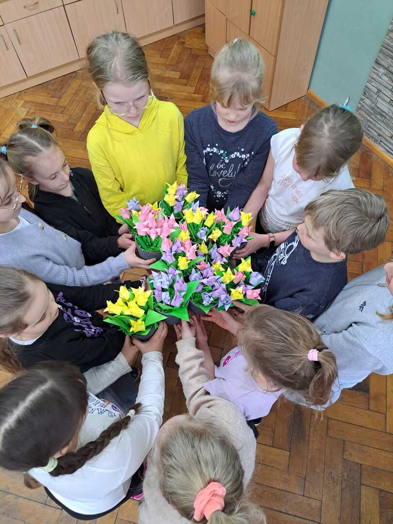 Dzieci z ogromn膮 precyzj膮, cierpliwo艣ci膮 i dok艂adno艣ci膮 wykonywa艂y ka偶d膮 g艂ówk臋 i ka偶d膮 艂ody偶k臋 tego pi臋knego wiosennego kwiatka.