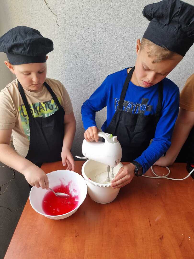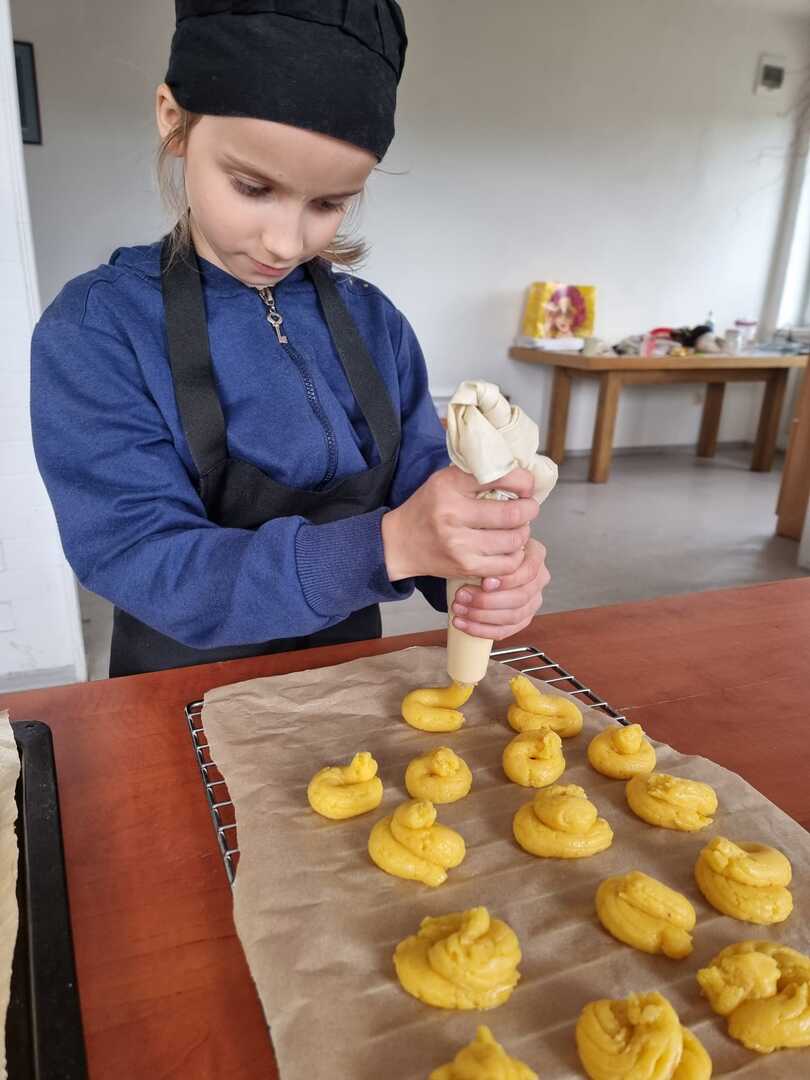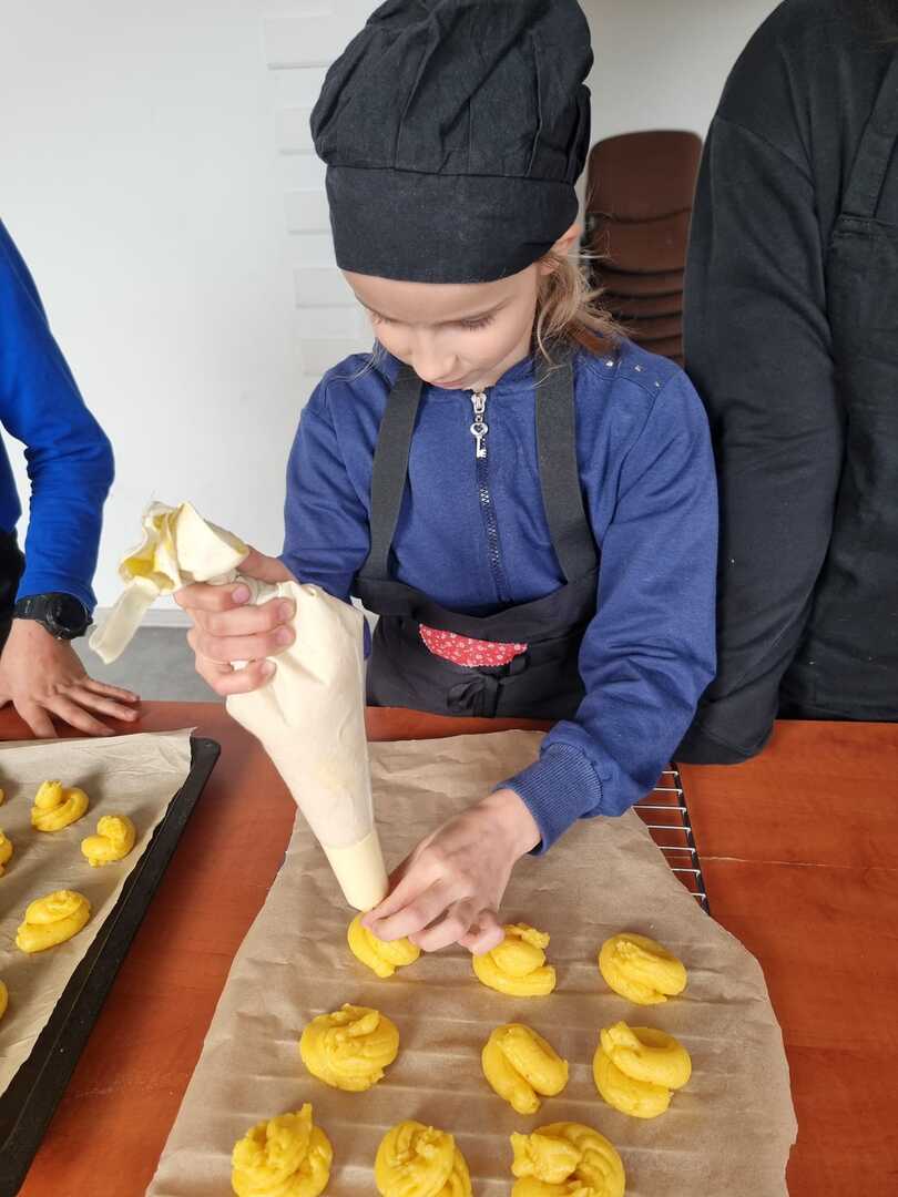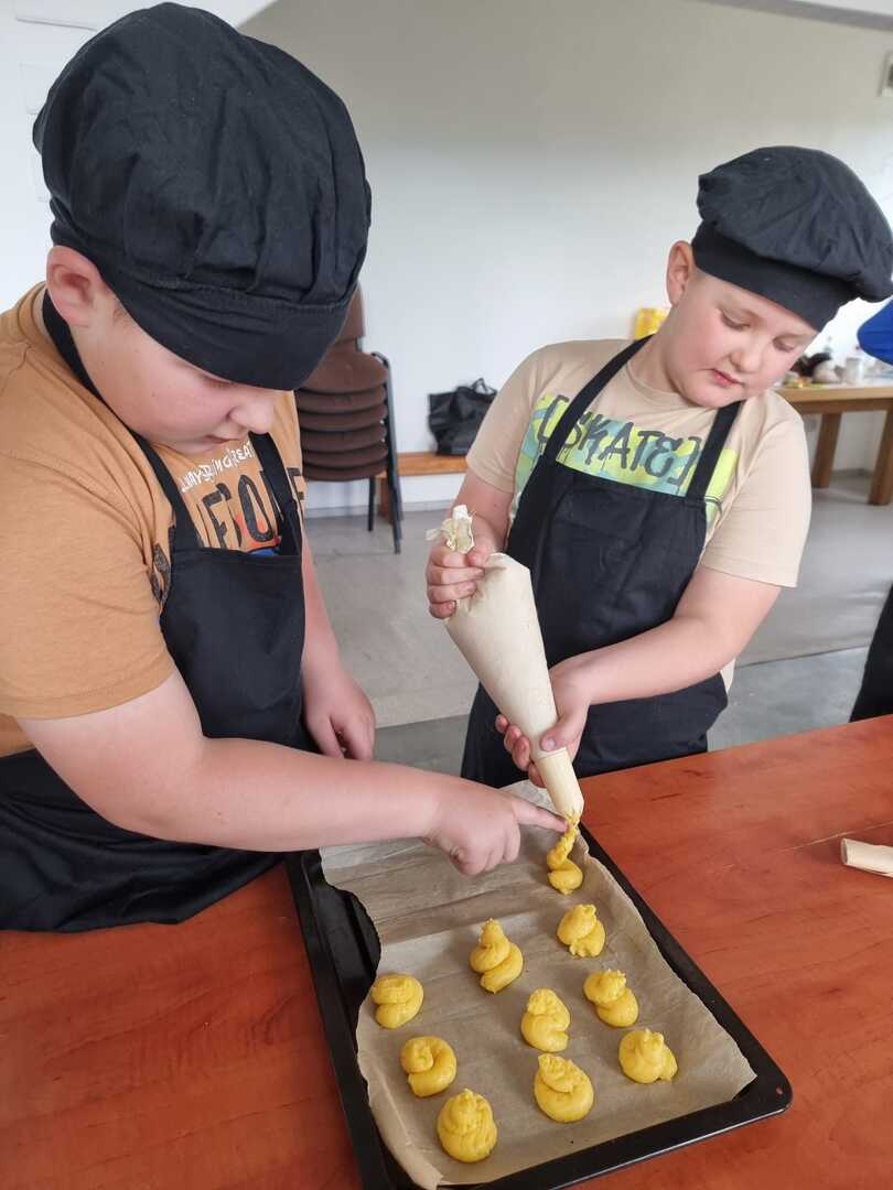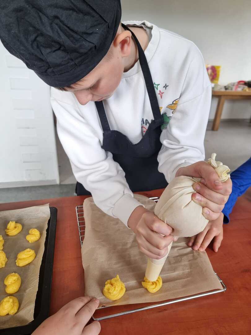 Mali cukiernicy pod kierunkiem prowadzącej pani Ewy Macoszek-Dragon przygotowali najpierw ciasto parzone, które następnie wyciskali przez szpryckę i piekli na złoty kolor. Inni przygotowywali puszysty krem, który dzięki owocowej galaretce zyskał różowy kolor i malinowy posmak.