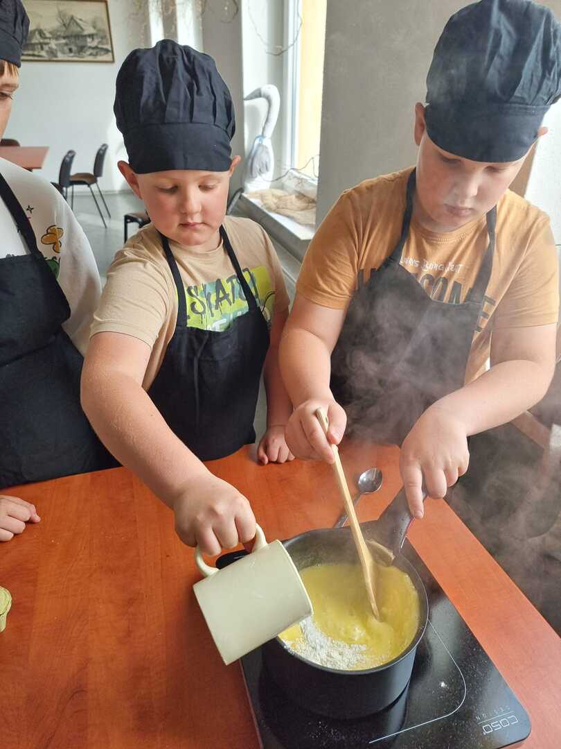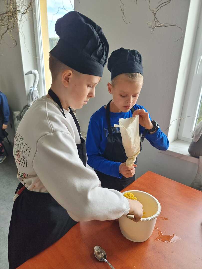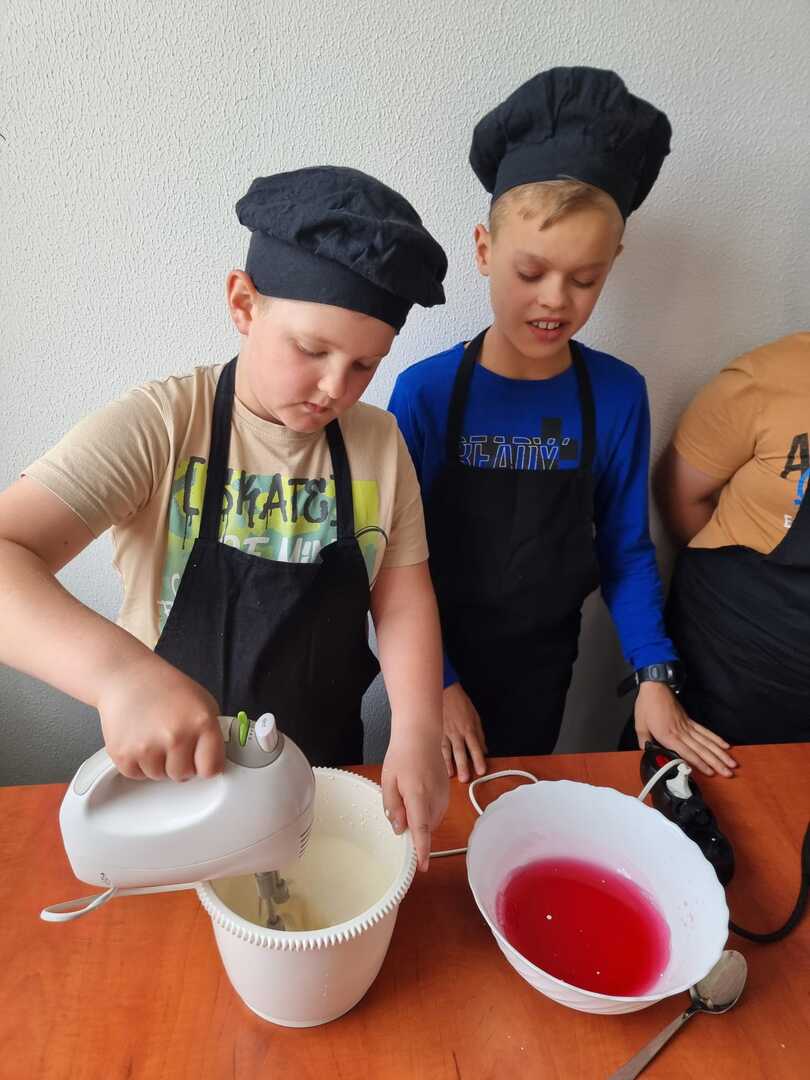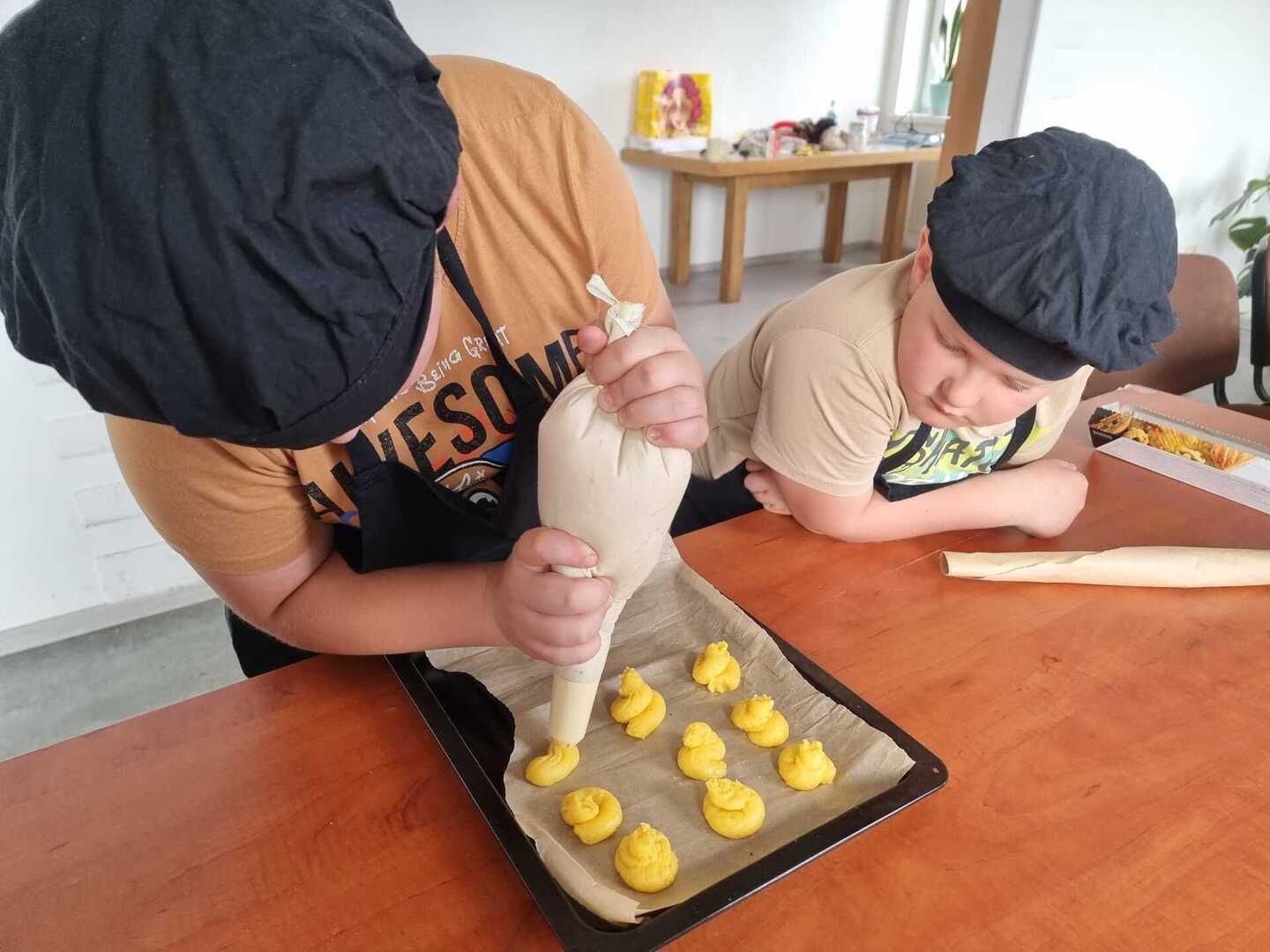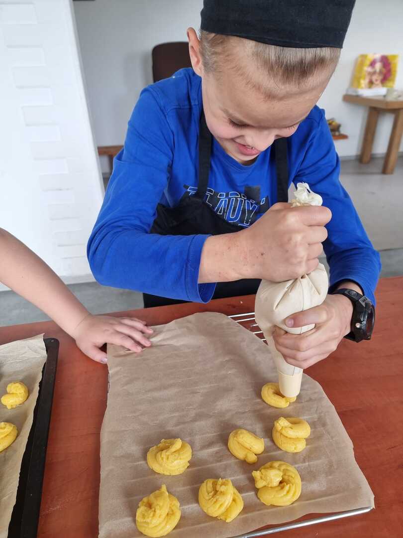 Mali cukiernicy pod kierunkiem prowadzącej pani Ewy Macoszek-Dragon przygotowali najpierw ciasto parzone, które następnie wyciskali przez szpryckę i piekli na złoty kolor. Inni przygotowywali puszysty krem, który dzięki owocowej galaretce zyskał różowy kolor i malinowy posmak.